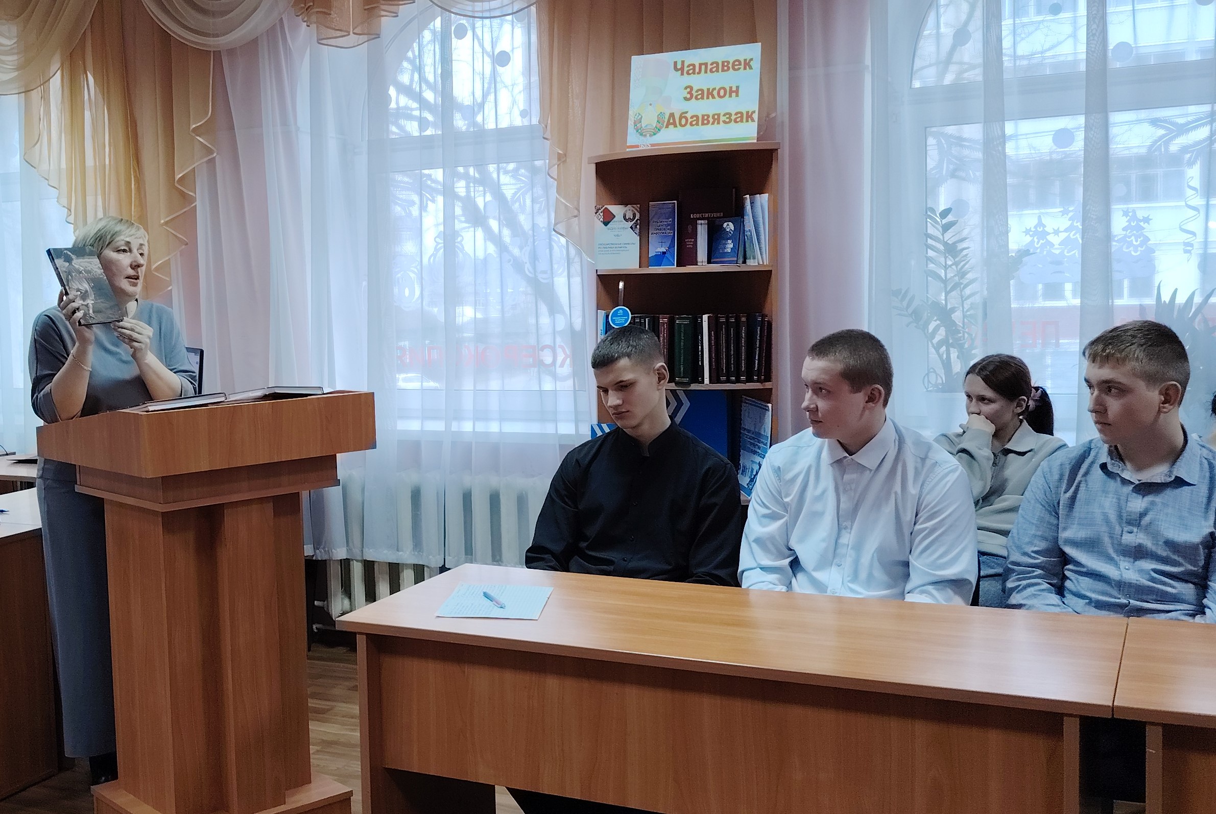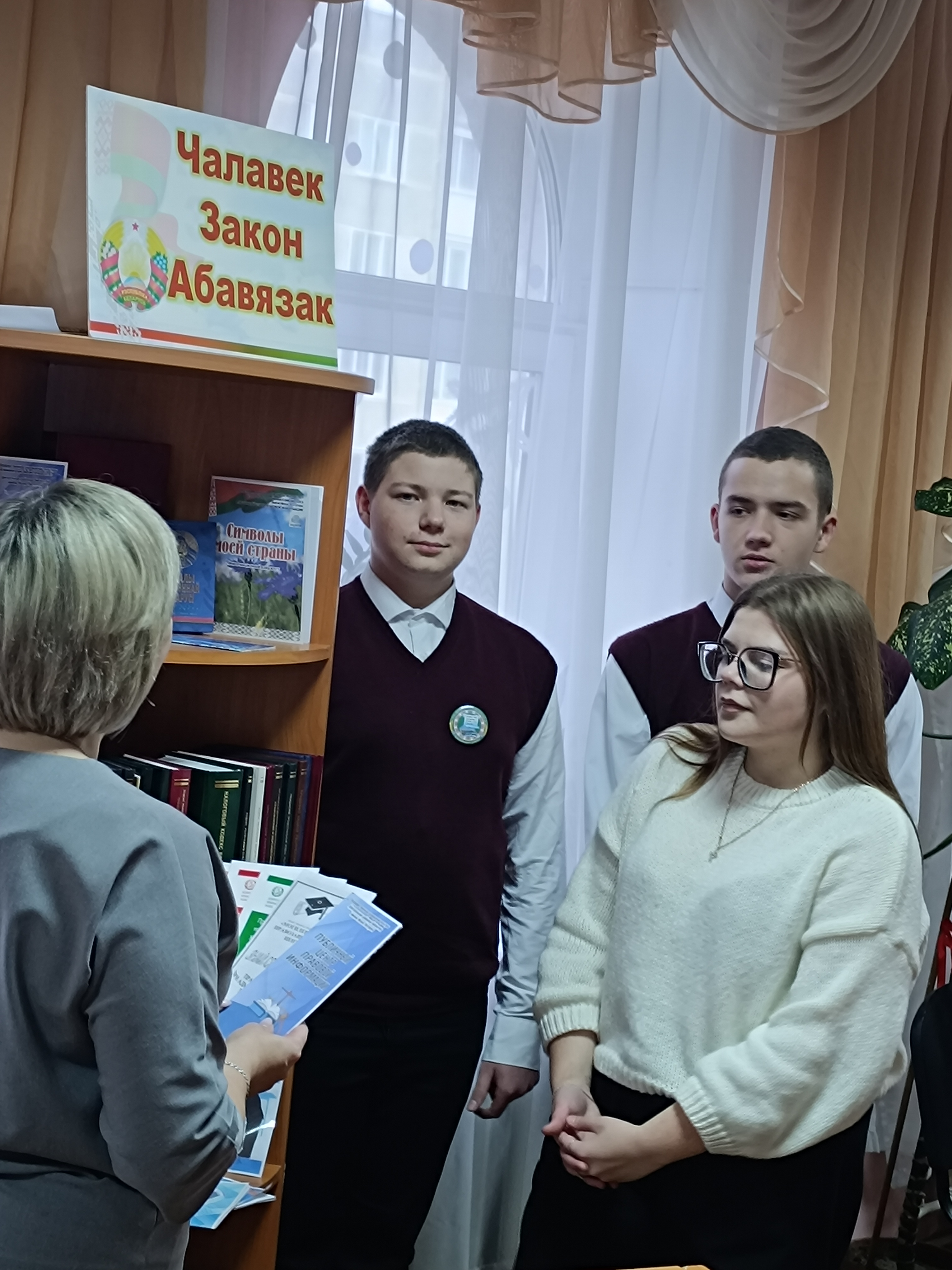 Библиотекарь обратила внимание ребят на тематическую выставку «Чалавек. Закон. Абавязак», познакомила с деятельностью национального центра законодательства и публичной информации, рассказала об информационно-поисковой системе «Эталон-онлайн». Всем участникам были вручены «Памятка для учащихся о правах и обязанностях».