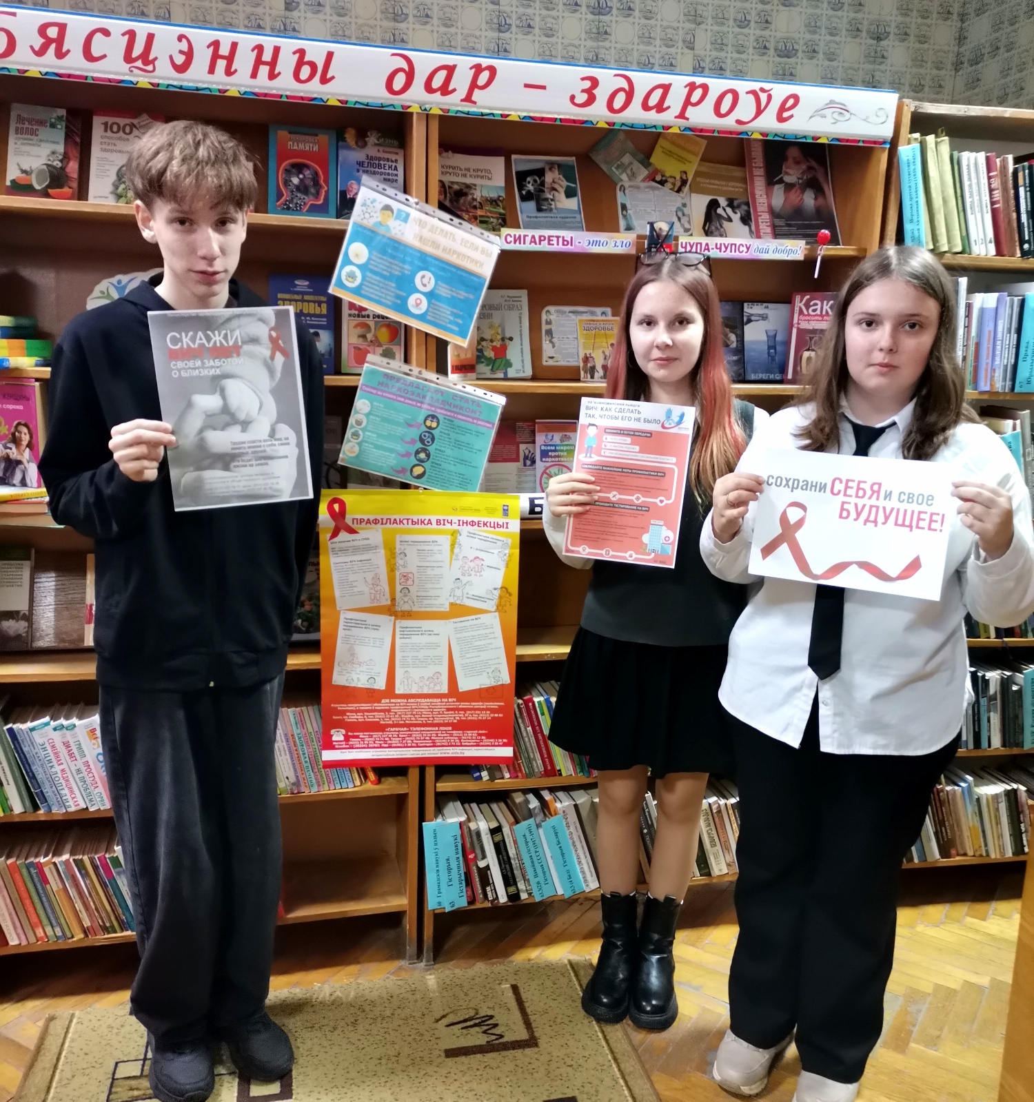 В библиотеке агрогородка Тимоново в рамках программы «Тимоново - здоровый агрогородок» прошел профилактический информ-день «СПИД. Знать, чтобы жить». Библиотекарь Светлана Пролыгина рассказала детям о проблемах СПИДа, проинформировала о путях передачи ВИЧ-инфекции, а также о том, как защитить себя и своих близких от этой болезни. Учащиеся узнали, что ленточка цвета крови, свёрнутая петелькой, является Международным символом борьбы со СПИДом – символом нашего сострадания, поддержки и надежды на будущее, и познакомились с тематическими материалами, представленными на выставке «Бясцэнны дар – здароўе».