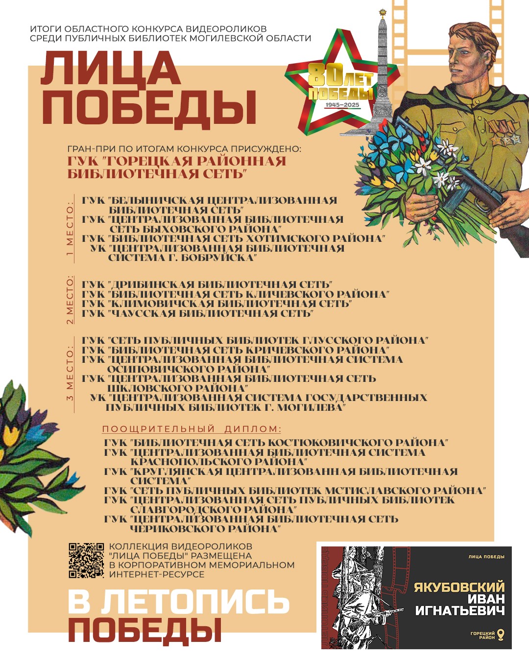 В период с 01.02.2025 по 01.12.2025 учреждение культуры «Могилевская областная библиотека им. В.И. Ленина» проводило областной конкурс видеороликов «Лица Победы» среди публичных библиотек Могилевской области.
