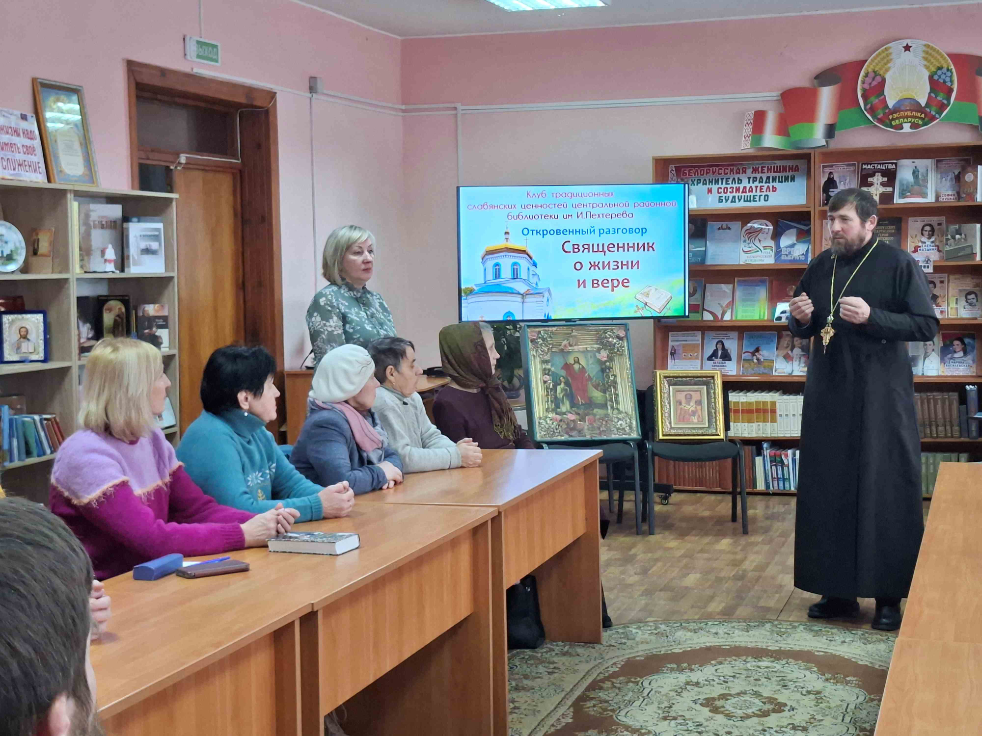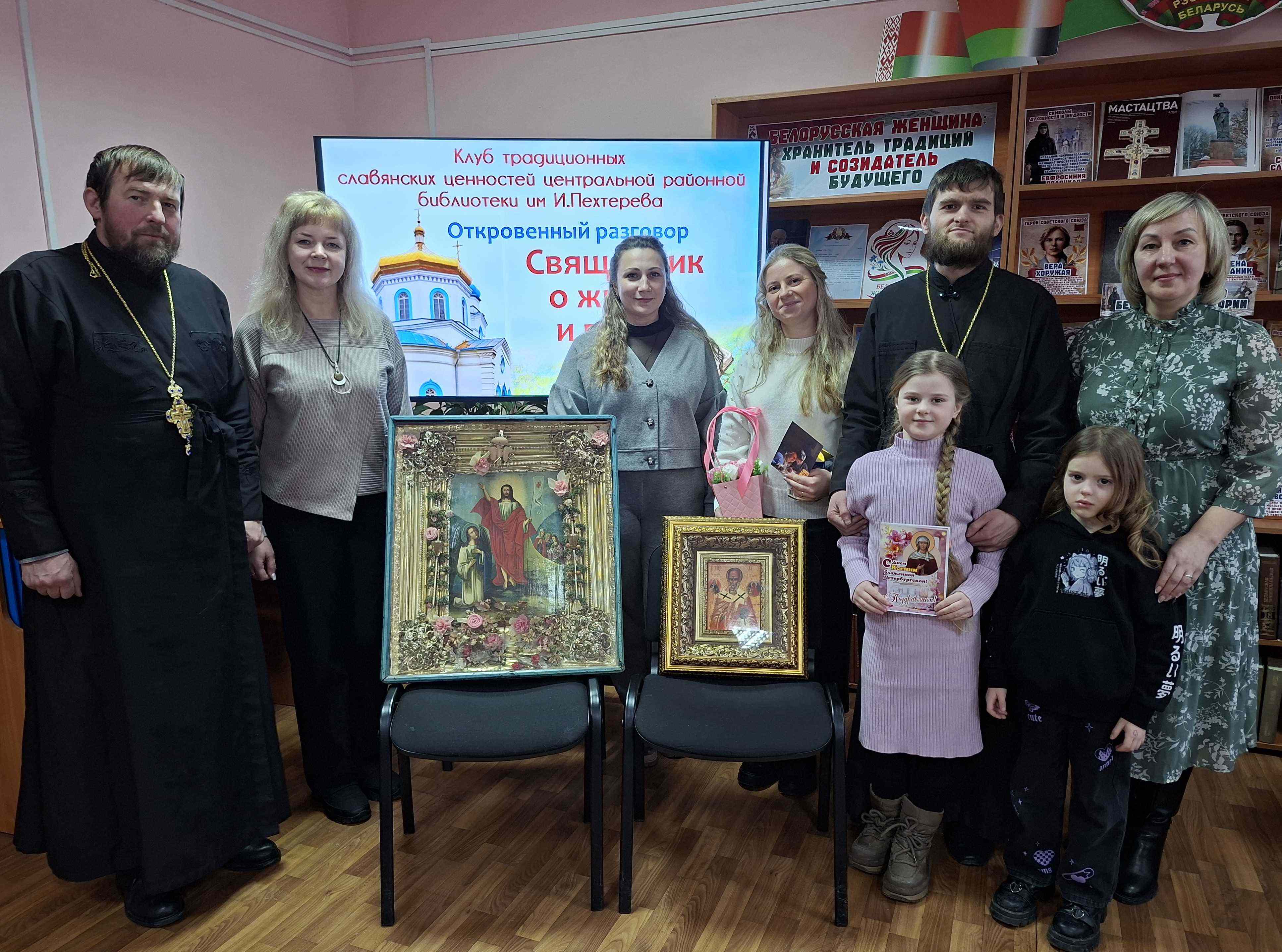 5 февраля в центральной библиотеке состоялась очередное заседание Клуба традиционных славянских ценностей, почетными гостями на котором стали настоятель храма Святого Архангела Михаила г. Климовичи отец Николай Вечорко и клирик Спасо-Преображенского Собора г. Могилева отец Андрей с матушкой Ксенией (Шаварины). С членами православного клуба, прихожанами городского храма и ветеранами педагогического труда у них состоялся откровенный разговор на тему «Священник о жизни и вере».