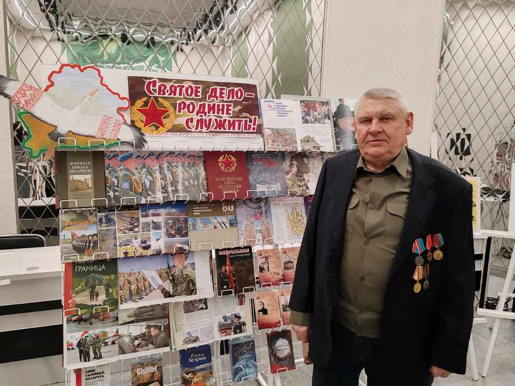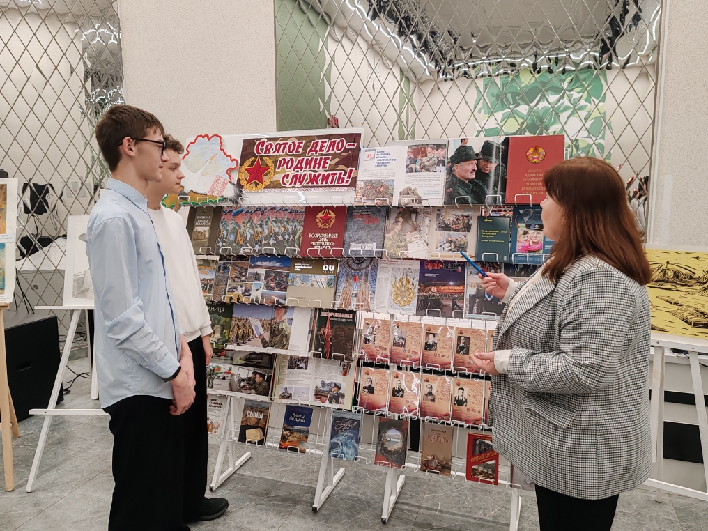 Во время торжественного мероприятия в районном центре культуры сотрудники центральной районной библиотеки предложили вниманию посетителей книжную выставку «Святое дело – Родине служить!». На выставке представлены издания, посвященные истории возникновения и развития военного образования на территории Республики Беларусь с 18 века и до наших дней, этапам становления Вооруженных сил Беларуси, основам идеологии обеспечения военной безопасности государства. Также представлена информация о военноначальниках, под чьим командованием проходило освобождение Беларуси в Великую Отечественную войну. Выставка включает документальную и художественную литературу об истории армии, героизме и защитниках Родины, исторические очерки, а также материалы о современной армии Беларуси.