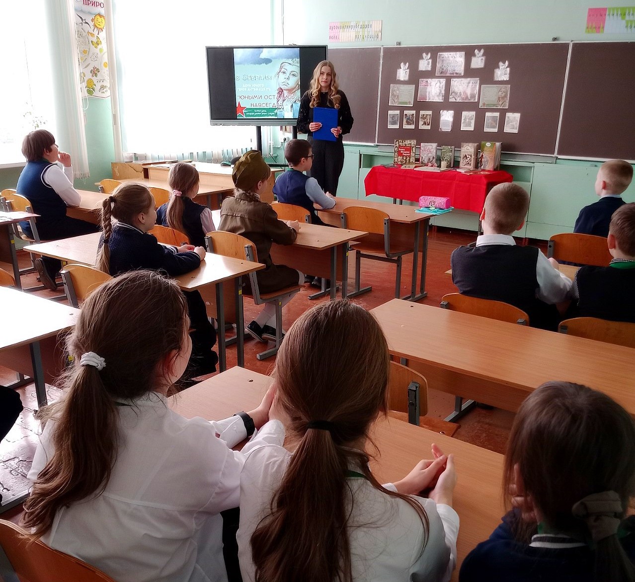 Урок мужества сопровождался показом презентации «Безусые герои» и обзором книг, представленных на выставке-подвиге «Маленькие герои большой войны». Во время урока ребята читали стихи о войне и исполняли песни как дань памяти тем ребятам, которые отдали свои жизни за мир и свободу своей Родины.