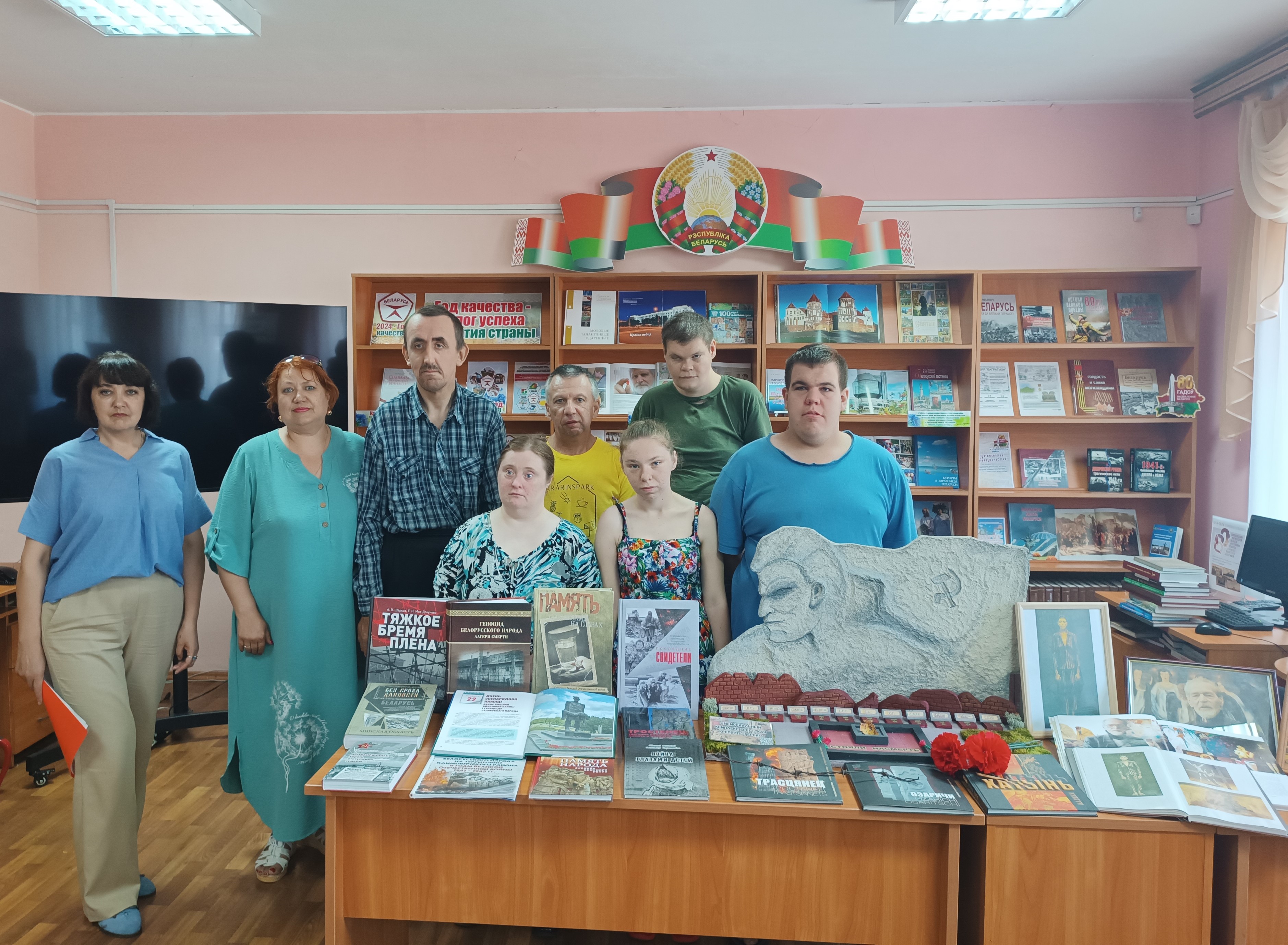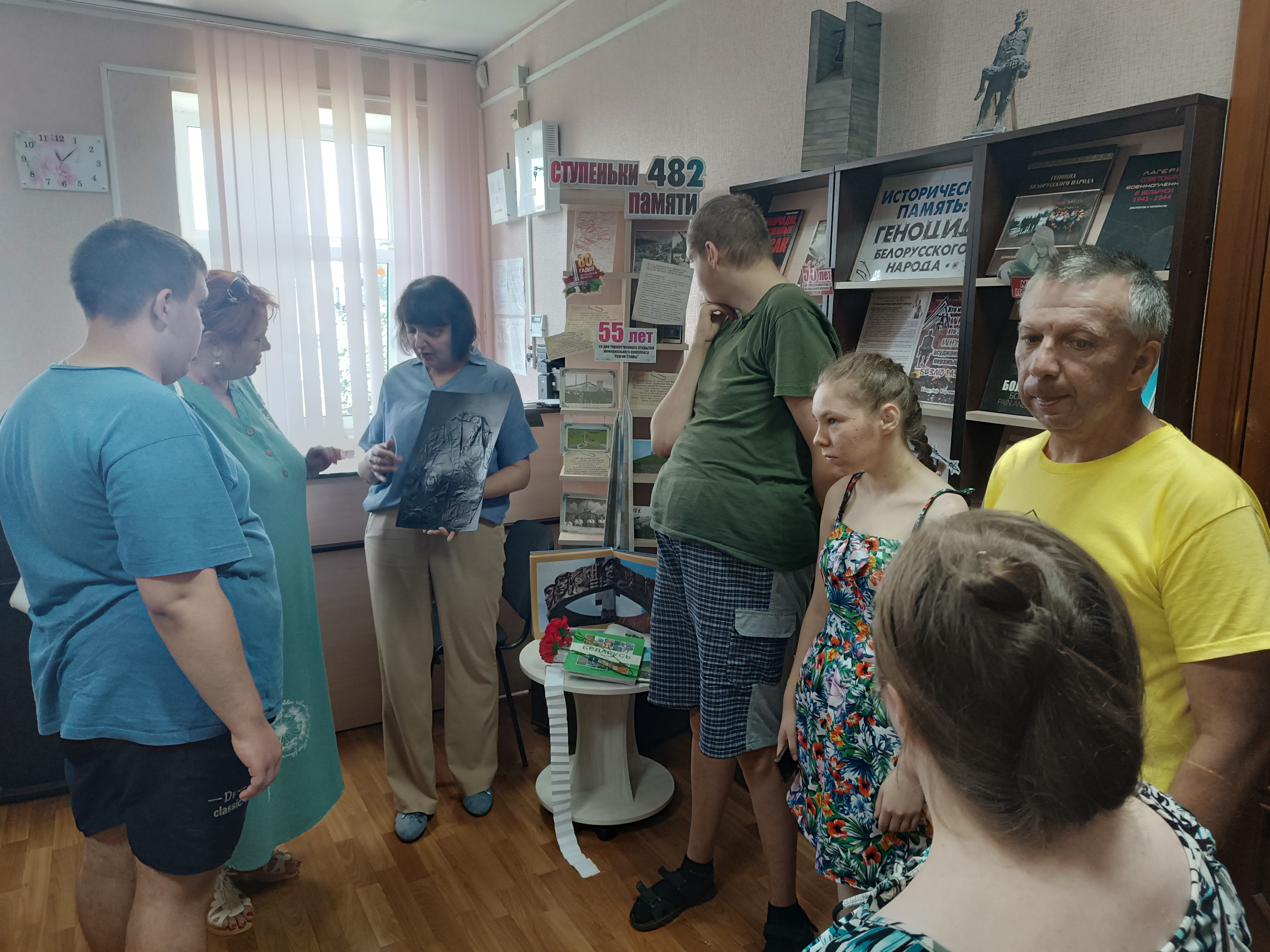 Молодые люди с инвалидностью и специалисты центра познакомились с постоянно действующей выставочной экспозицией «Историческая память. Геноцид белорусского народа». Библиотекарь провела обзор и познакомила с изданиями по теме, представленными на выставке.