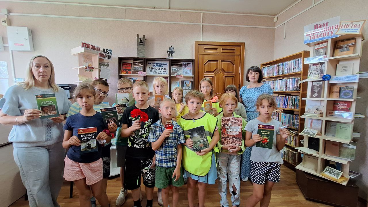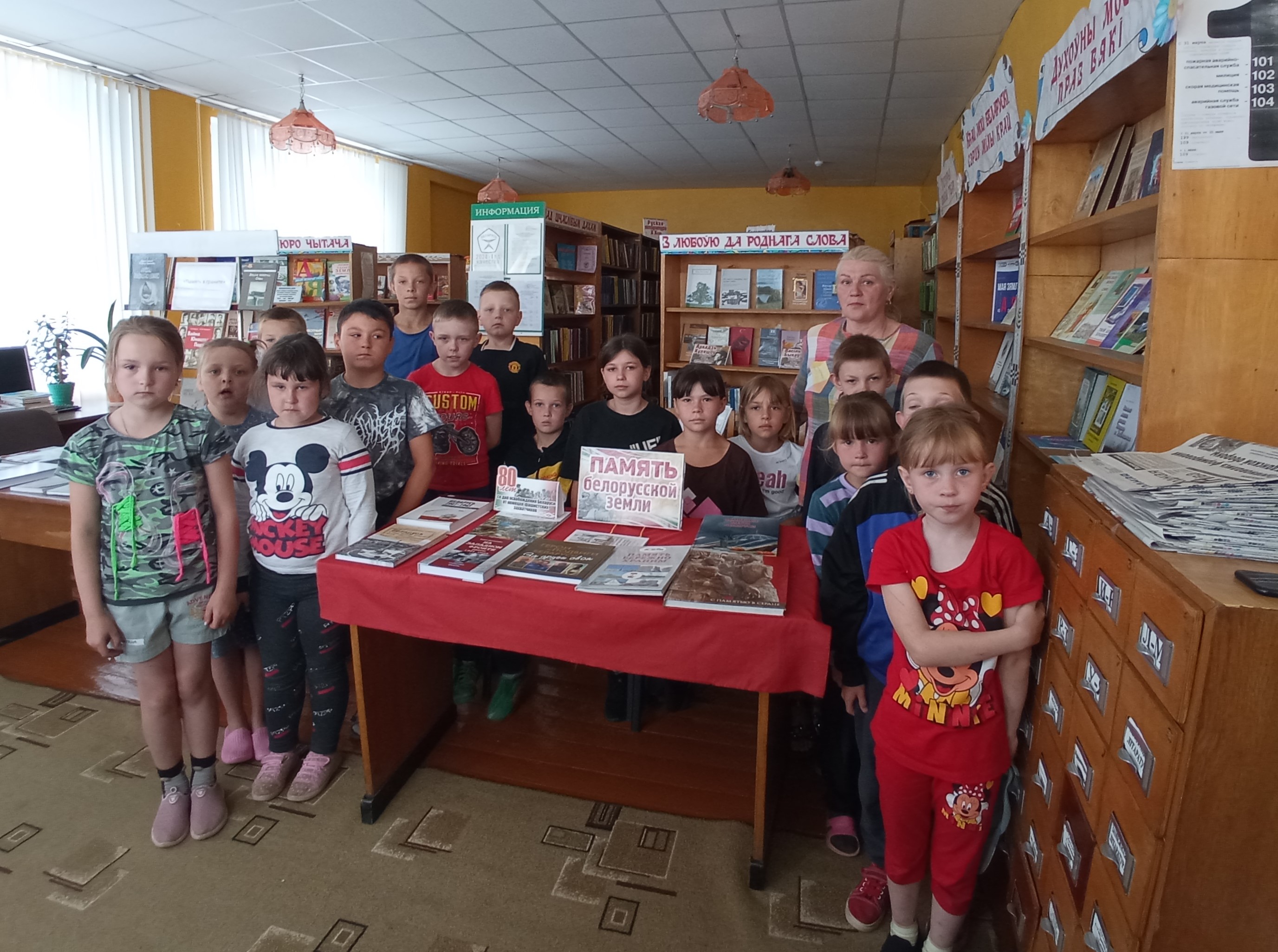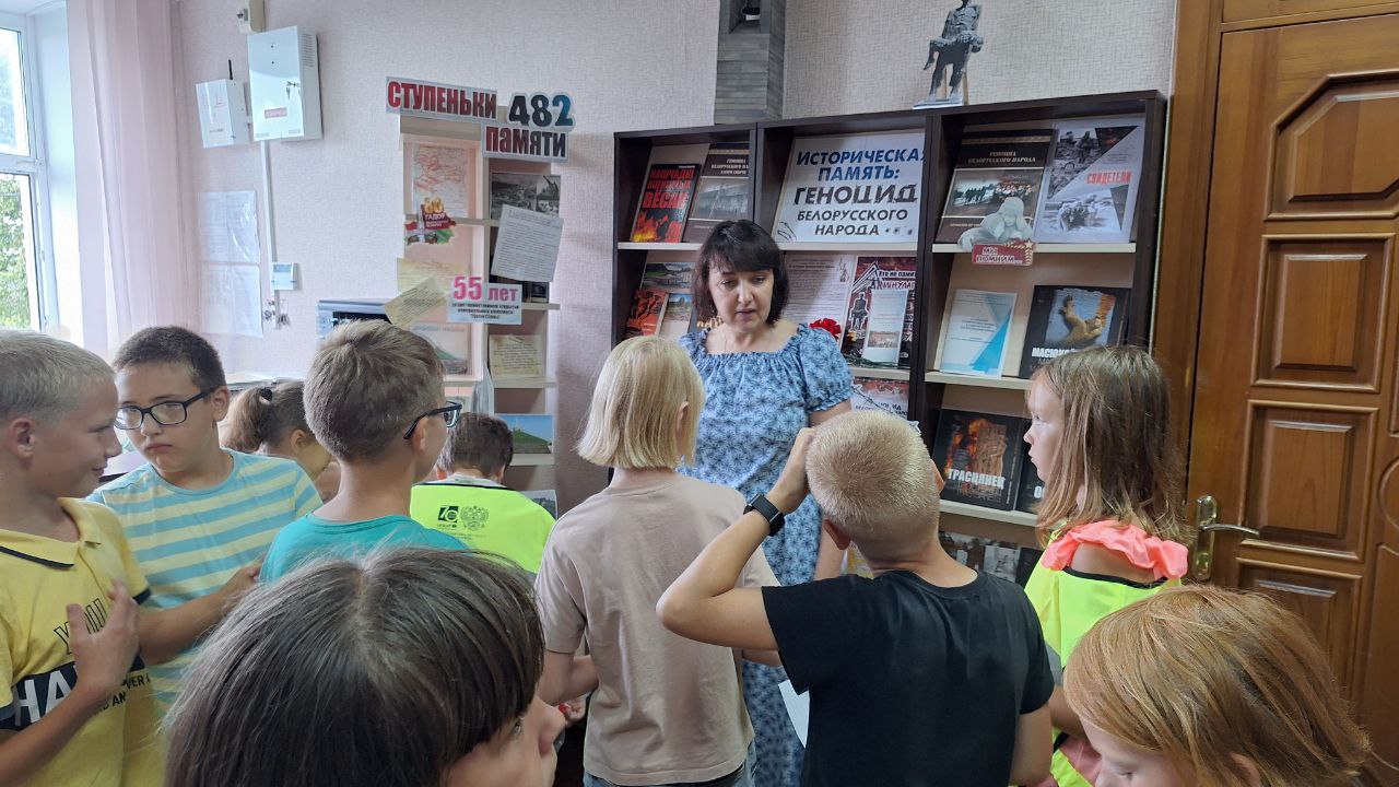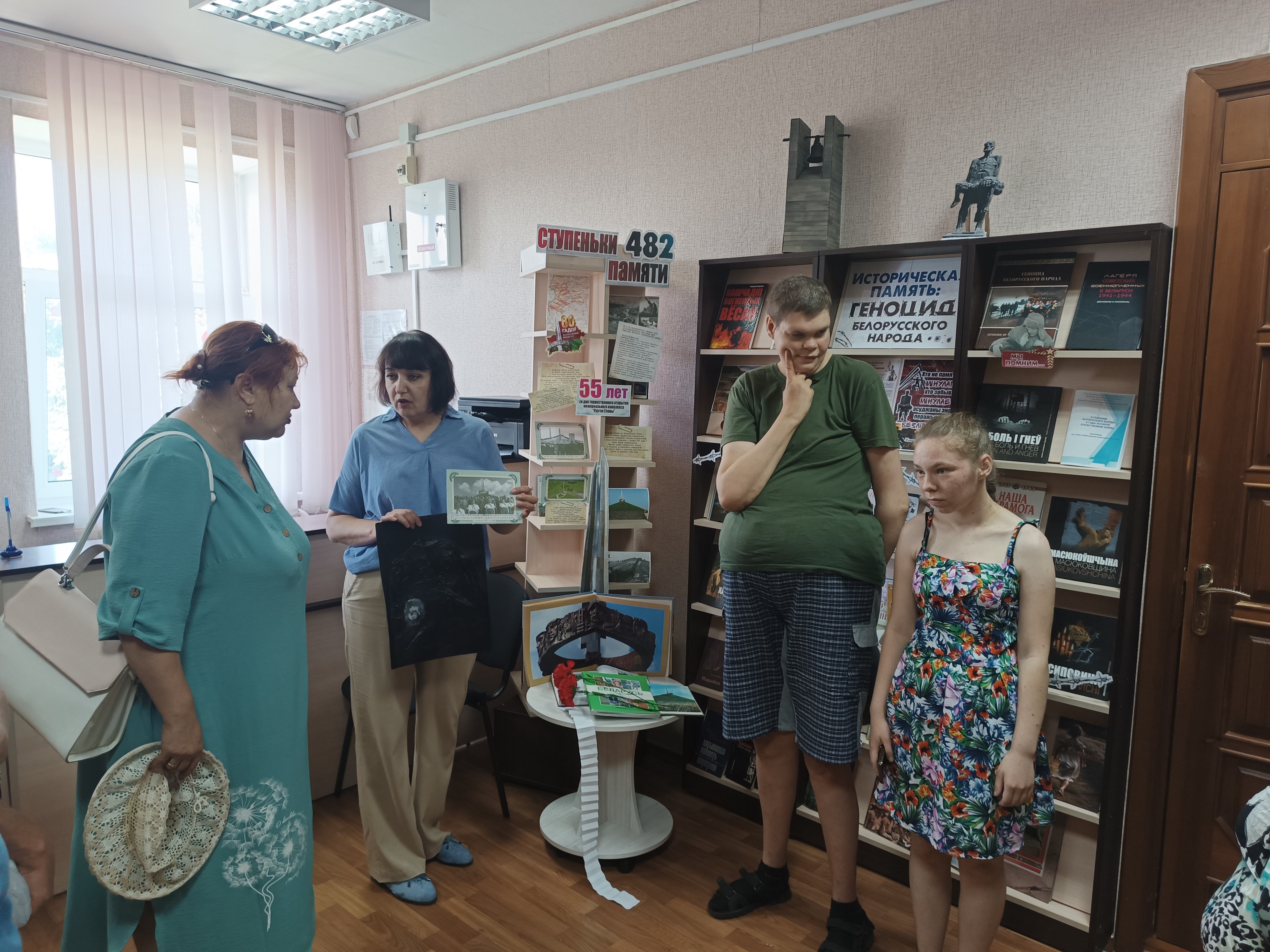 Библиотекари провели библиографический обзор выставки «482 ступеньки памяти», на которой представлены издания, рассказывающие о сотнях белорусских деревень, разрушенных и сожжённых немецкими захватчиками, а также многочисленные факты, свидетельствующие о целенаправленной политике геноцида гитлеровской Германии по отношению к населению Беларуси. Экспонаты выставки впечатлили ребят и заставили задуматься, ведь от увиденного становится по-настоящему больно и страшно. Данное мероприятие информирует о памятной дате, истории создания комплексов.