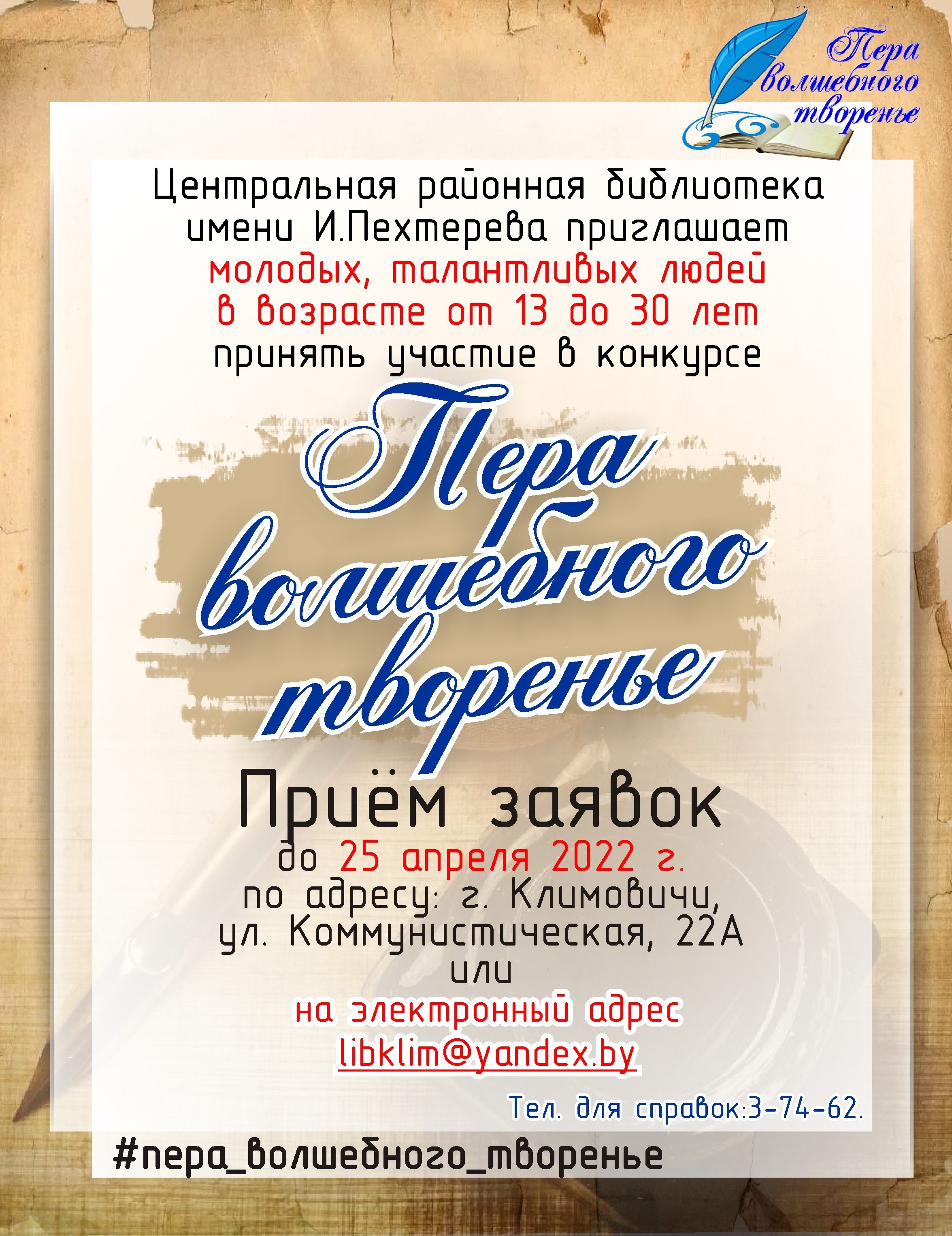 Заявки принимаются до 25 апреля 2022 г. в центральной районной библиотеке по адресу: г. Климовичи, ул. Коммунистическая, 22А; можно присылать на электронный адрес: libklim@yandex.by; телефон для справок: 3-74-31, 3-74-62.