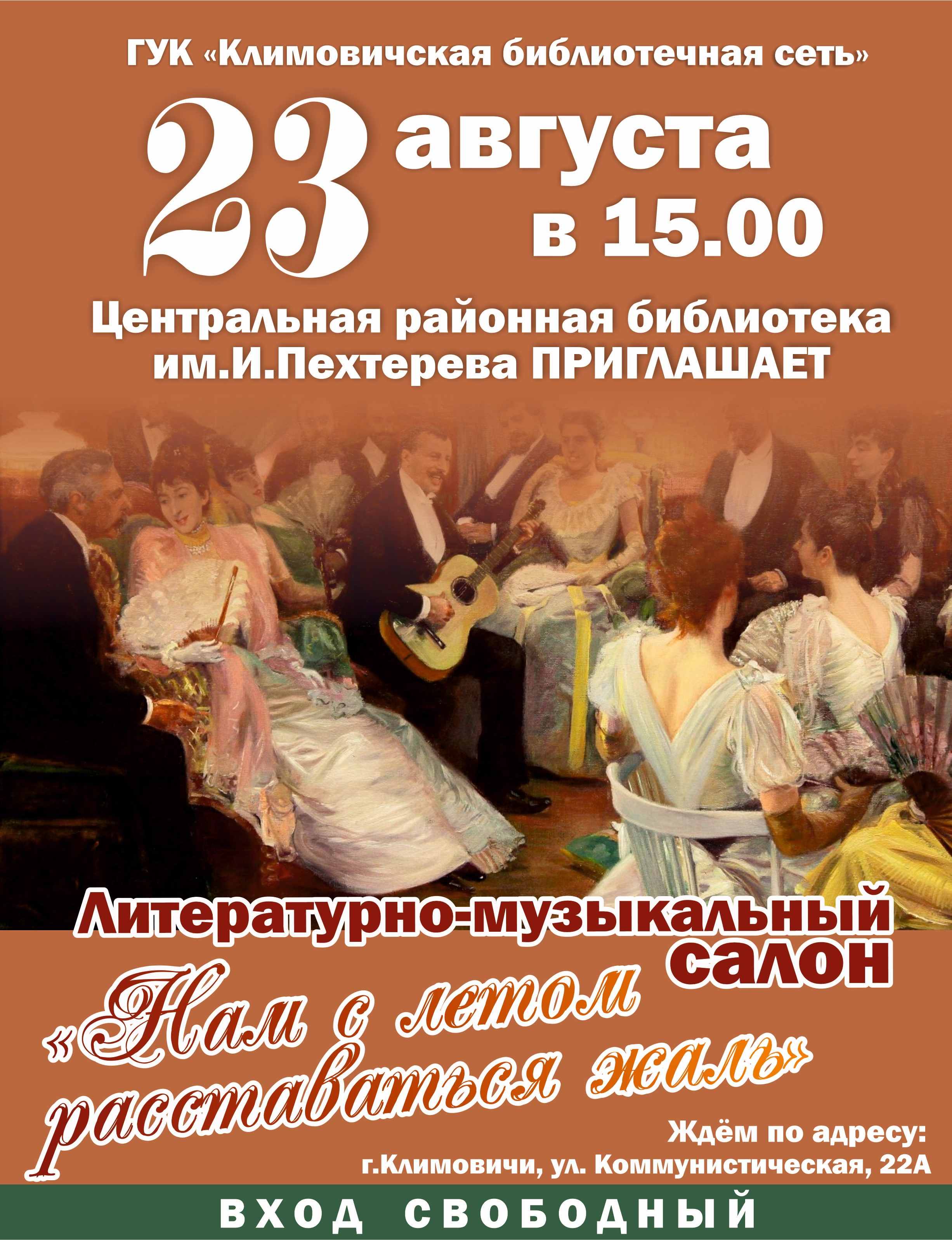 23 августа 2024 года в 15.00 в центральной районной библиотеке им. И.Пехтерева состоится литературно-музыкальный салон «Нам с летом расставаться жаль».