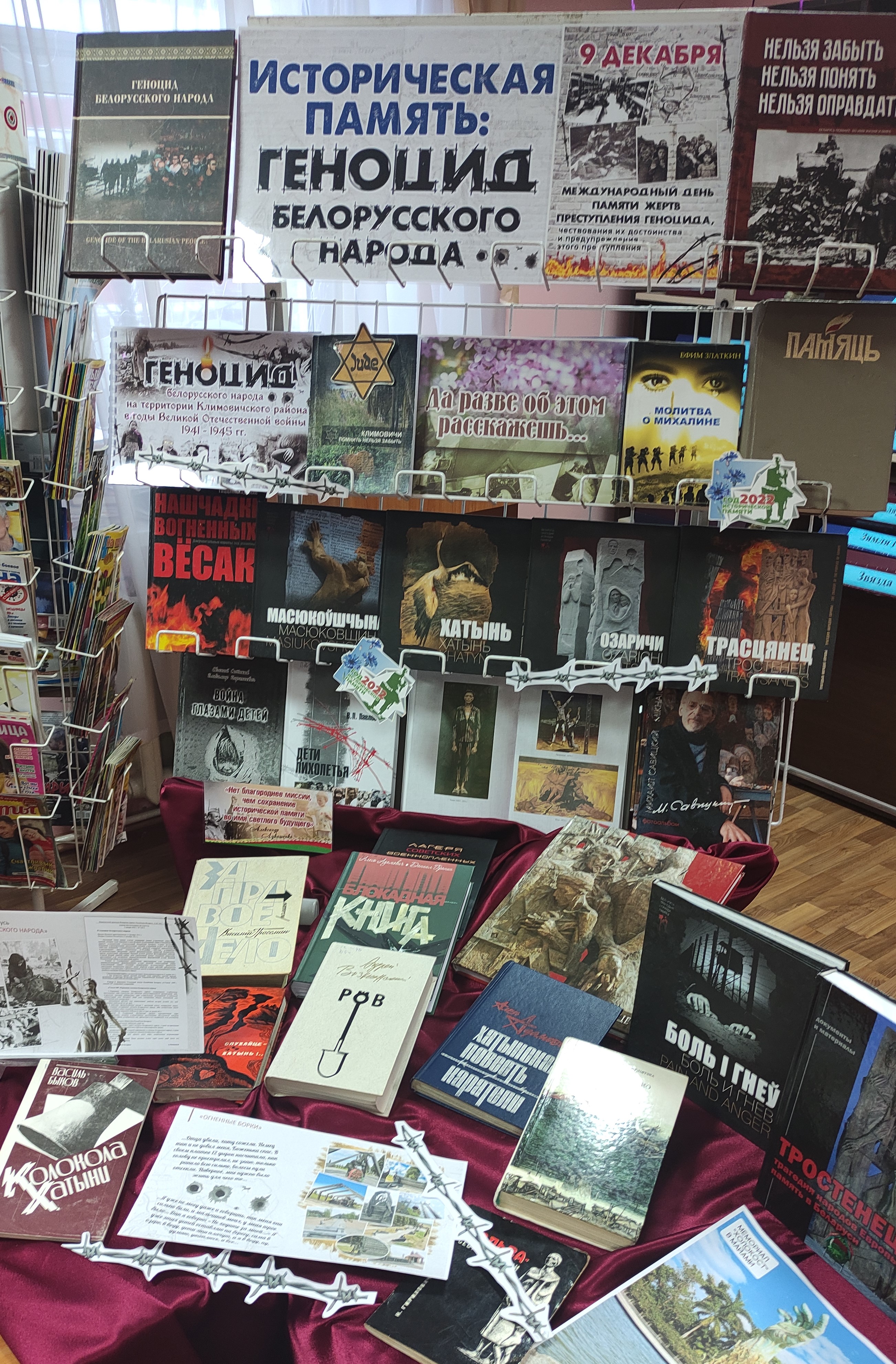 В центральной районной библиотеке оформлена книжная экспозиция «Историческая память: геноцид белорусского народа». Здесь представлены книги, информационные материалы, фотографии, хроники событий военных лет. Центральное место на выставке занимают уникальные документальные материалы, воспоминания земляков-очевидцев о событиях Великой Отечественной войны.