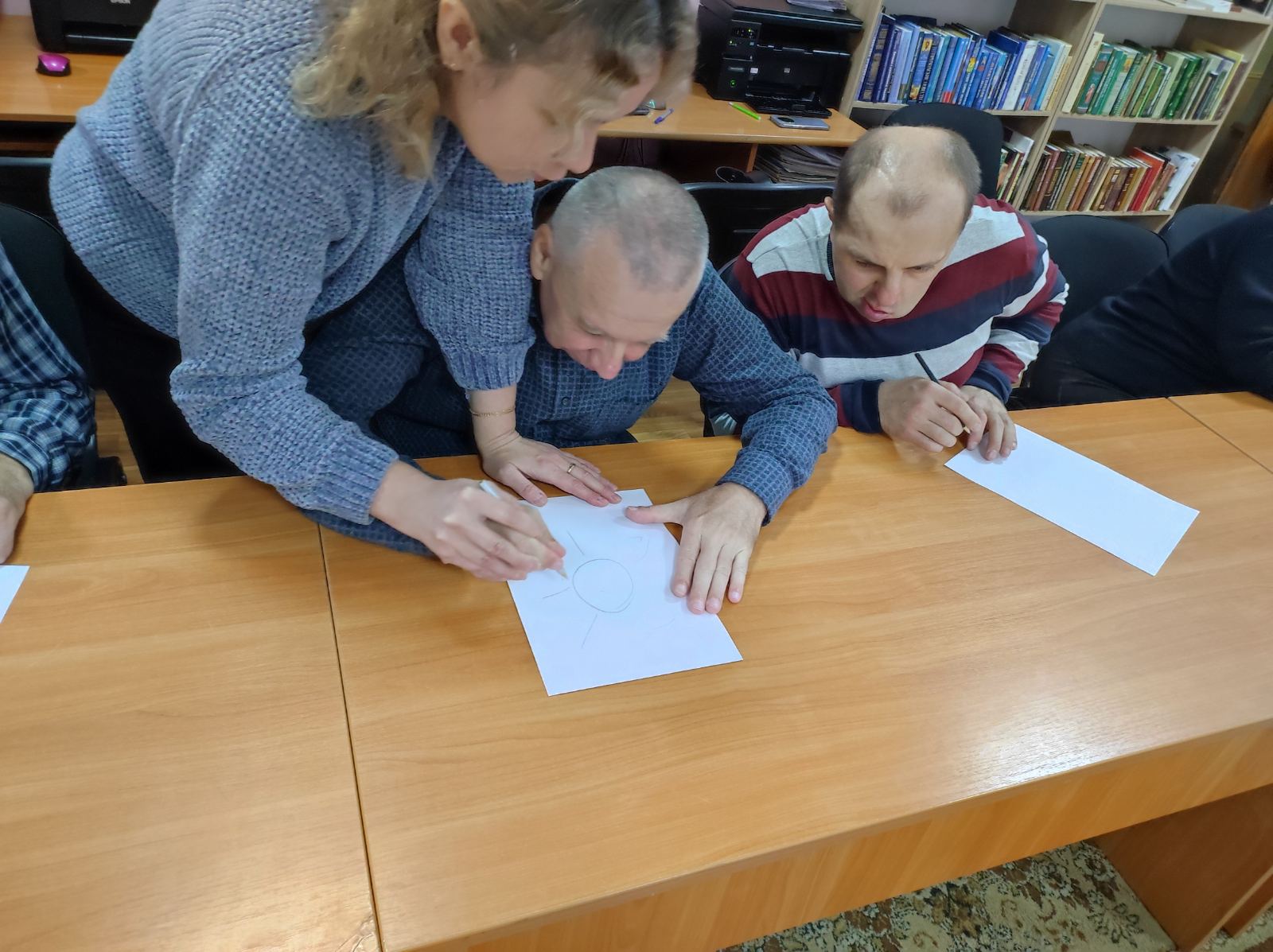 Чтобы помочь понять трудности людей с инвалидностью, участники мероприятия в игровых упражнениях делали то, что и инвалиды: с закрытыми глазами рисовали, угадывали мелодии и звуки природы, пробовали с помощью только одной руки словить мяч.