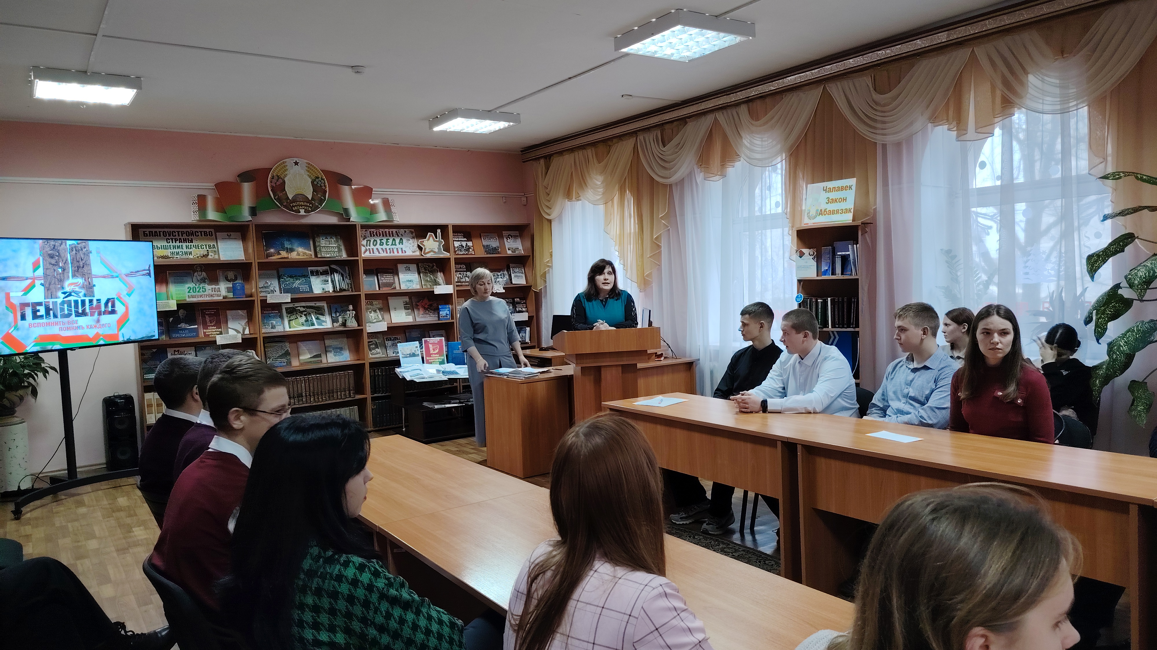 8 декабря в рамках памятной даты для учащихся учреждений образования Климовичского района сотрудники центральной районной библиотеки провели круглый стол «Геноцид. Вспомнить всё. Помнить каждого», на котором обсудили трагедию белорусского народа в годы Великой Отечественной войны, вспомнили исторические факты о геноциде, провели обзор литературы, посвященной этой страшной странице истории Беларуси. Ребята узнали о судьбе одной из многочисленных деревень белорусских Хатыней – Драмлёво, описанной в документальной повести-эссе Анатолия Бензерука «Галавасек», о героях книг Зои Подлипской «Ульянин сад» и Павла Гушенца «Война девочки Саши», перед которыми стояла важная задача выжить - выжить в лагере, выжить в плену, выжить в оккупации.