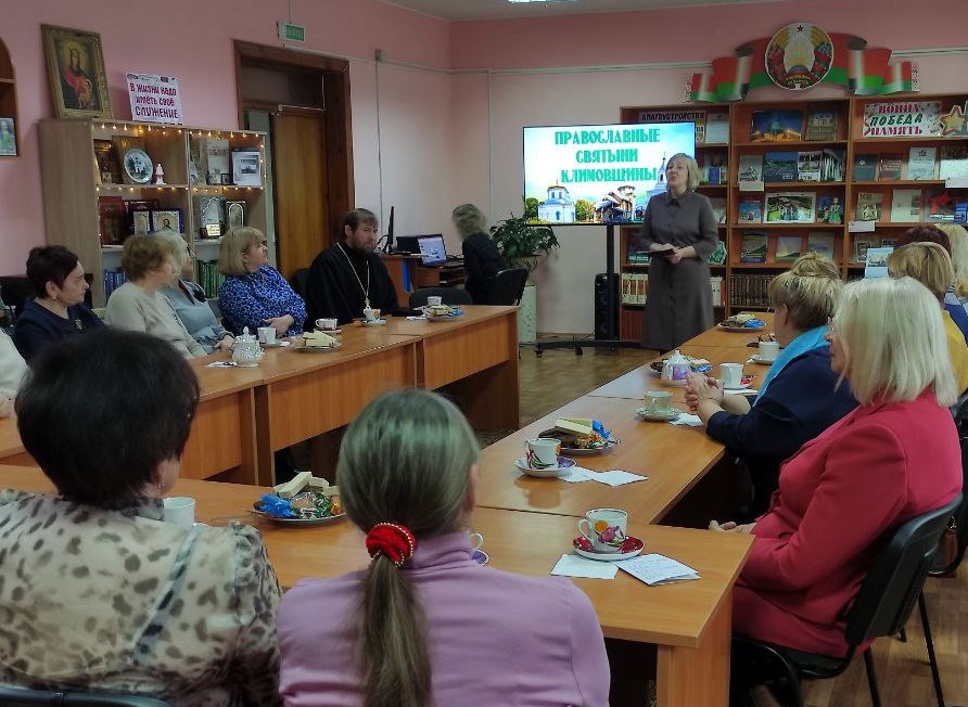 10 декабря в читальном зале районной центральной библиотеки для ветеранов педагогического труда прошёл духовно-просветительский час «Православные святыни Климовщины». В начале мероприятия заведующий отделом обслуживания и информации Ольга Максимович познакомила всех присутствующих с православными святынями Климовичского района – храмом Святого Архангела Михаила г. Климовичи и храмом Вознесения Господня аг. Милославичи, рассказала историю их возникновения и предложила посмотреть о них презентацию.