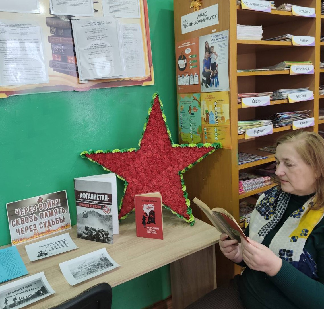 Вниманию читателей в Барсуковской, Макеевичской и Тимоновской сельских библиотеках оформлены книжные выставки «Через войну. Сквозь память. Через судьбы», «Афганская война – живая память». Урок мужества «Дорогами Афганистана» прошел в Высоковской сельской библиотеке. Библиотекари рассказывают о подвиге и героизме воинов-афганцев, прошедших дорогами войны по земле Афганистана, знакомят с историями бывших воинов-интернационалистов, которые живут на территории их сельского Совета.