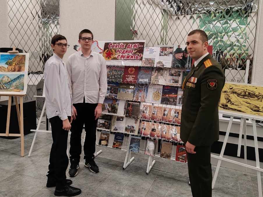 Во время торжественного мероприятия в районном центре культуры сотрудники центральной районной библиотеки предложили вниманию посетителей книжную выставку «Святое дело – Родине служить!». На выставке представлены издания, посвященные истории возникновения и развития военного образования на территории Республики Беларусь с 18 века и до наших дней, этапам становления Вооруженных сил Беларуси, основам идеологии обеспечения военной безопасности государства. Также представлена информация о военноначальниках, под чьим командованием проходило освобождение Беларуси в Великую Отечественную войну. Выставка включает документальную и художественную литературу об истории армии, героизме и защитниках Родины, исторические очерки, а также материалы о современной армии Беларуси.