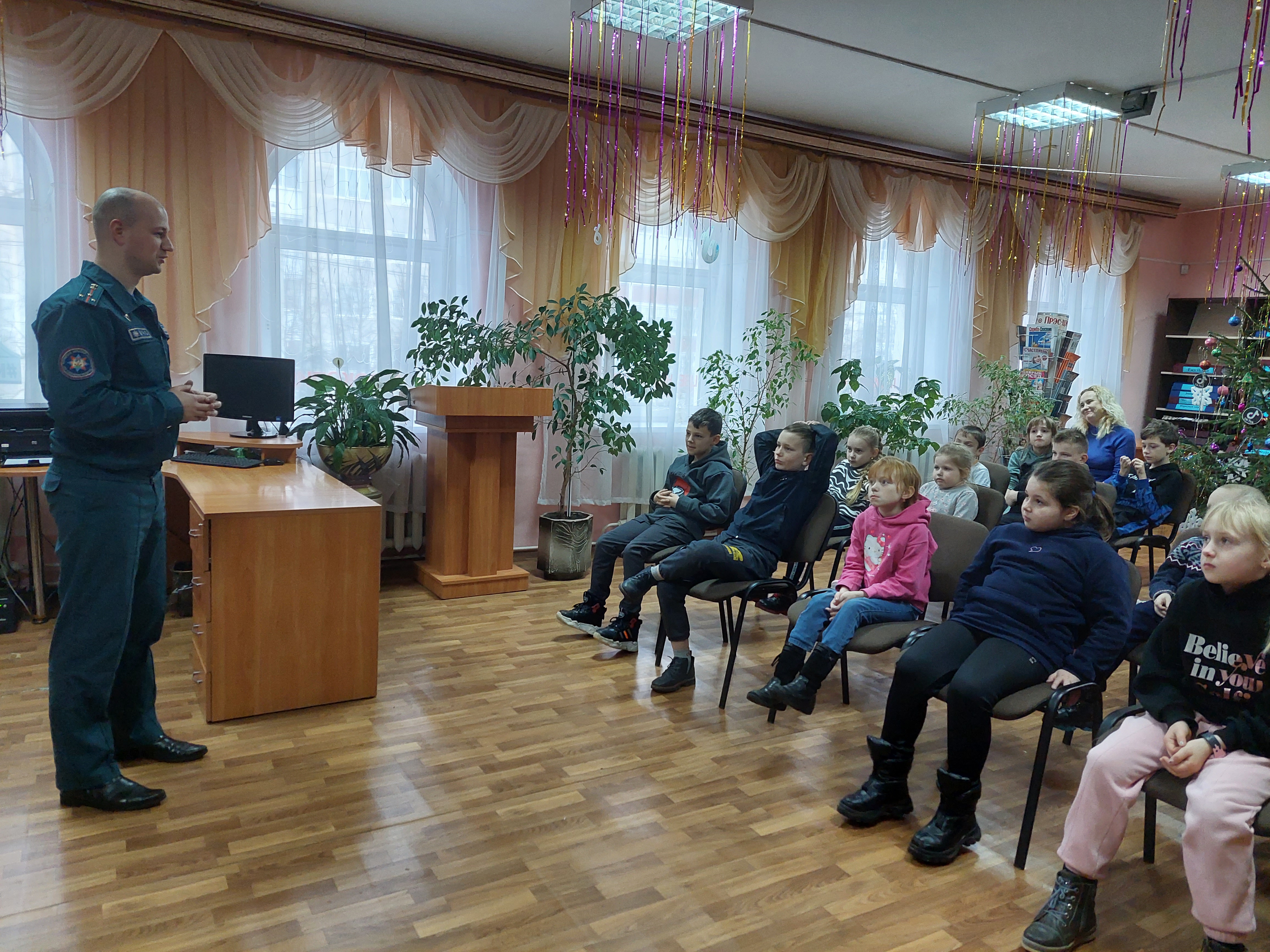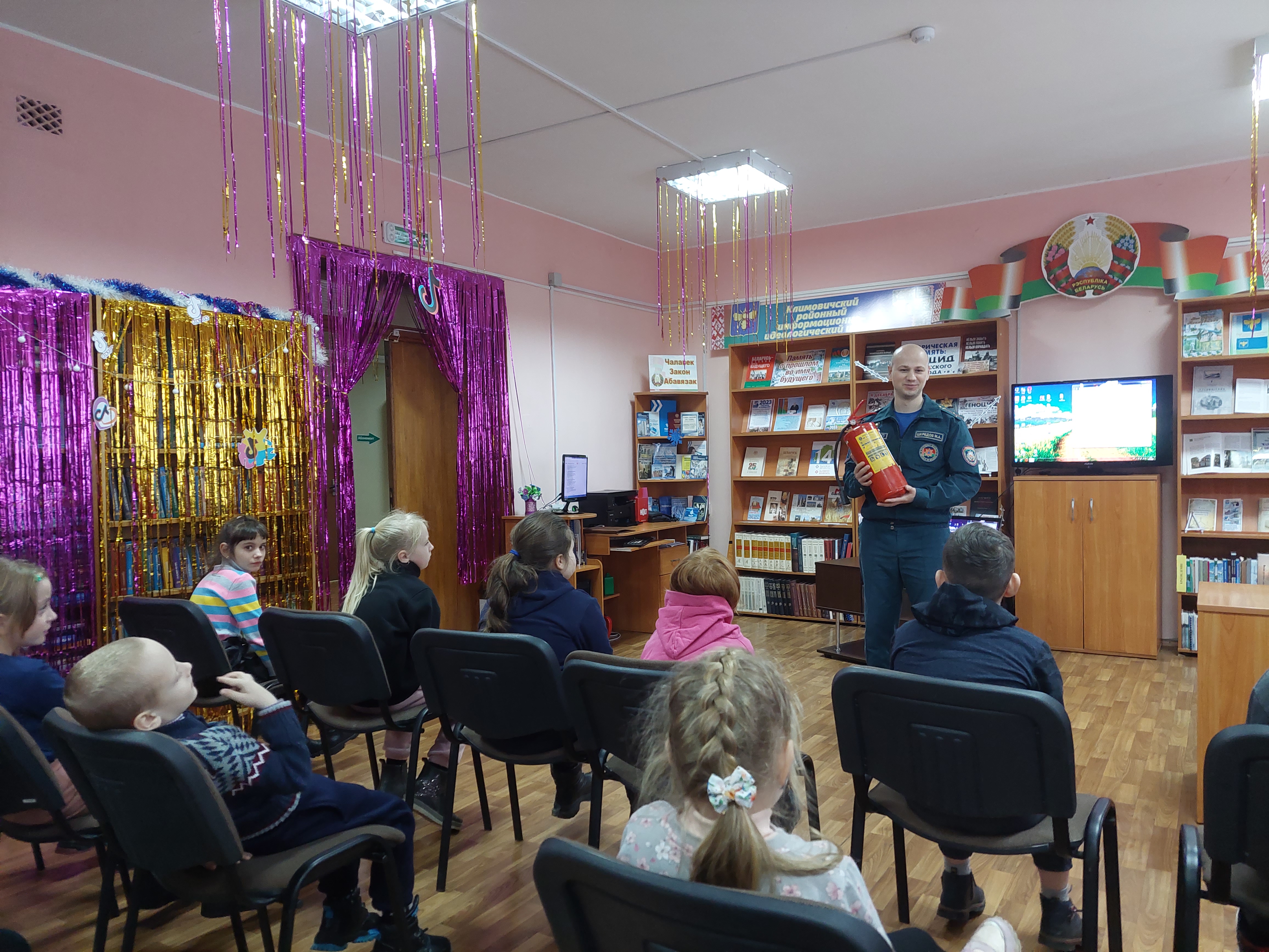 Зимние каникулы – время волшебства, подарков, положительных эмоций. А еще каникулы – это время вспомнить и закрепить правила безопасного поведения. В центральной районной библиотеке имени Ивана Пехтерева для ребят из пришкольного лагеря средней школы №3 прошел видео-дайджест «Зима – опасности пора». Инспектор Климовичского РОЧС М. Шкредов рассказал детям о правилах пожарной безопасности, о правилах пользования огнетушителем, а также показал несколько серий «Волшебной книги» - мультсериала от спасателей Беларуси.
