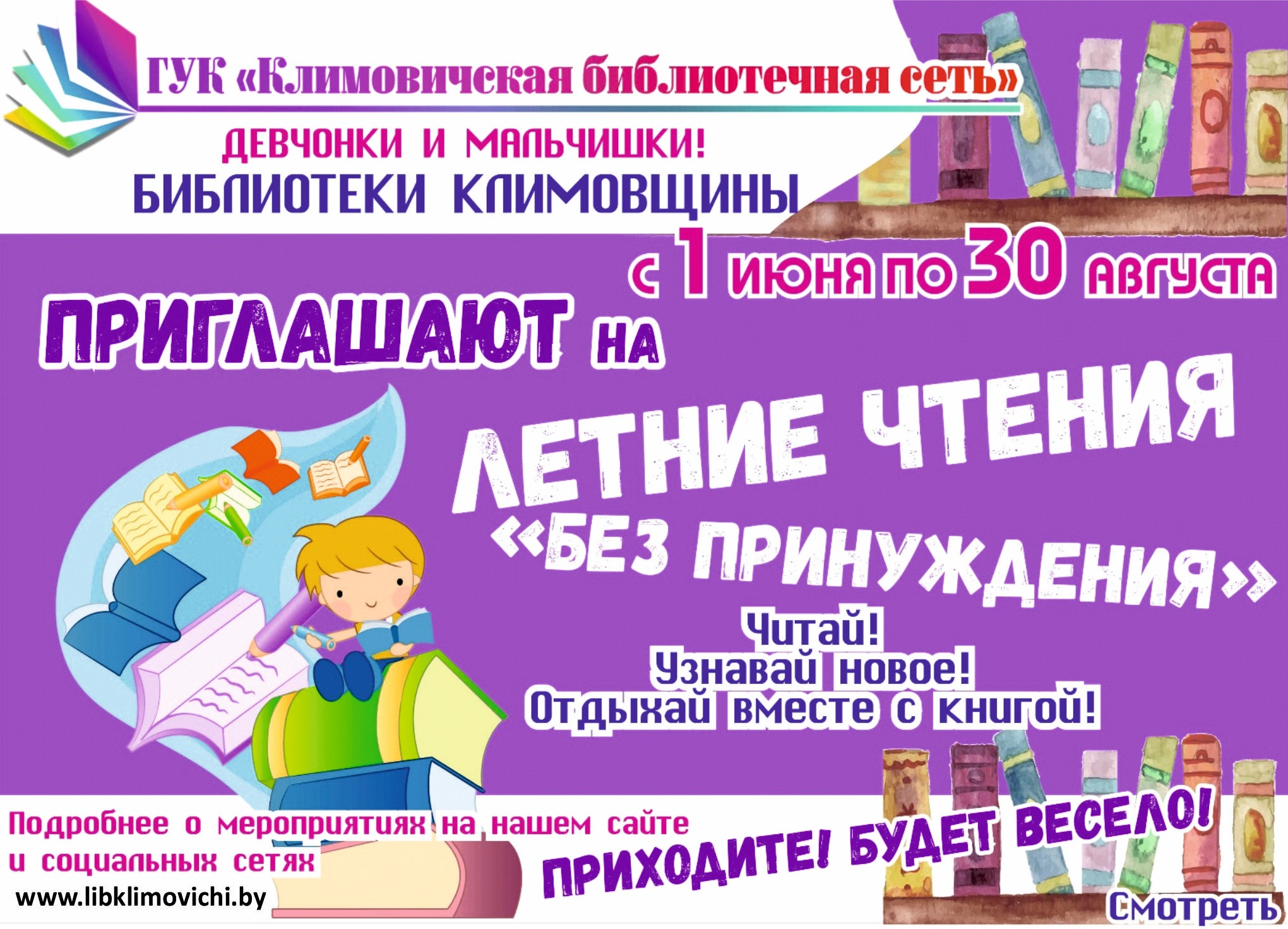 Приглашаем вас принять участие в познавательно-развлекательных мероприятиях в рамках программы летнего чтения «Без принуждения». Вас ждут незабываемые встречи, литературные праздники, конкурсы, викторины, игры, квесты и многое другое!