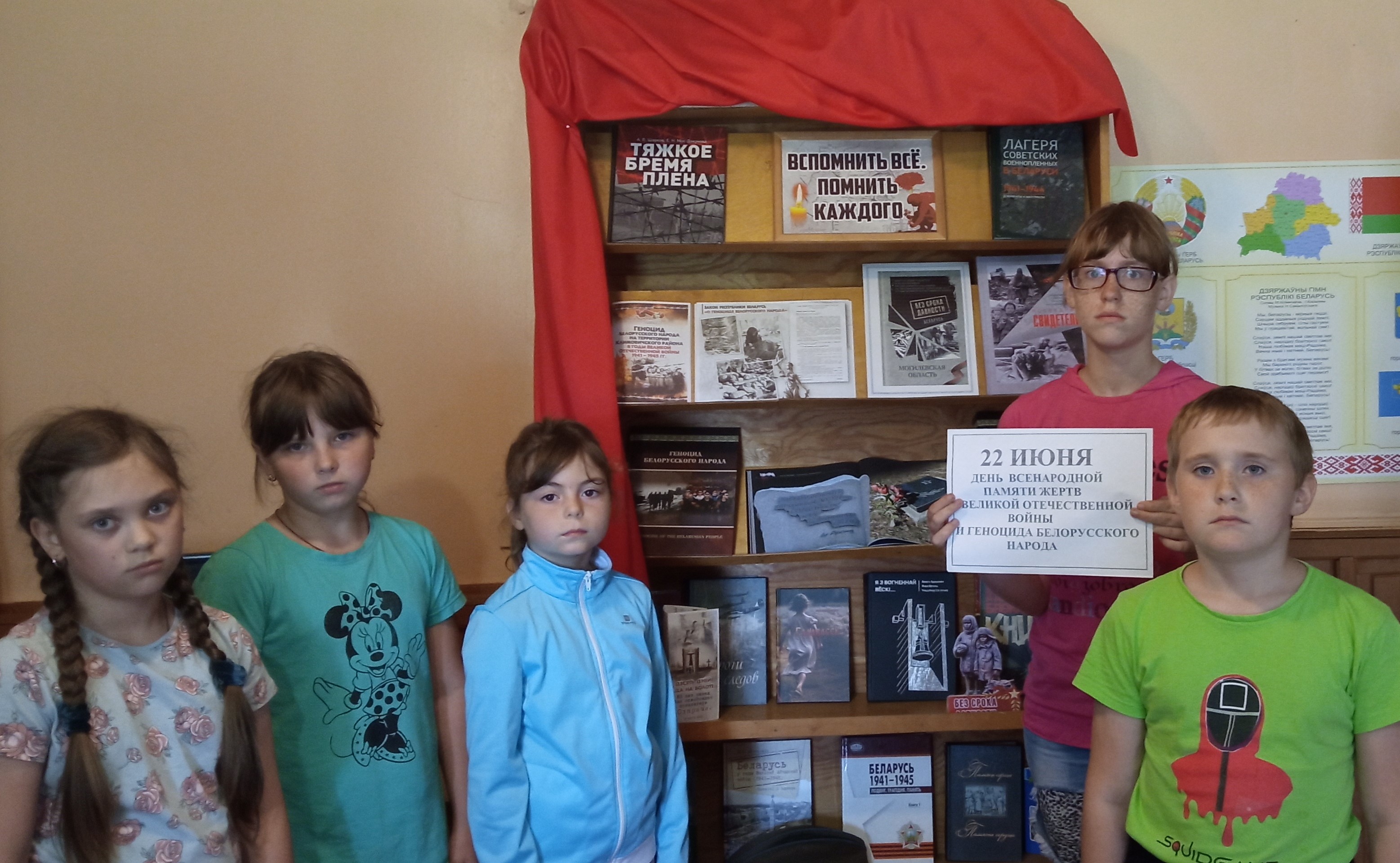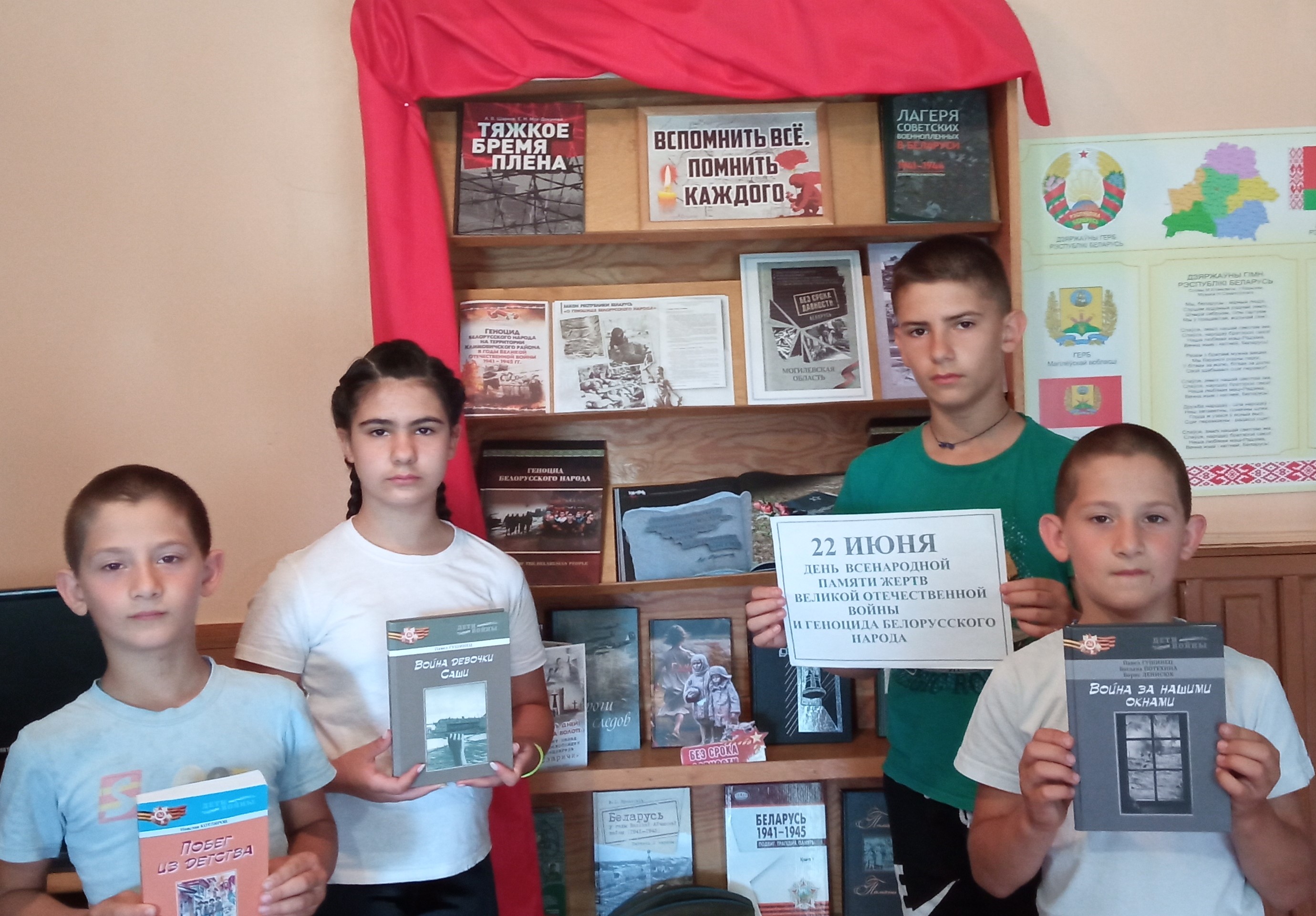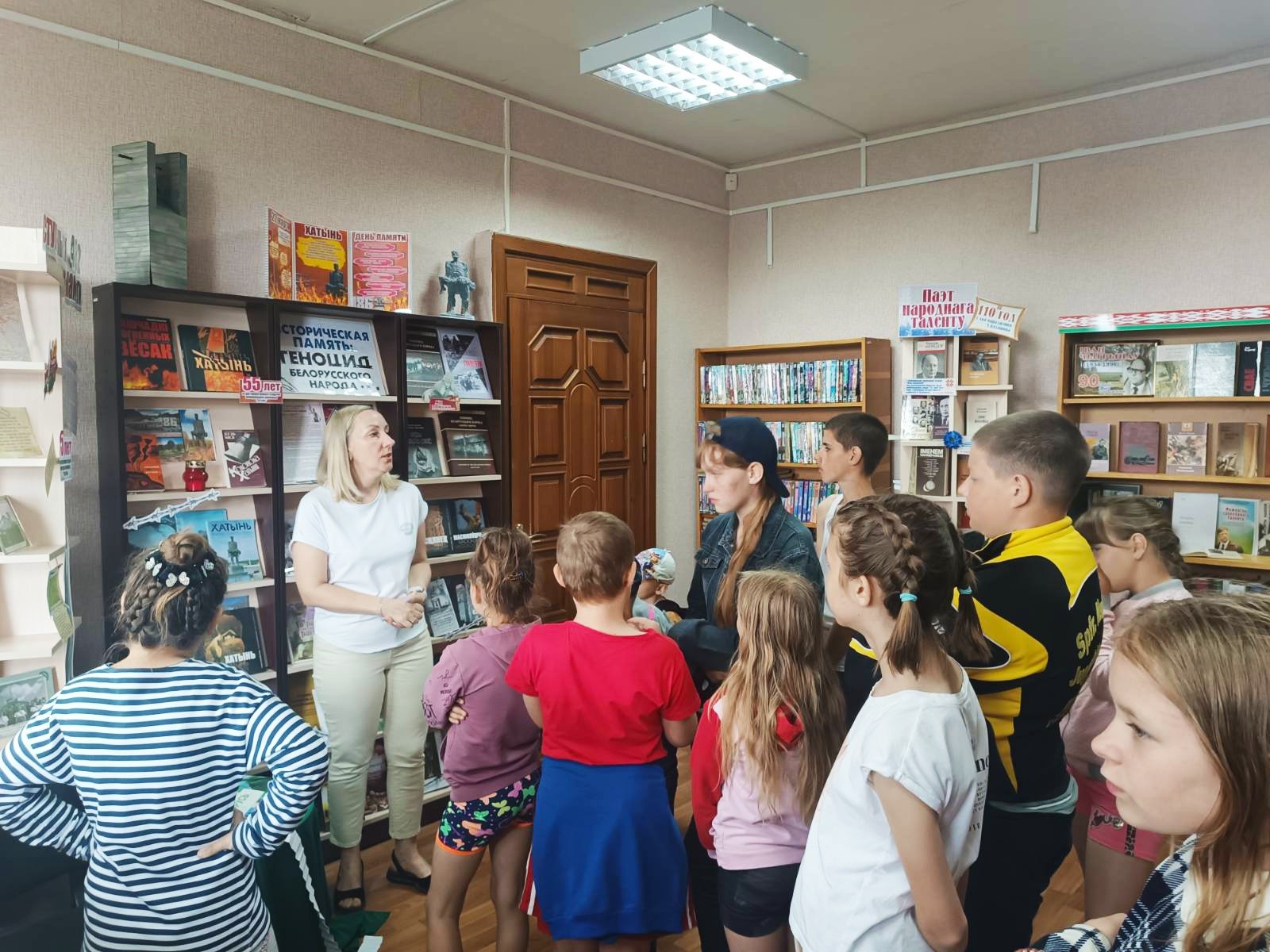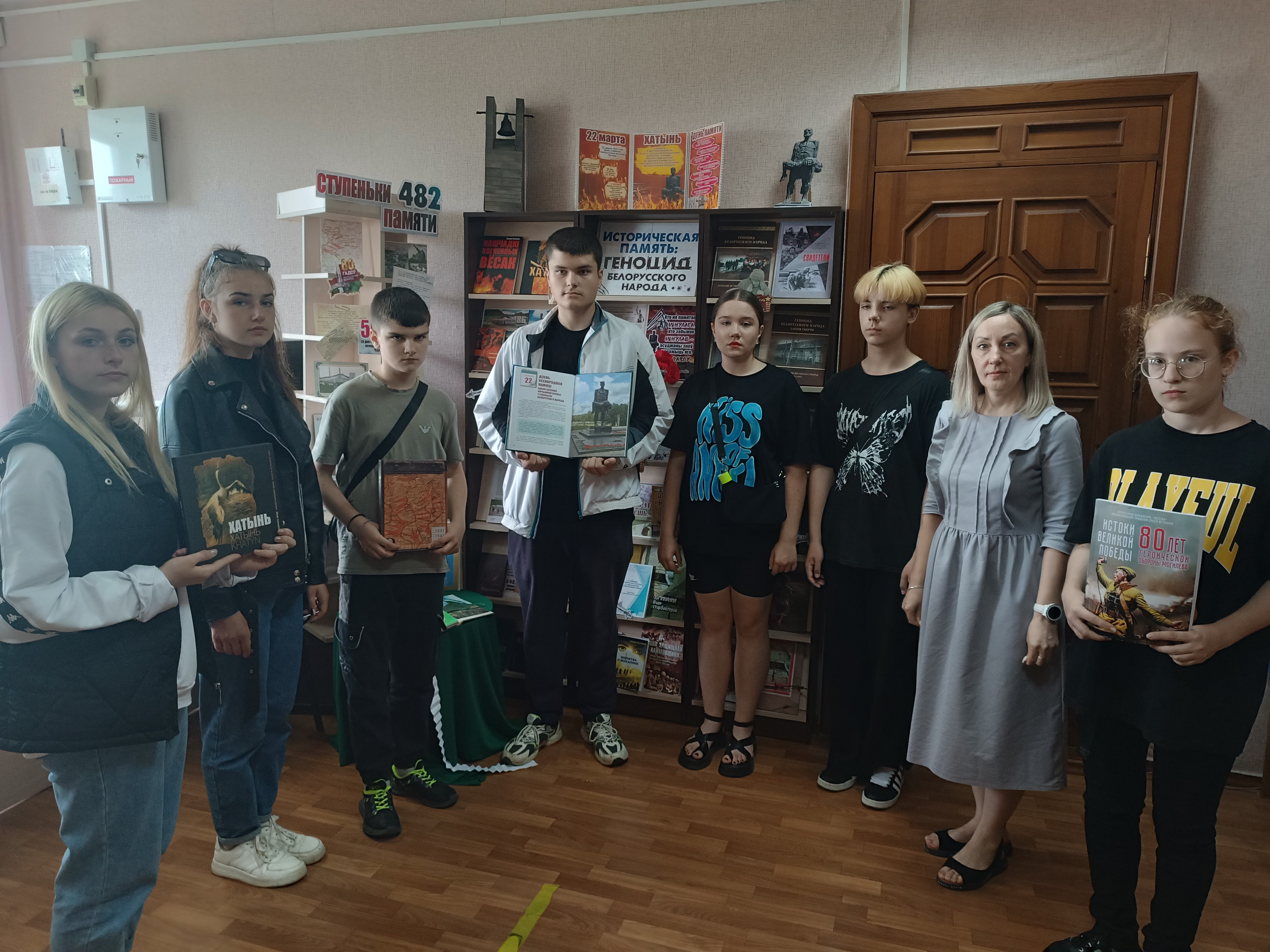 Час исторической памяти «Пока мы живы помнить надо!», приуроченный ко Дню всенародной памяти жертв Великой Отечественной войны, геноцида белорусского народа и к 80-летию освобождения Беларуси от немецко-фашистских захватчиков, проведен в центральной районной библиотеке. В мероприятии приняли участие ребята из трудового лагеря средней школы №4. Заведующий отделом обслуживания и информации Ольга Максимович рассказала ребятам о том, как огненным вихрем ворвалась в мирную жизнь людей война.