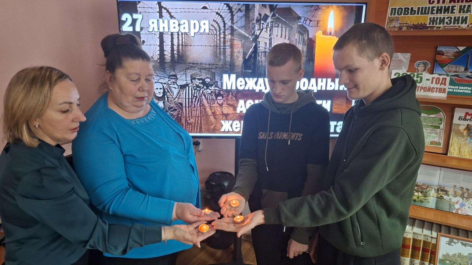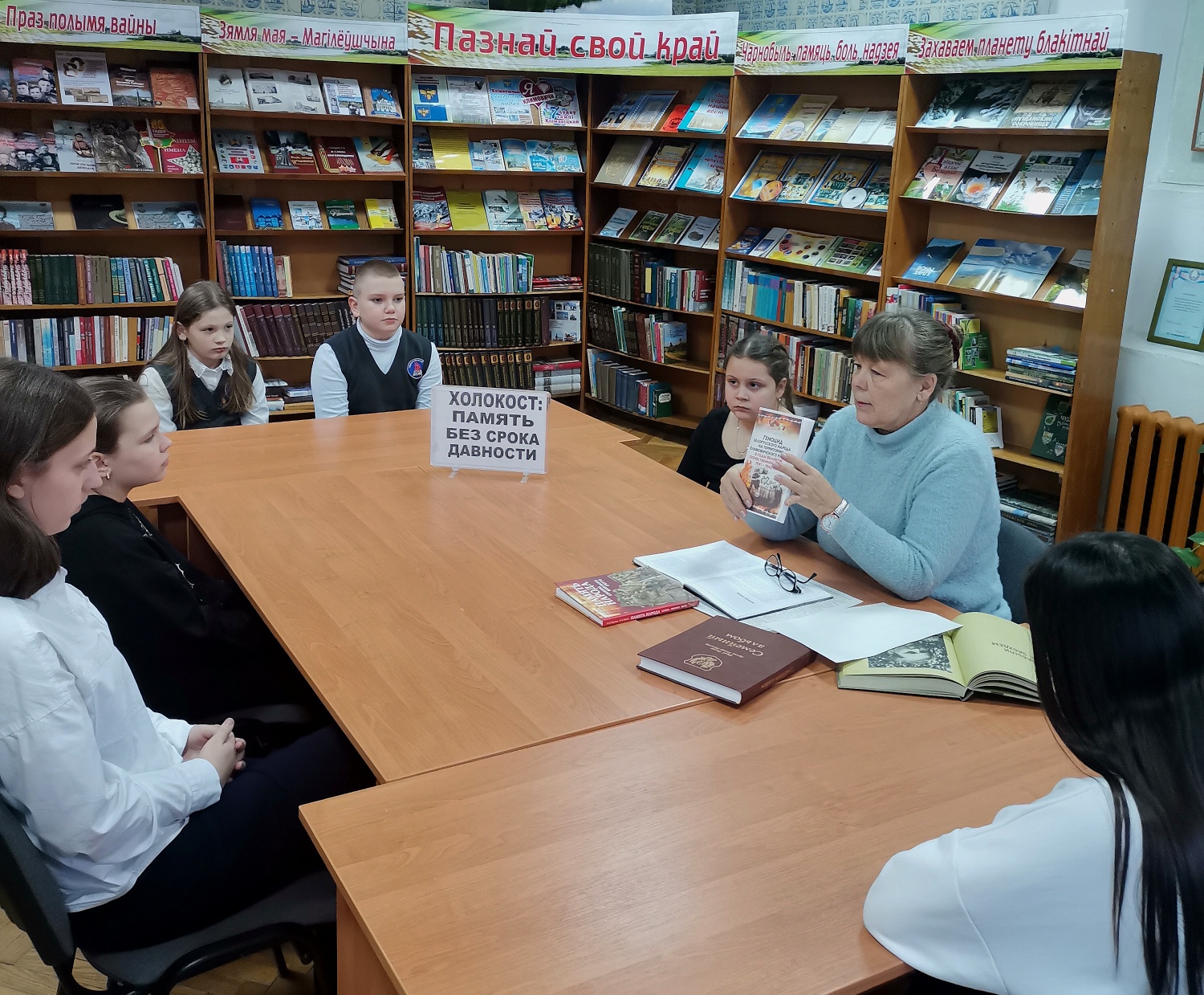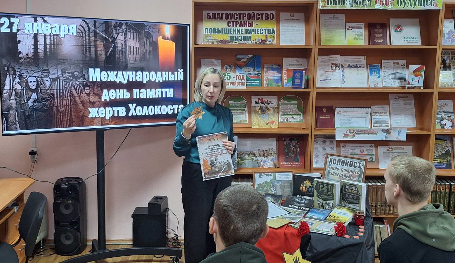В городской библиотеке № 1, Звенчатской и Стародединской сельских библиотеках на часах истории и памяти «Холокост: память поколений», «Про Холокост расскажут книги», «Геноцид - боль и память» библиотекари рассказали юным читателям о событиях, предшествующих Холокосту, которые стали отправной точкой для дальнейшего уничтожения и гонения еврейского народа. Ребята узнали о зверстах фашистов в годы Великой Отечественной войны, судьбе еврейского народа на территории Беларуси, познакомились с тематическими обзорами литературы «Память и боль белорусской земли», которые дали возможность прикоснуться к трагическим страницам истории, почтили память безвинно погибших минутой молчания.
