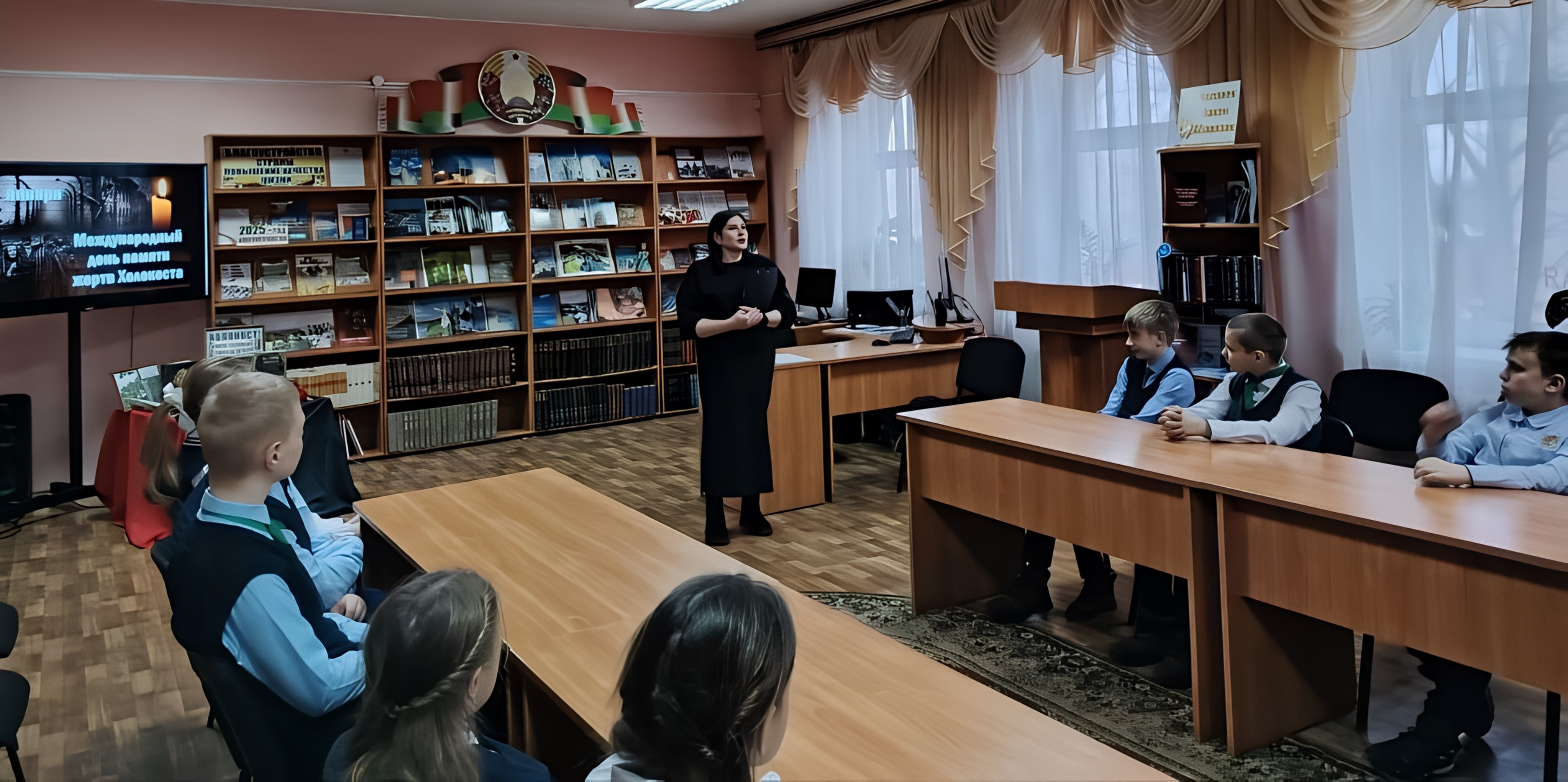 Сотрудниками городской библиотеки № 2 была проведена беседа-реквием «Черный пепел войны. Пепел Холокоста» с учащимися седьмых классов городской гимназии. Просмотр тематической презентации, чтение стихотворений русских и белорусских поэтов, знакомство с документальными и художественными произведениями о преступлениях фашизма против советского народа привели ребят к выводу, что человечество обязано извлечь уроки из этой истории, и сделать все необходимое, чтобы она никогда не повторилась.