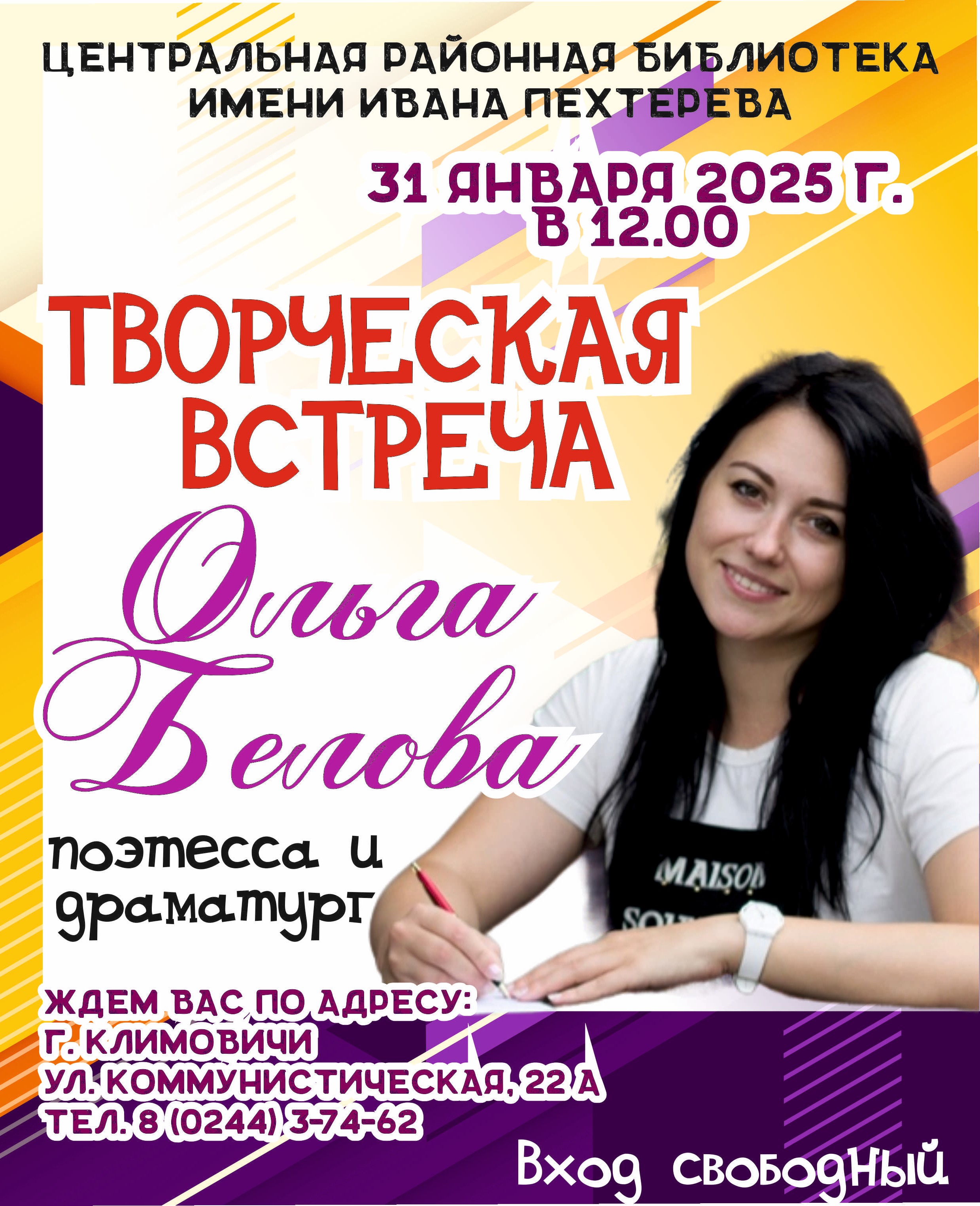 В библиотеке встреча с писателем – всегда праздник, яркое и запоминающее событие. Дорогие друзья! 31 января 2025 года в 12.00 центральная районная библиотека имени Ивана Пехтерева приглашает на творческую встречу с членом Союза писателей Беларуси Ольгой Беловой.