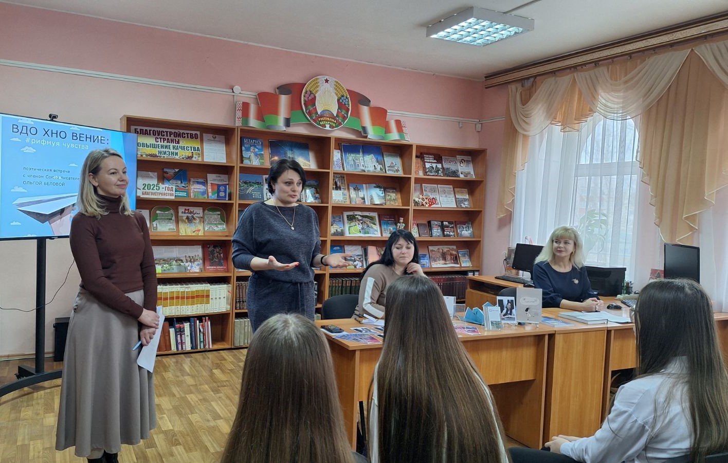 В рамках проекта «Библиотека на все СТО ПЯТЬ!» и в целях привлечения читателей к современной белорусской литературе, в гостях у Климовичской центральной районной библиотеки имени Ивана Пехтерева и старшеклассников третьей городской школы побывала известная могилевская поэтесса, драматург, член Союза писателей Беларуси, член Союза писателей Союзного государства, член Союза белорусских театральных деятелей, преподаватель цикловой комиссии "Режиссура театральных представлений и праздников", руководитель театра «Атмосфера» и просто жизнерадостный и очень обаятельный человек Ольга Белова.