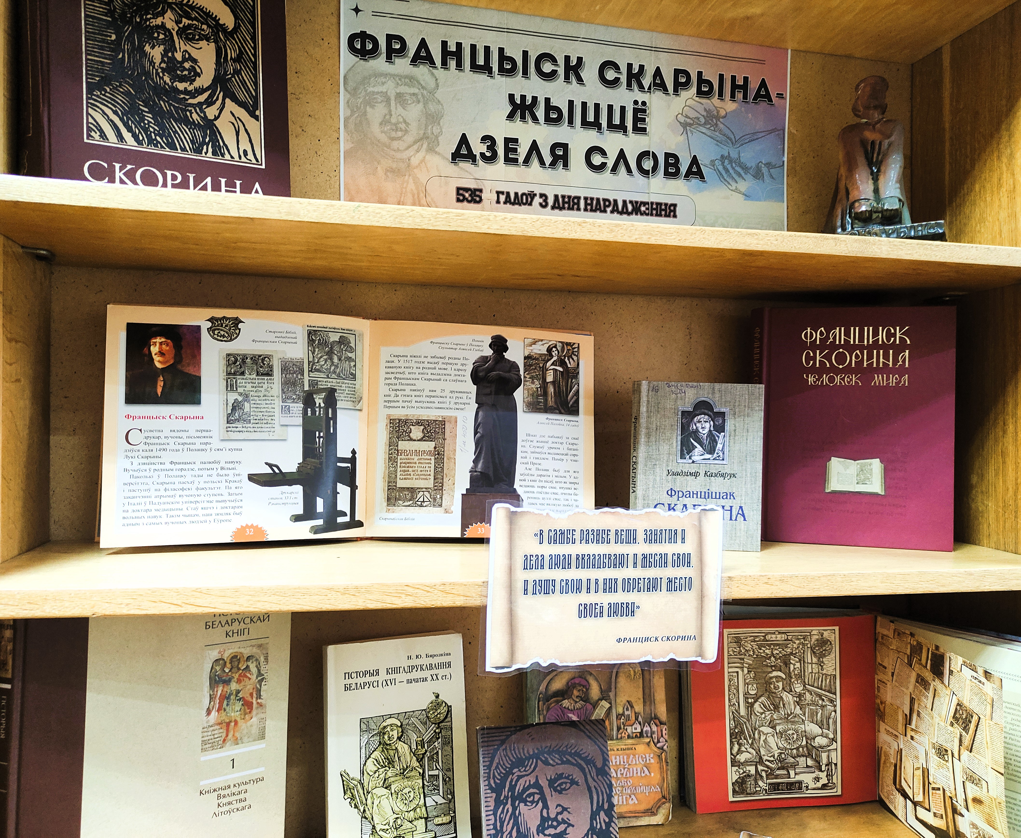 Вобраз ураджэнца Полацка, доктара медыцыны, першадрукара і выдаўца Бібліі, пісьменніка Францыска Скарыны з'яўляецца ці не самым вядомым сярод усіх беларусаў. З нагоды 535-годдзя з дня яго нараджэння, а таксама 500-годдзя выдання апошняй надрукаванай ім кнігі "Апостал", у цэнтральнай раённай бібліятэцы праводзіцца кніжная выстава "Францыск Скарына – жыццё дзеля слова".