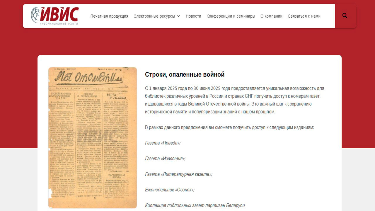 Доступ предоставляется с 1 января 2025 года по 30 июня 2025 года с рабочих мест библиотеки. Это уникальная возможность для пользователей получить доступ к номерам газет, издававшихся в годы Великой Отечественной войны. СМОТРЕТЬ
