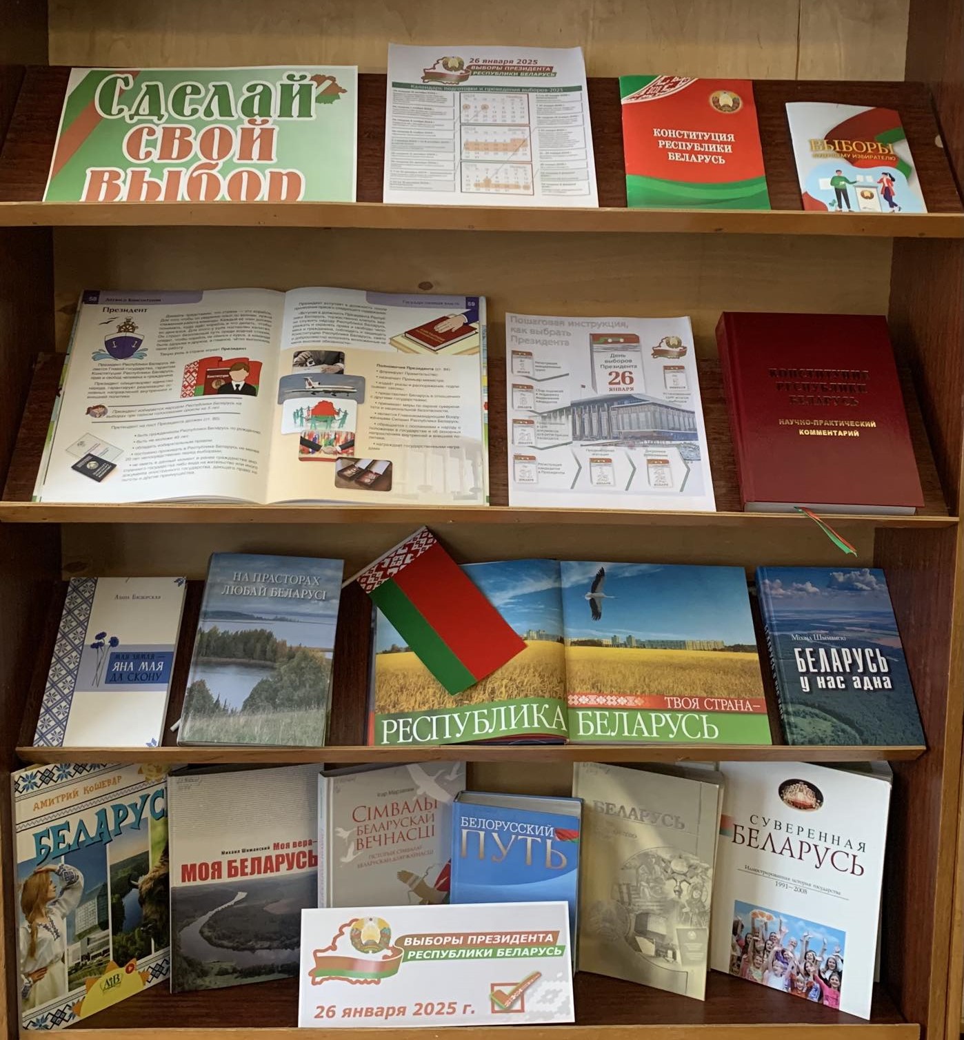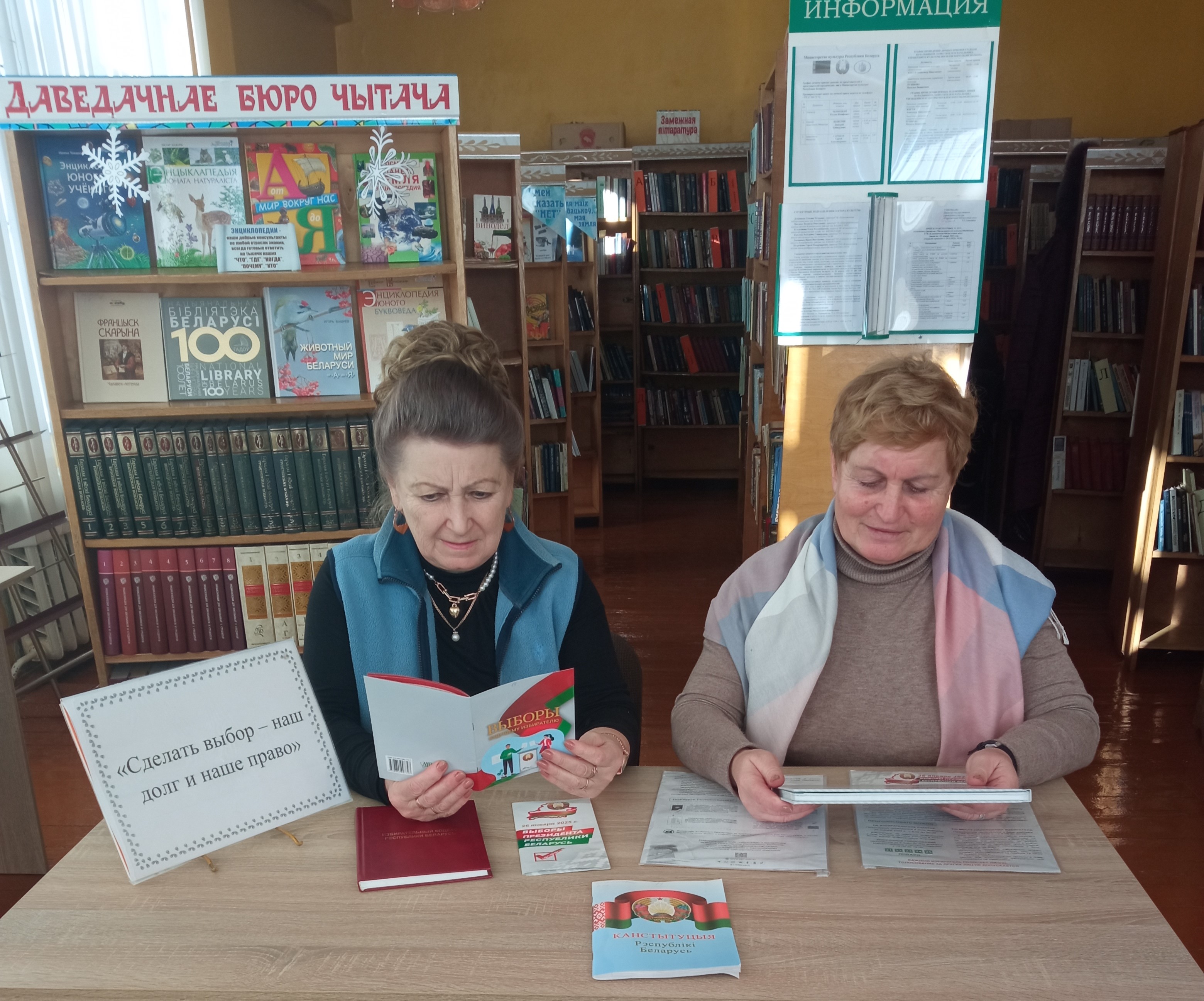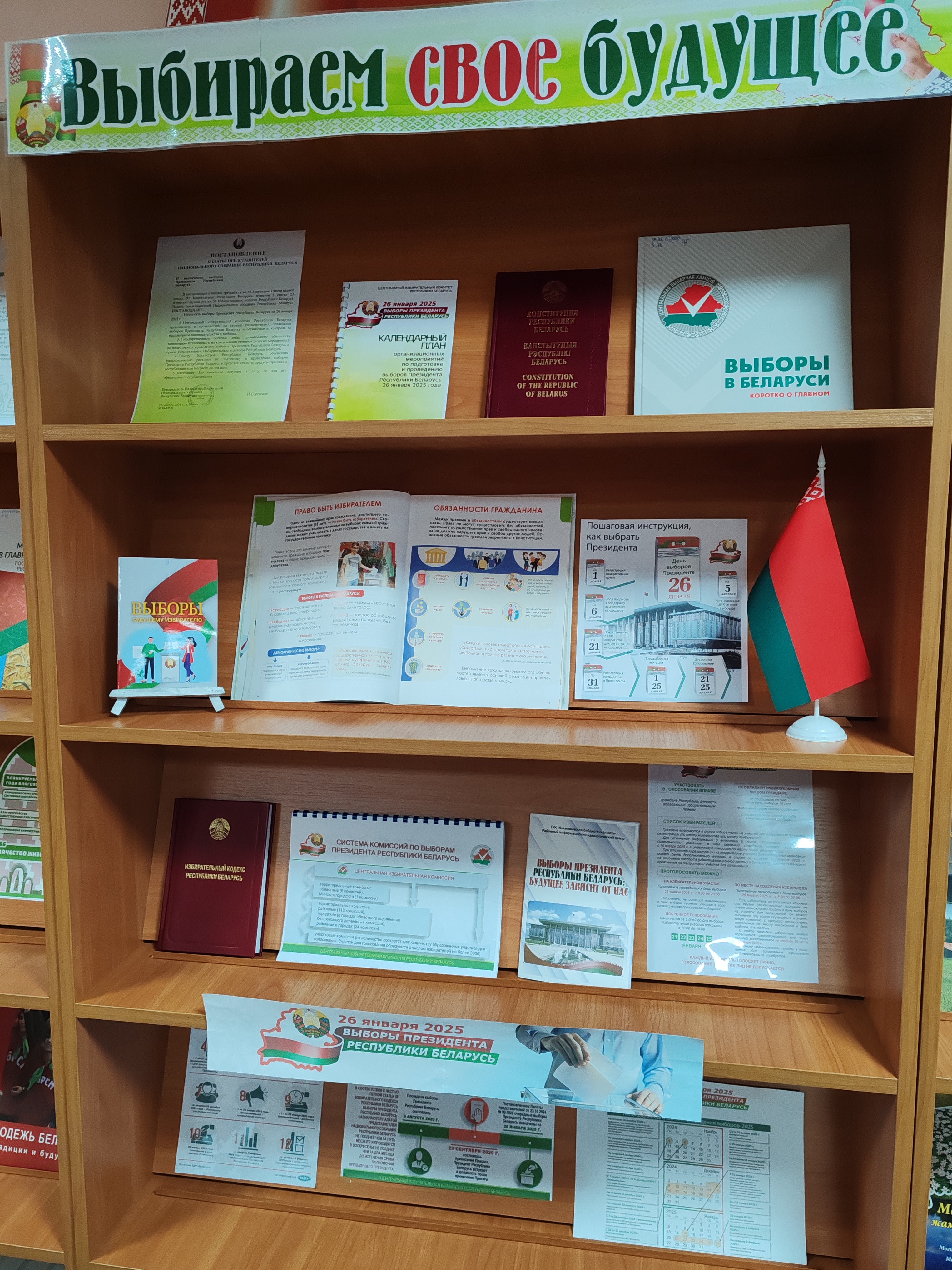 К этому событию во всех библиотеках района оформлены тематические выставки литературы и уголки в помощь избирателю: «Выбираем свое будущее» в центральной районной библиотеке, «Будущее создаем мы» в Барсуковской сельской библиотеке, «Сделай свой выбор» в городской библиотеке № 1, Лобжанской и Малышковичской сельских библиотеках, «Выборы 2025: важно знать» в Осмоловичской сельской библиотеке, «В помощь избирателю» – в Полошковской сельской библиотеке.
