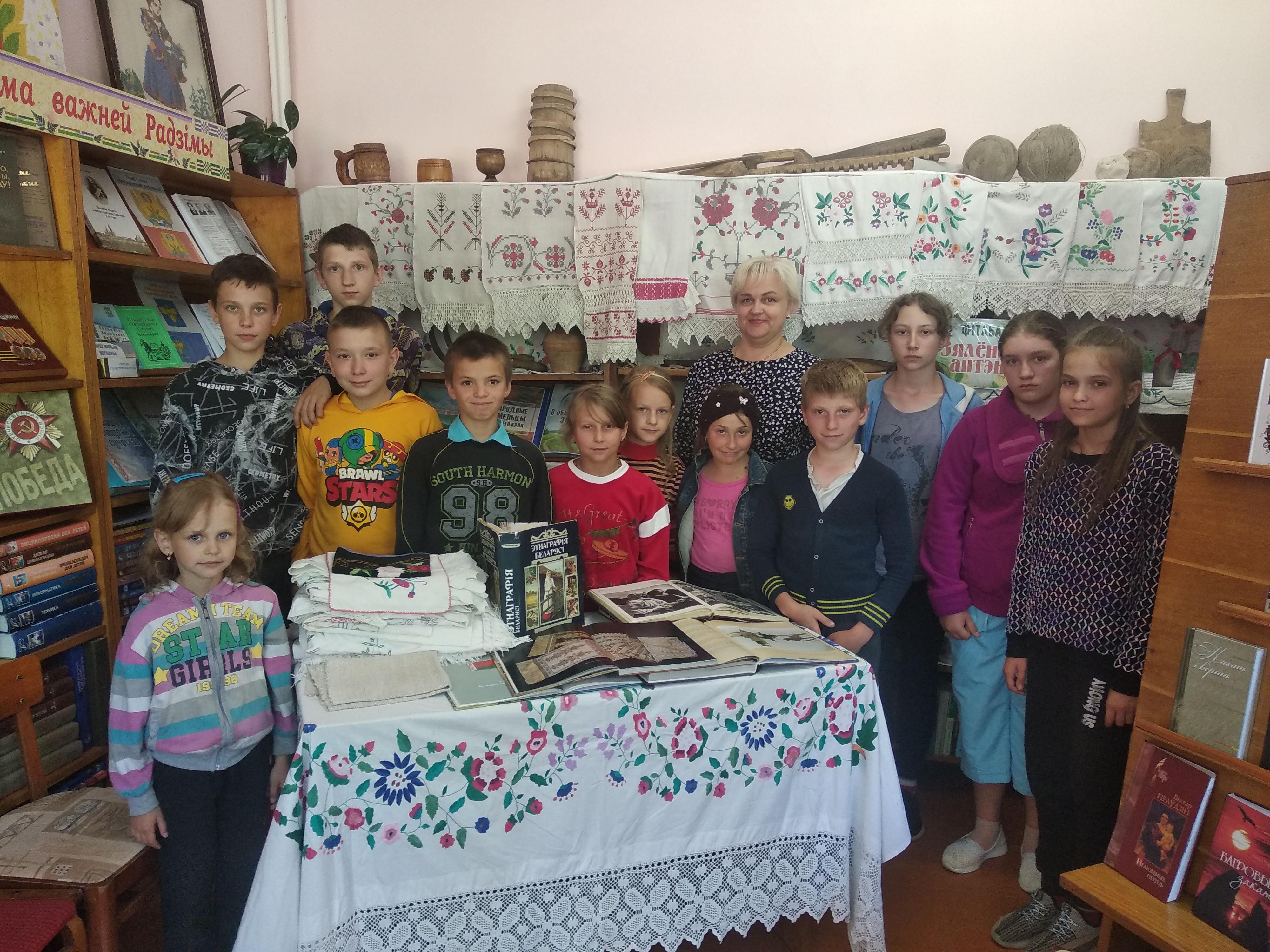 Библиотекарь пригласила юных читателей на выставку изделий ручной работы «З гісторыі вёскі і лесу людей», где представлена широкая коллекция рушников, предметов рукоделия, быта, собранная на территории Лобжанского сельского Совета. Никого не оставила равнодушным азбука белорусского орнамента: «Огонь», «Богатство», «Весна», «Земля», «Молодость». Было интересно найти соответствующий орнамент на рушнике и прочитать его.