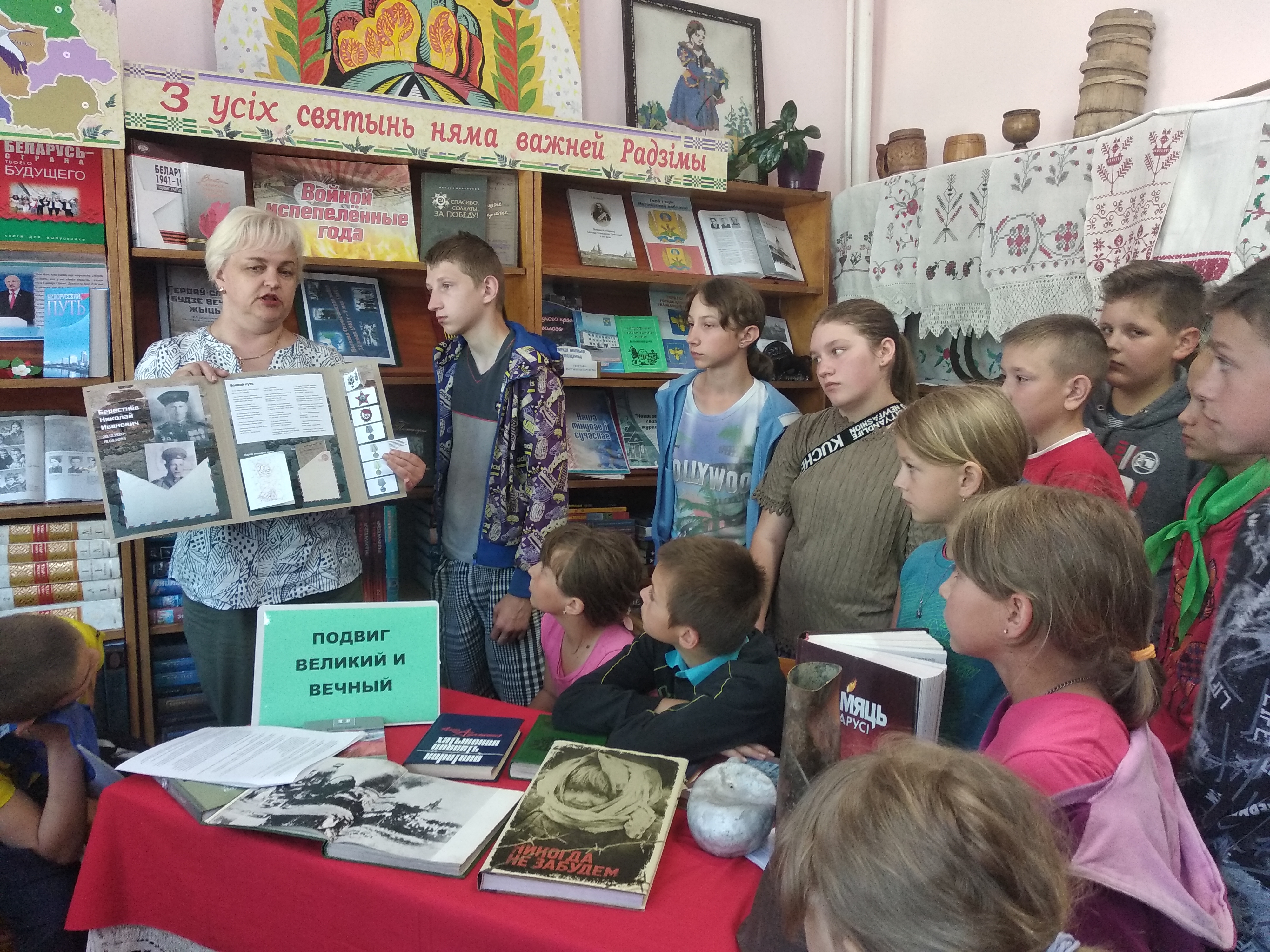 Библиотекари рассказали о трагедии белорусской деревни Хатынь, которая явилась отражением трагедии всего белорусского народа в годы военного лихолетья. Рассказ сопровождался видеопрезентацией. Ребята прослушали отрывки из сохранившихся писем и сами смогли сложить письмо-треугольник, посмотрели отрывок из поэмы Александра Твардовского, а также приняли участие в заданиях «Меткий стрелок», «Через линию фронта», «Марш-бросок» и исполнили легендарную песню «Катюша». В завершении мероприятия участники зажгли свечу памяти и вспомнили всех тех, кто боролся за наше свободное и счастливое будущее.