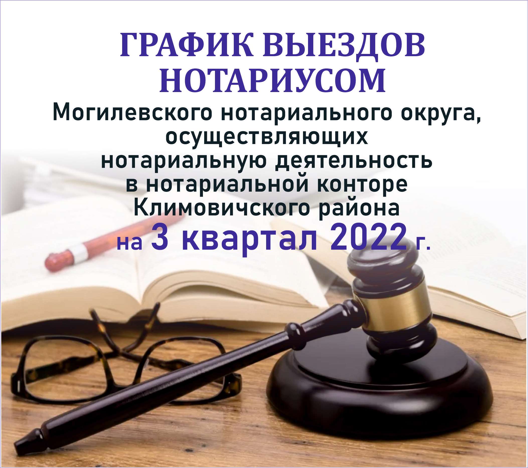 Предлагаем познакомиться с графиком выездов нотариусов Могилевского нотариального округа, осуществляющих нотариальную деятельность в нотариальной конторе Климовичского района на 3 квартал 2022 г. СМОТРЕТЬ