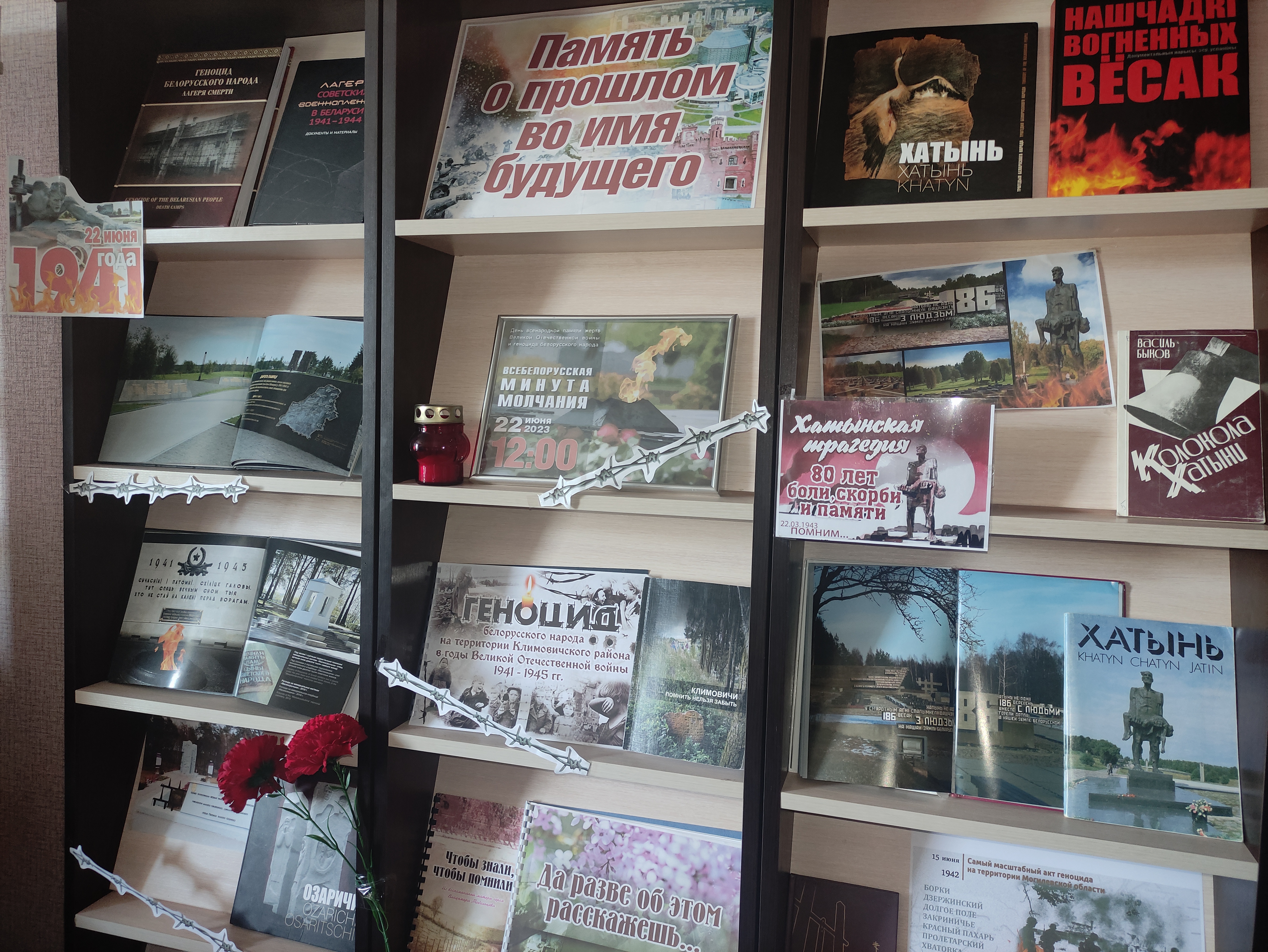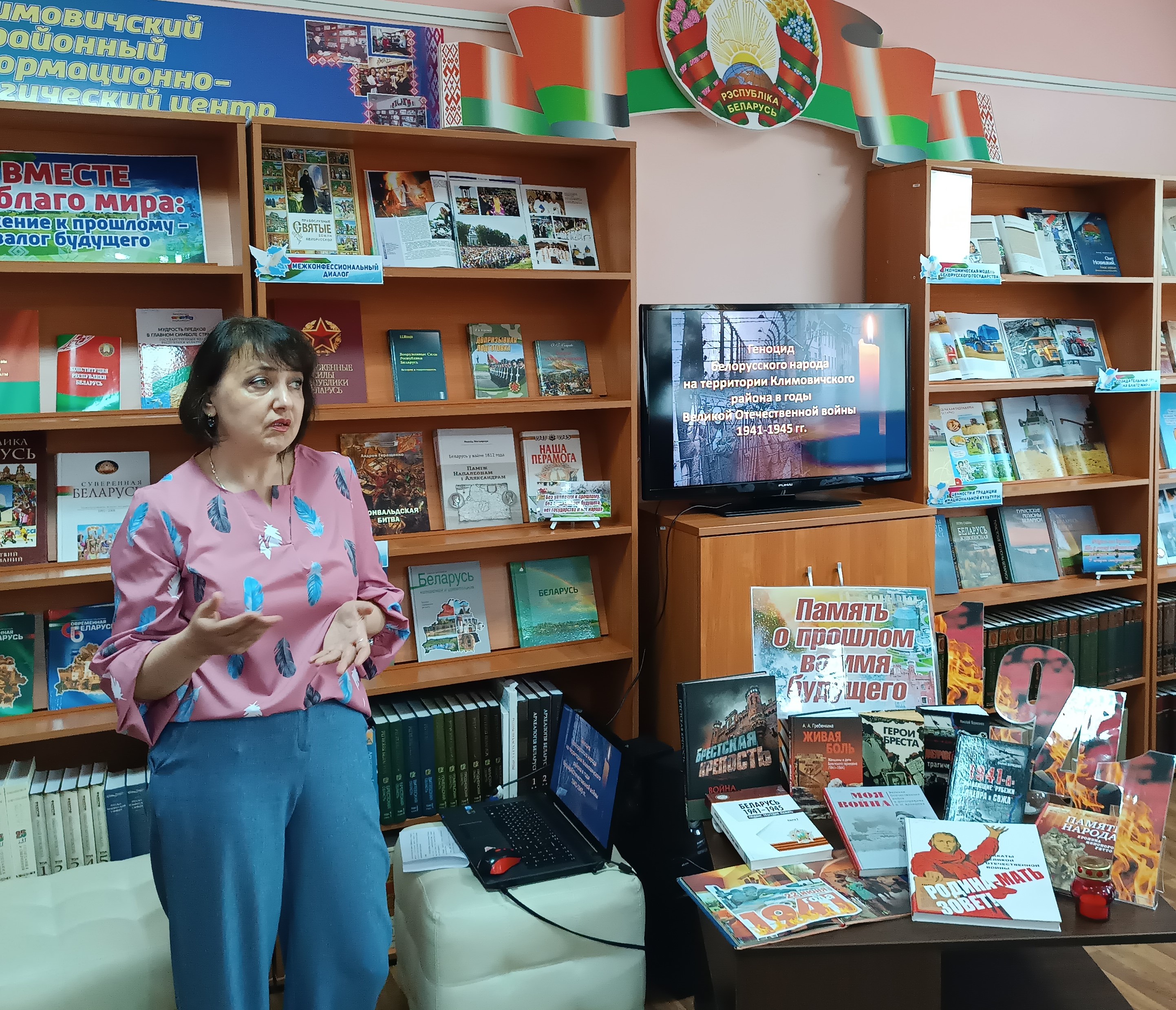 Библиотекари Климовичского района проводят патриотические мероприятия по систематизации исторического прошлого страны, сохранению историко-культурного наследия нашего края и увековечению героического прошлого белорусского народа. В каждой библиотеке созданы тематические экспозиции на тему «Историческая память: геноцид белорусского народа». На выставках представлены историко-документальная литература, художественные произведения, документы, краеведческие материалы, посвященные памяти жертв геноцида белорусского народа в годы Великой Отечественной войны.