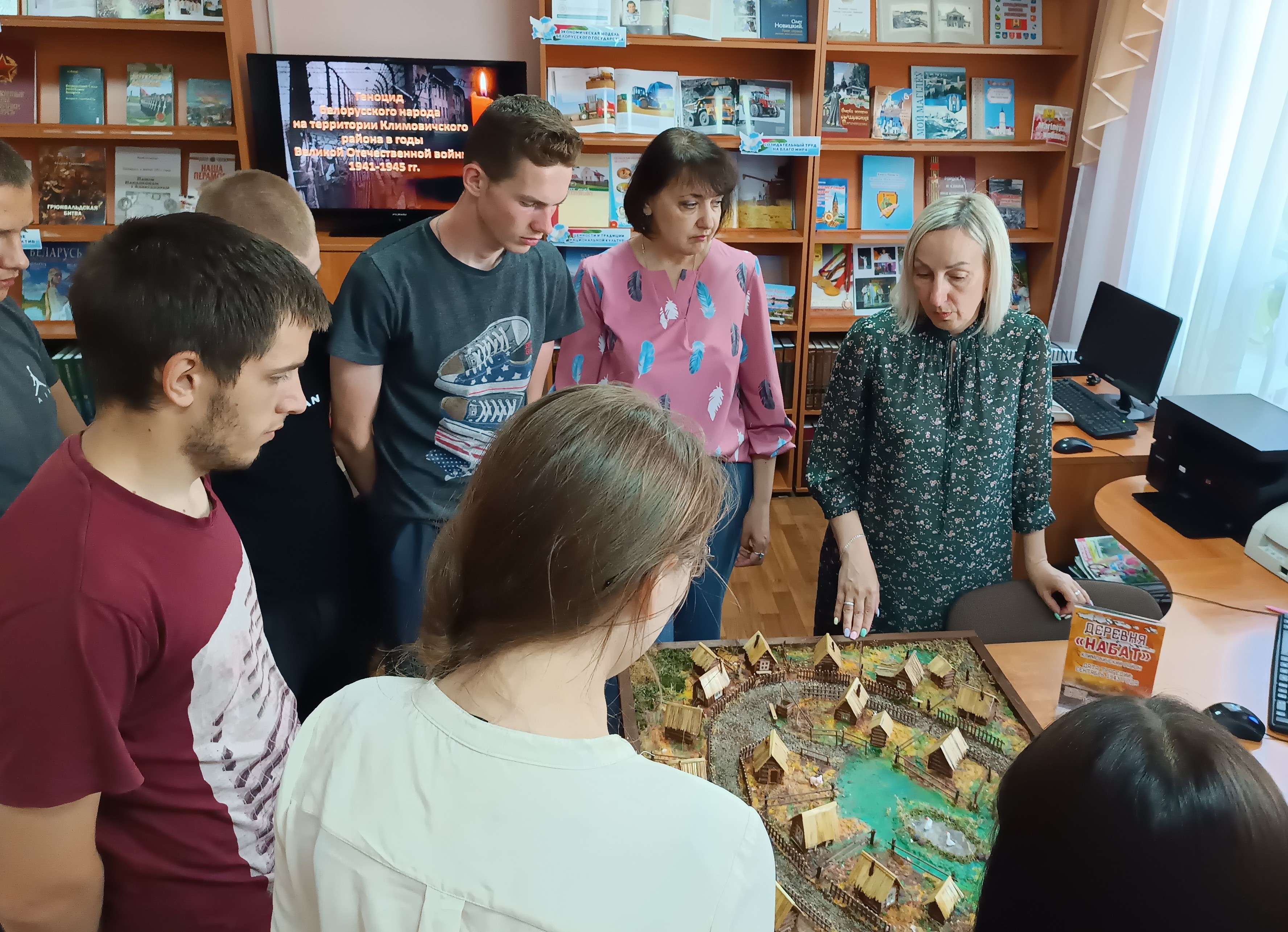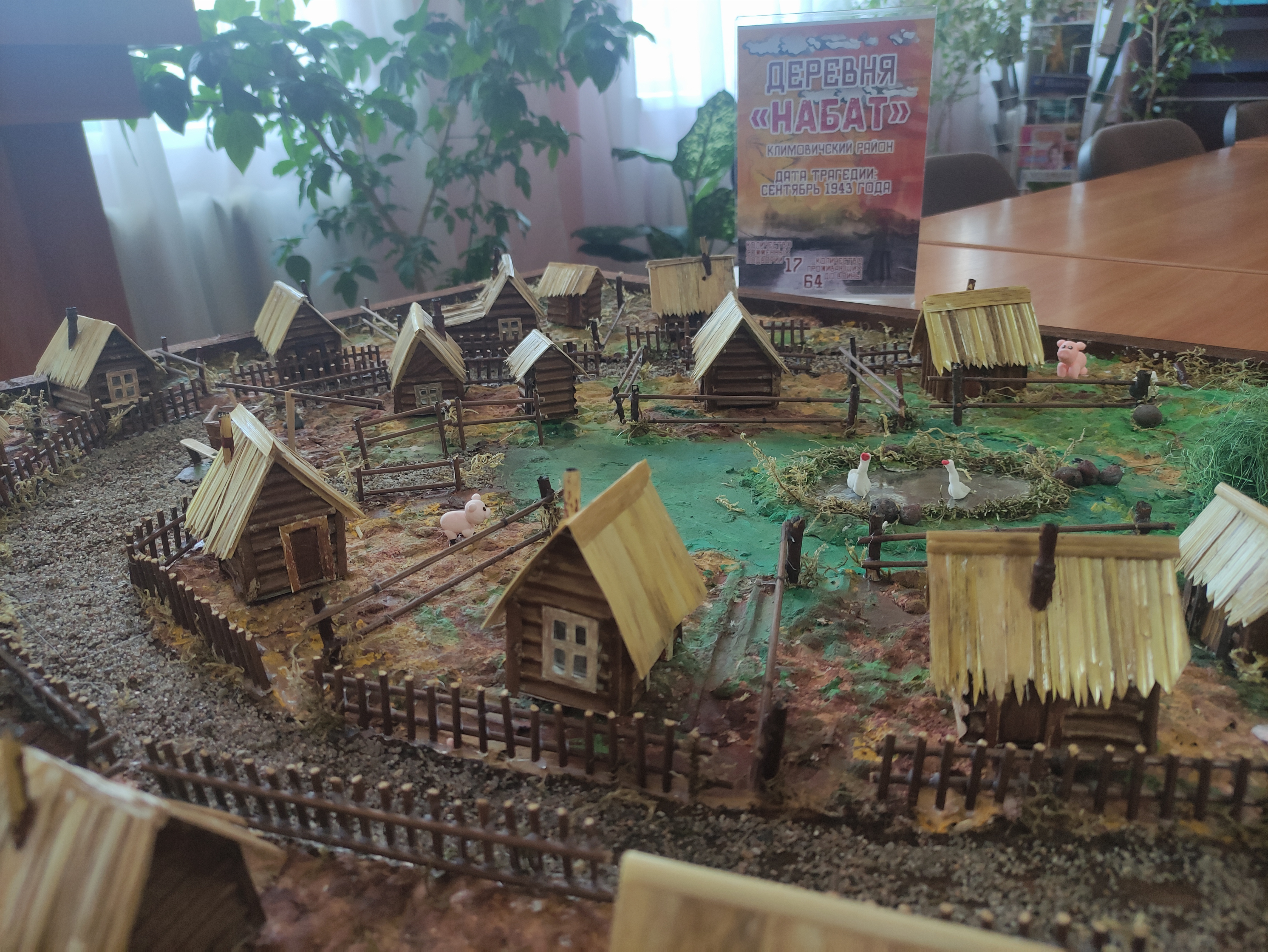Состоялся просмотр электронной презентации посвященной теме геноцида белорусского народа на территории Климовичского района в годы Великой отечественной войны, а также вниманию присутствовавших был представлен макет сожженной деревни «Набат» (Климовичский район), подготовленный в центре дополнительного образования детей и молодежи.