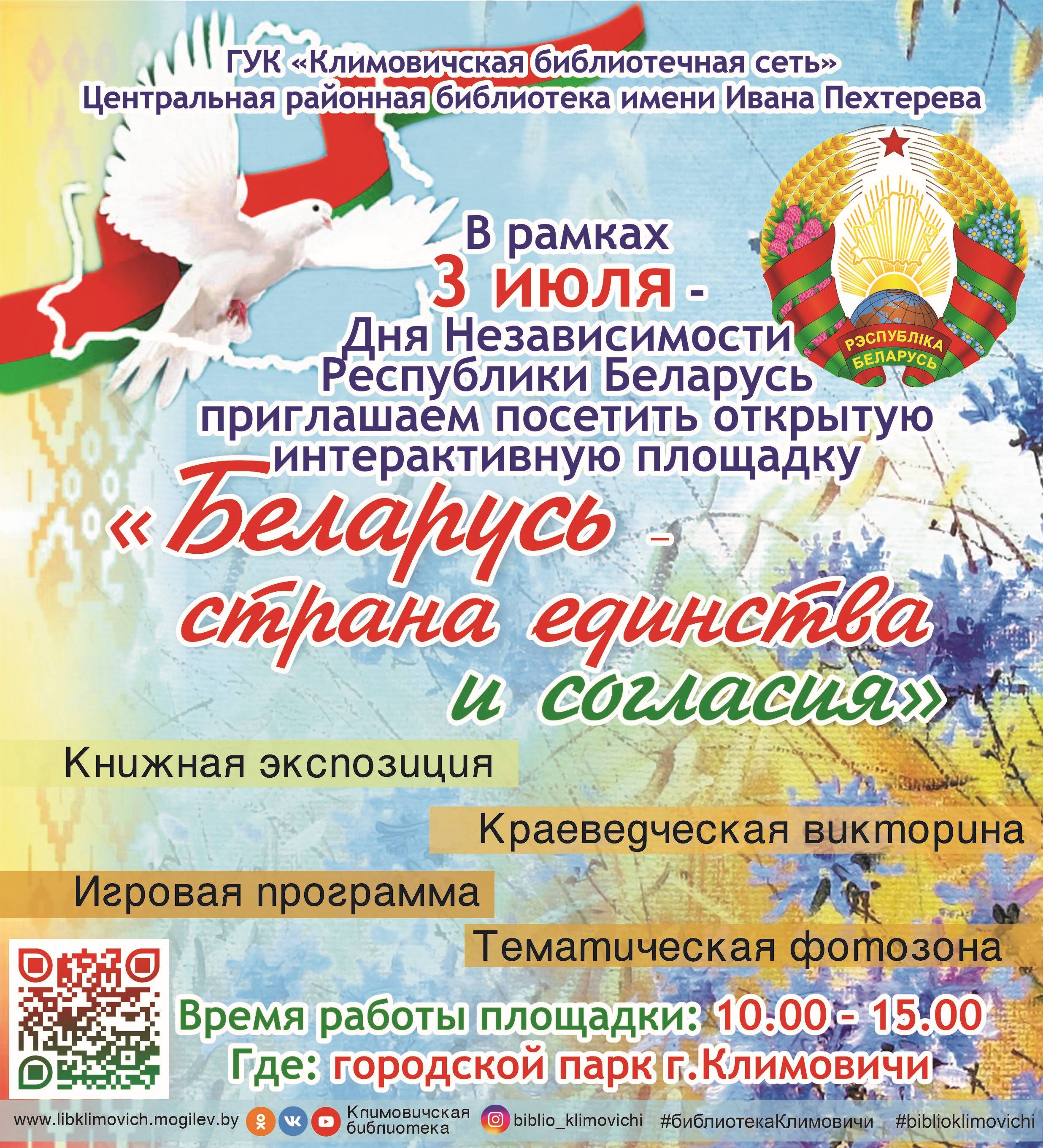 Центральная районная библиотека приглашает 3 июля на открытую интерактивную площадку «Край мой светлы, мая Беларусь», посвященную Дню Независимости Республики Беларусь.
