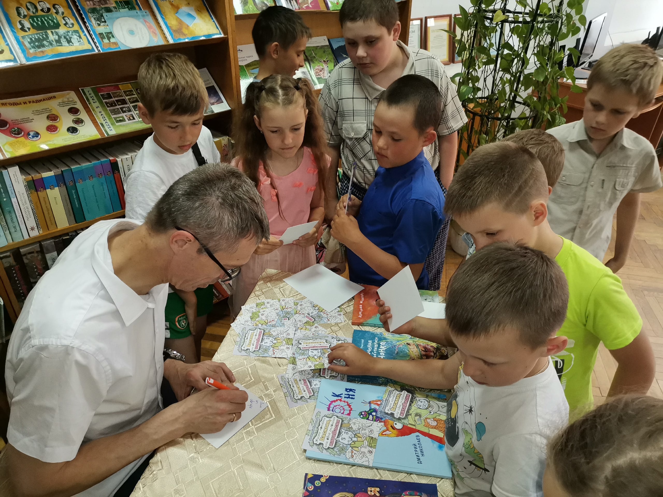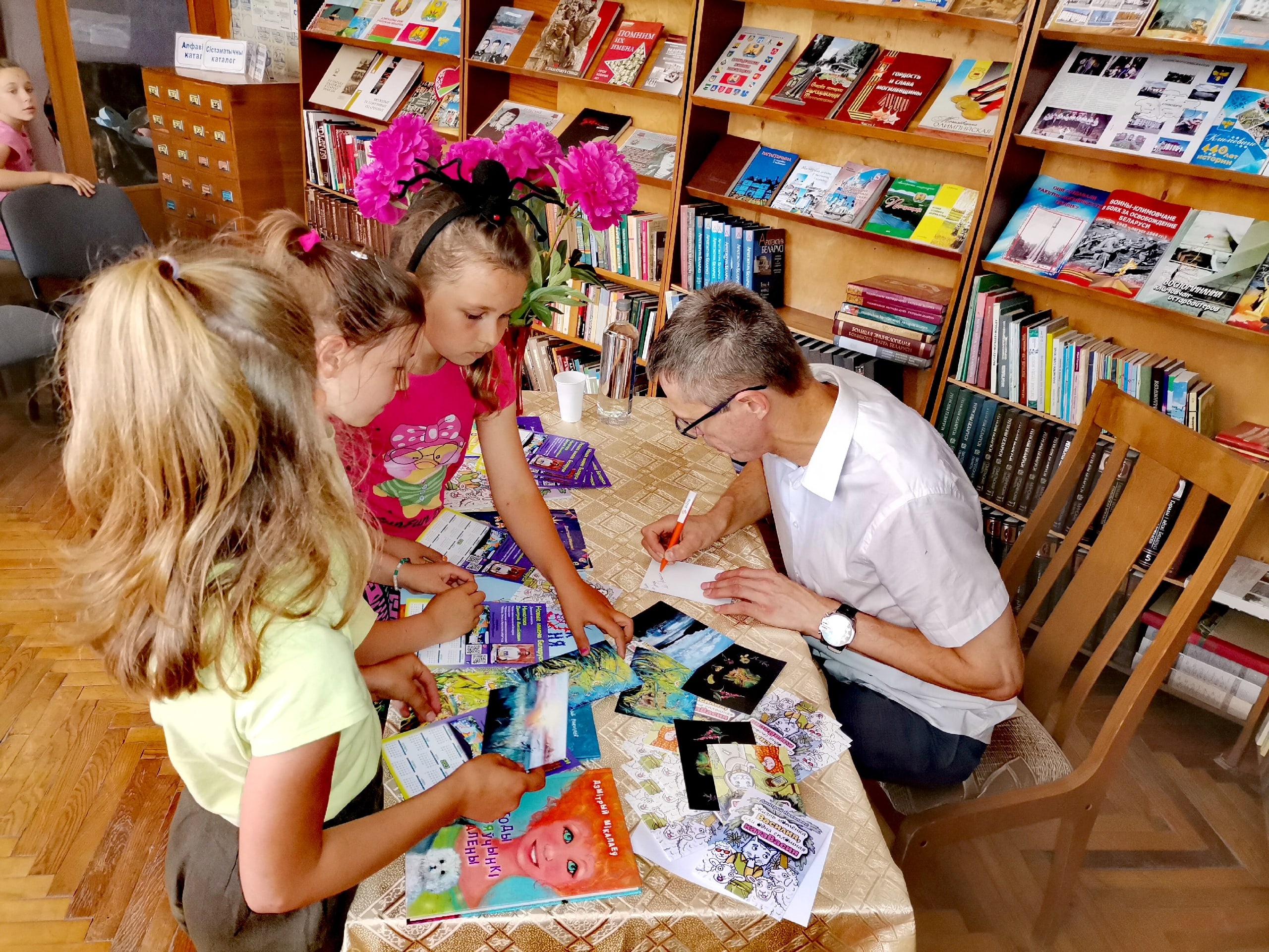 Ребята с удовольствием знакомились с книгами писателя, задавали вопросы, участвовали в литературной викторине. Все участники мероприятия получили открытки с автографом автора и много положительных эмоций, детям очень понравилась встреча и они задавали много вопросов автору.