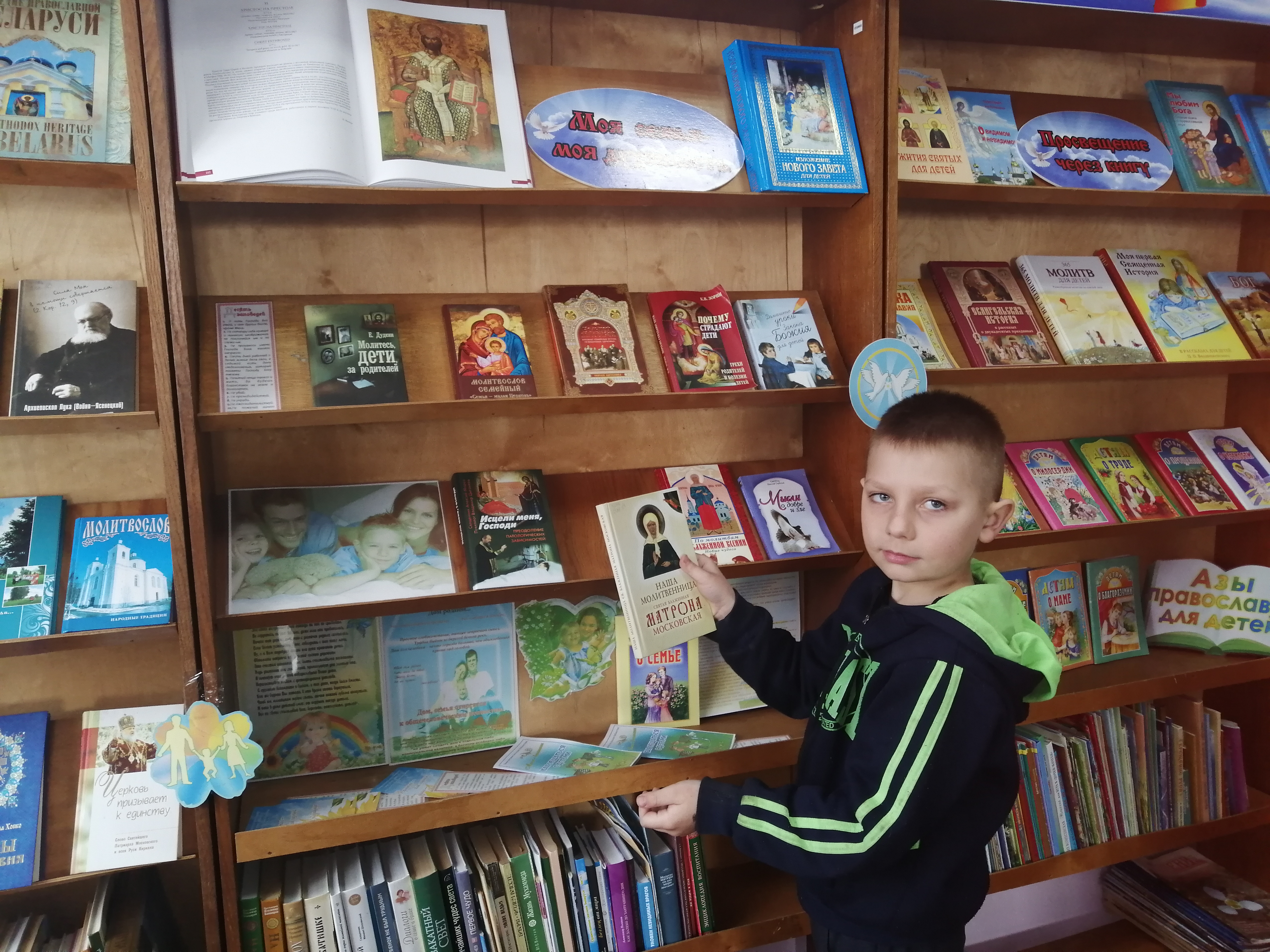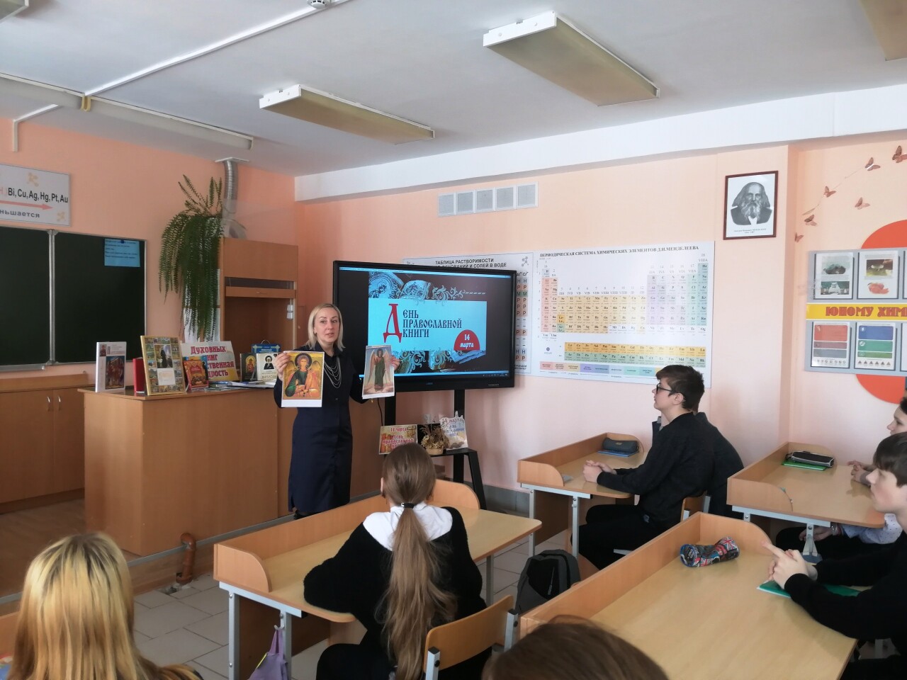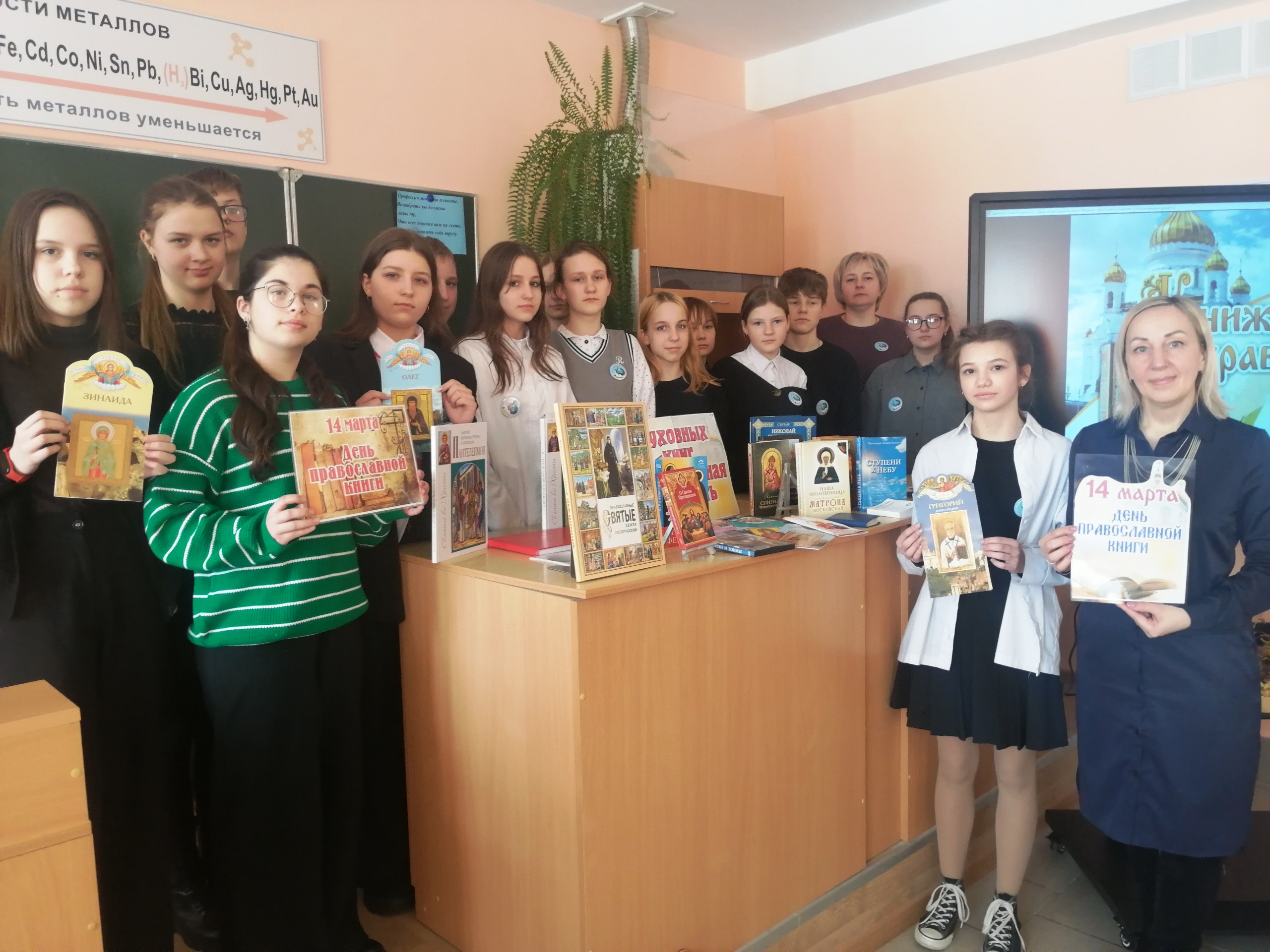 Сотрудники центральной районной библиотеки для учащихся 7 класса средней школы № 3 провели урок православия «Православная книга в современном мире». Библиотекарь рассказала об истории возникновения праздника, о первопечатниках Иване Федорове и Петре Мстиславце, о первой печатной книге «Апостол», о ее уникальных достоинствах. Учащиеся узнали о значении духовной литературы в жизни православного человека. Была организована выставка православных книг «Духовных книг Божественная мудрость». Ребята с большим интересом рассмотрели журналы московской патриархии 1949-1960 годов издания, полистали старинную Псалтирь со страницами рукописного текста, удивились черно-белым фотографиям, на которых узнали нашу Свято-Михайловскую церковь.