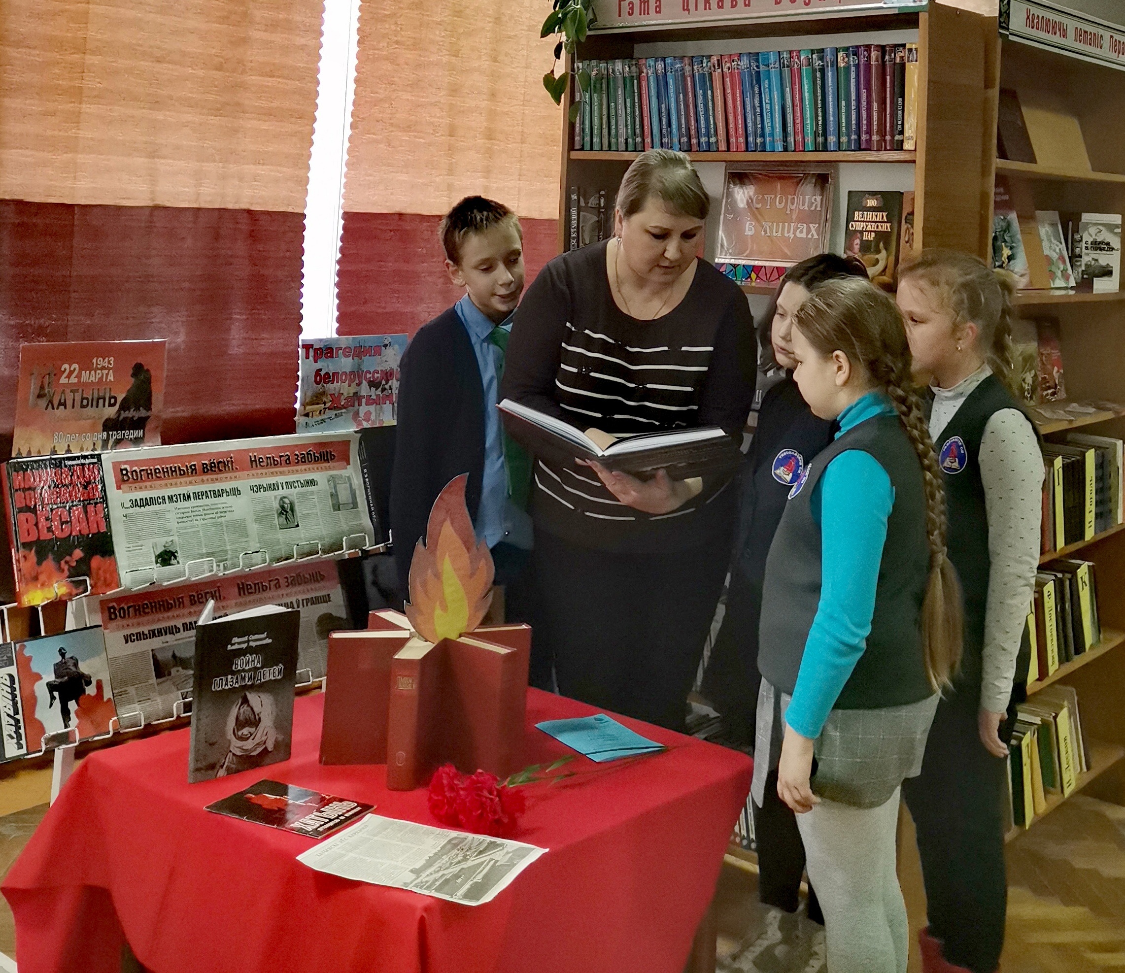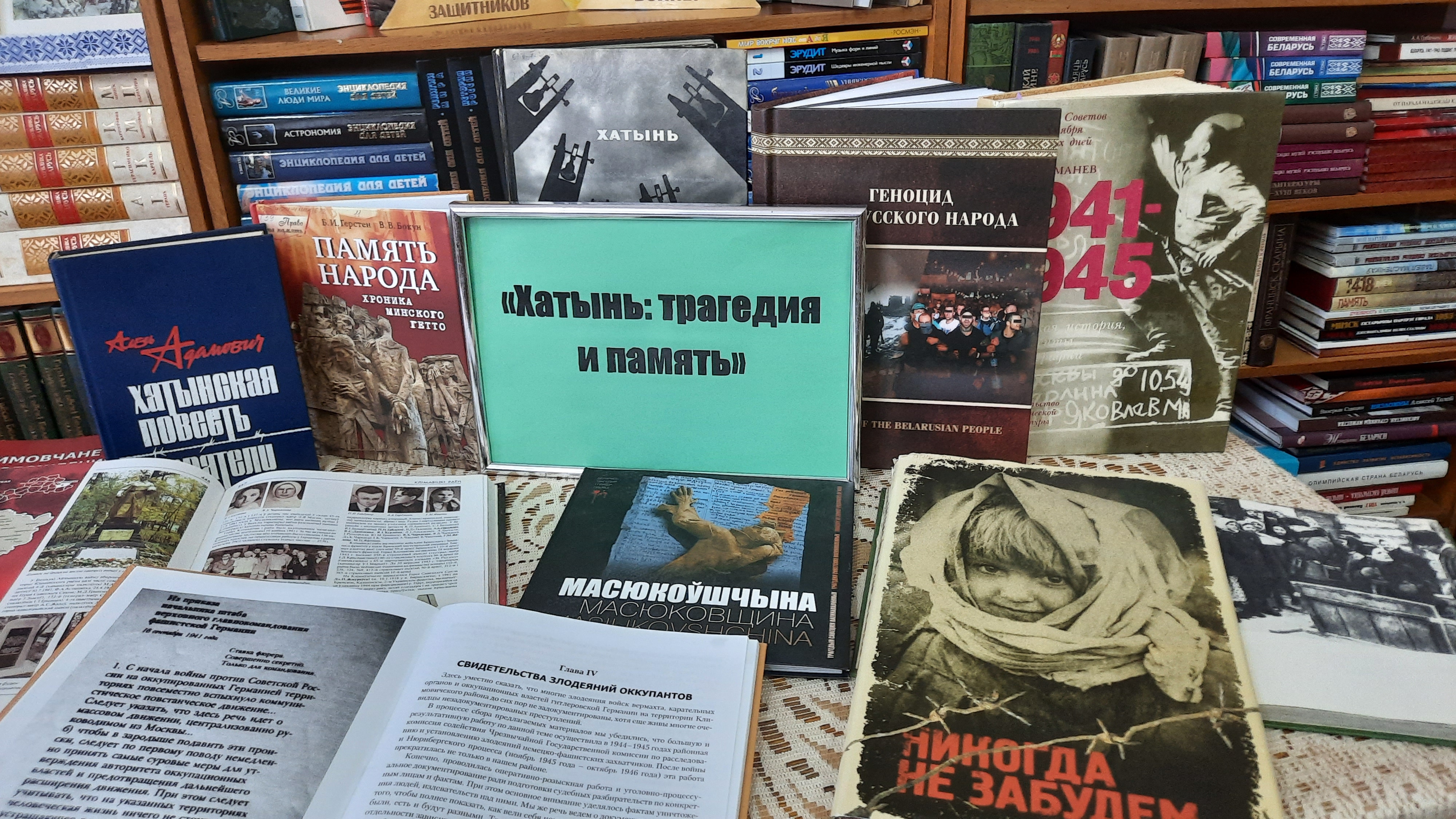 На тематической выставкой «Трагедия белорусской Хатыни» представлены книги, фотоальбомы, периодические издания, которые передают скорбь и застывшую боль трагедии холодного марта 1943 года. Познакомившись с книгами и документами выставки, невольно становишься свидетелем зверств фашизма и целенаправленной политики геноцида по отношению к населению Беларуси.