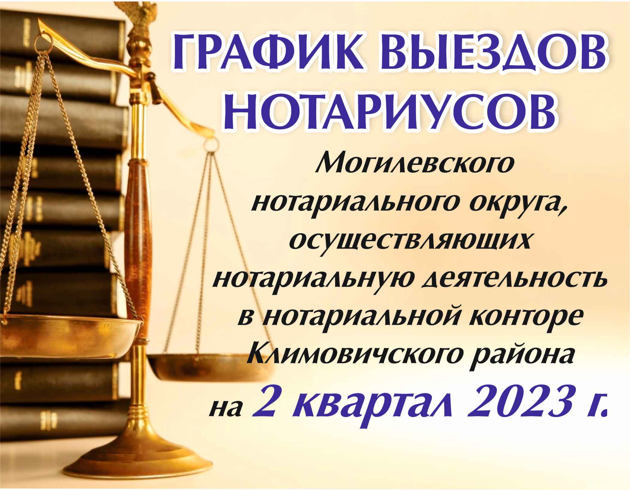 Предлагаем познакомиться с графиком выездов нотариусов Могилевского нотариального округа, осуществляющих нотариальную деятельность в нотариальной конторе Климовичского района на 2 квартал 2023 г. СМОТРЕТЬ