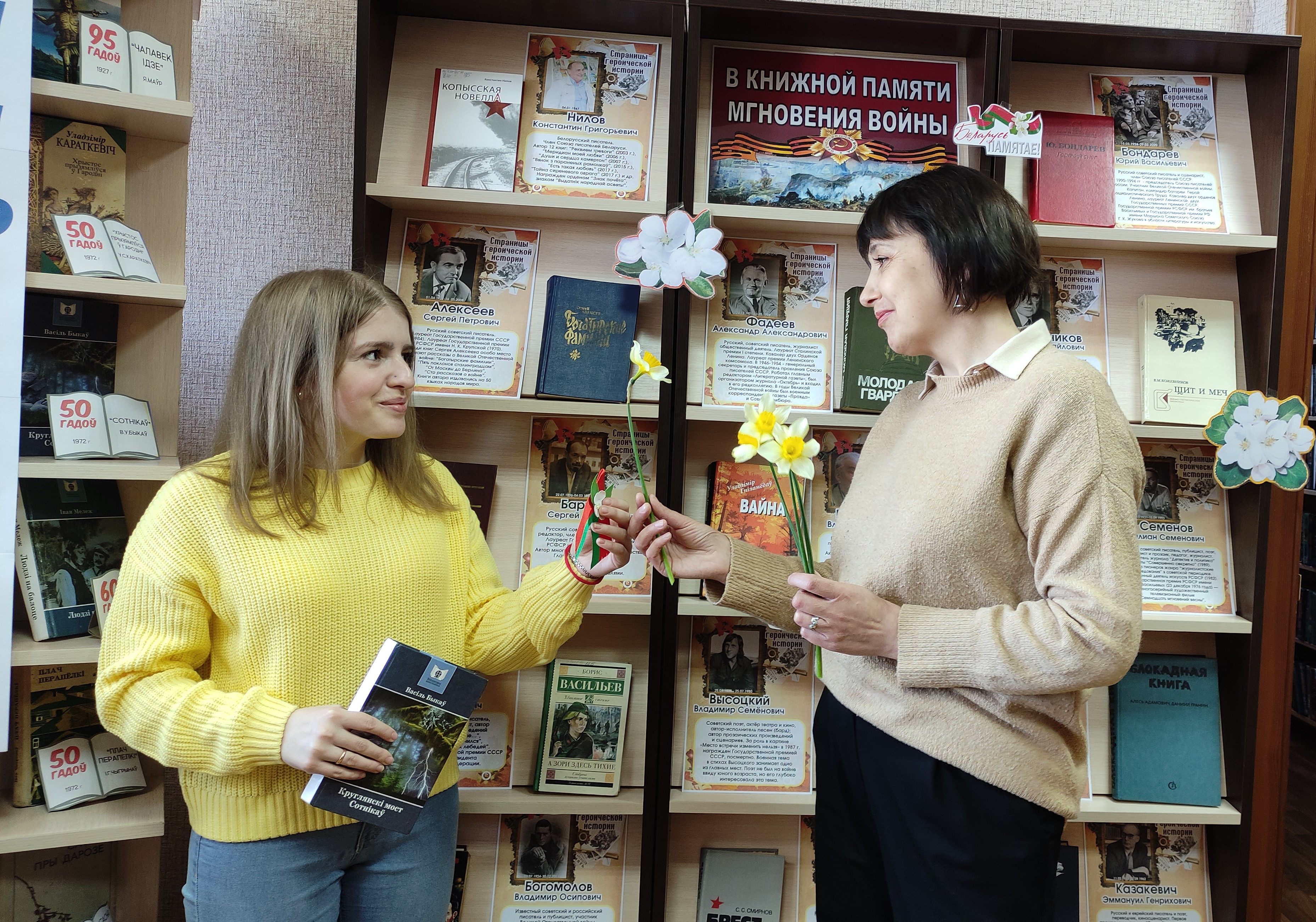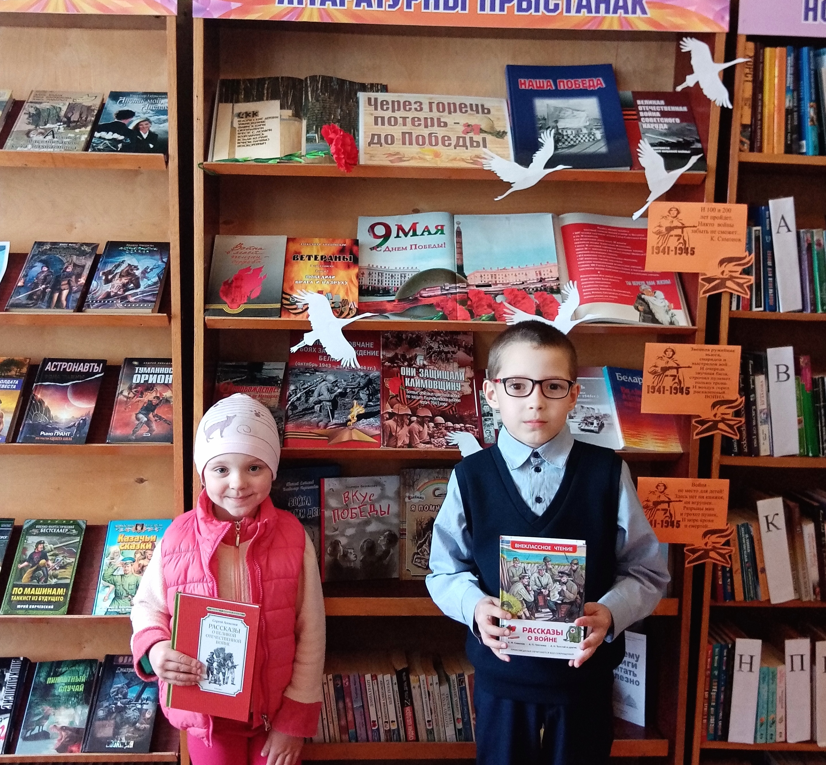 На абонементе для своих читателей библиотекари организовали патриотическую акцию «Цветы Победы», книжную эспозицию «В книжной памяти мгновения войны», литературный обзор книг о войне. Здесь представлены лучшие художественные произведения о войне, проза и поэзия как белорусских, так и русских авторов: Константина Симонова, Виктора Астафьева, Александра Твардовского, Бориса Васильева, Василия Быкова, Алеся Адамовича, Ивана Шамякина и других писателей-фронтовиков.