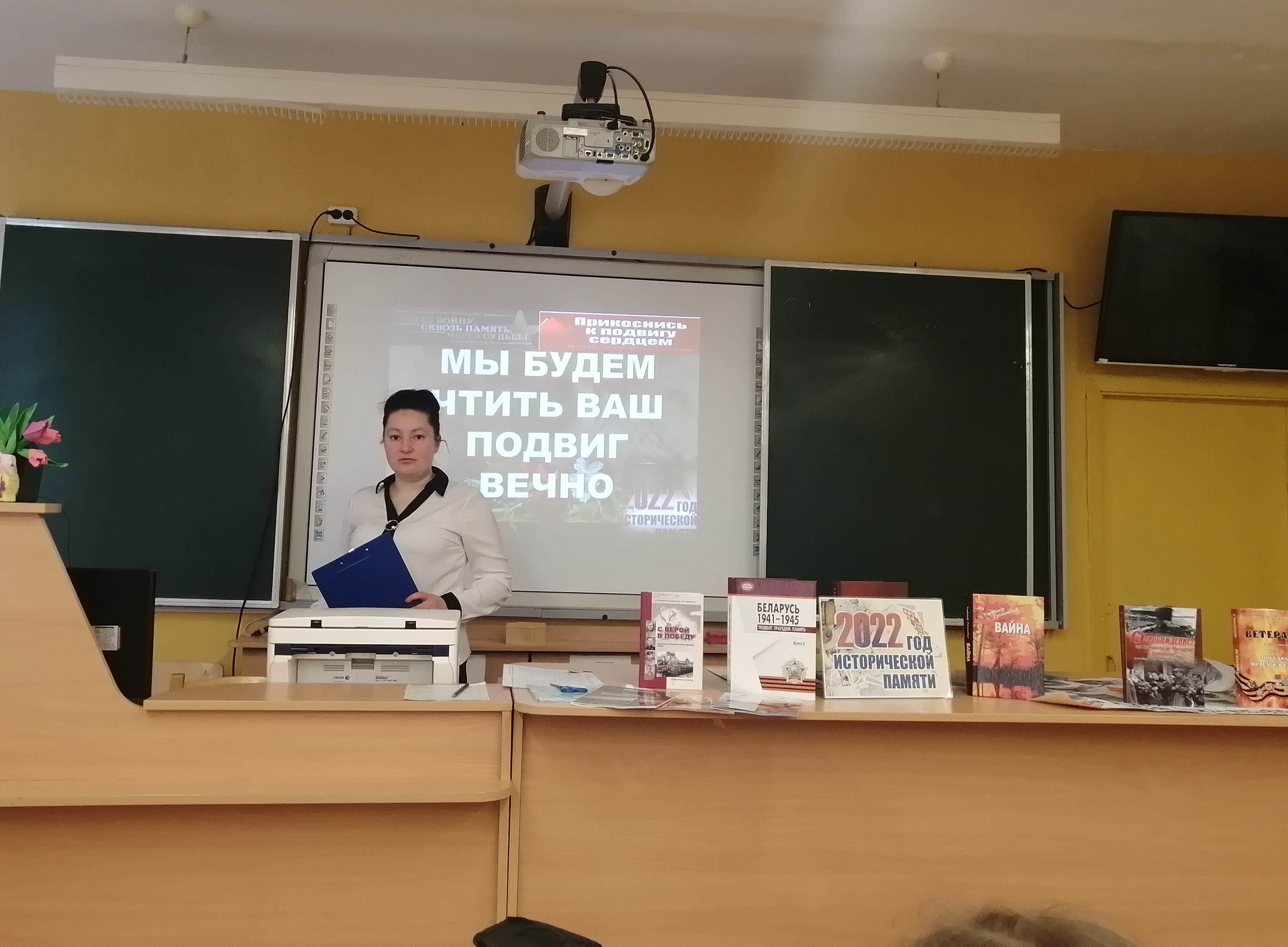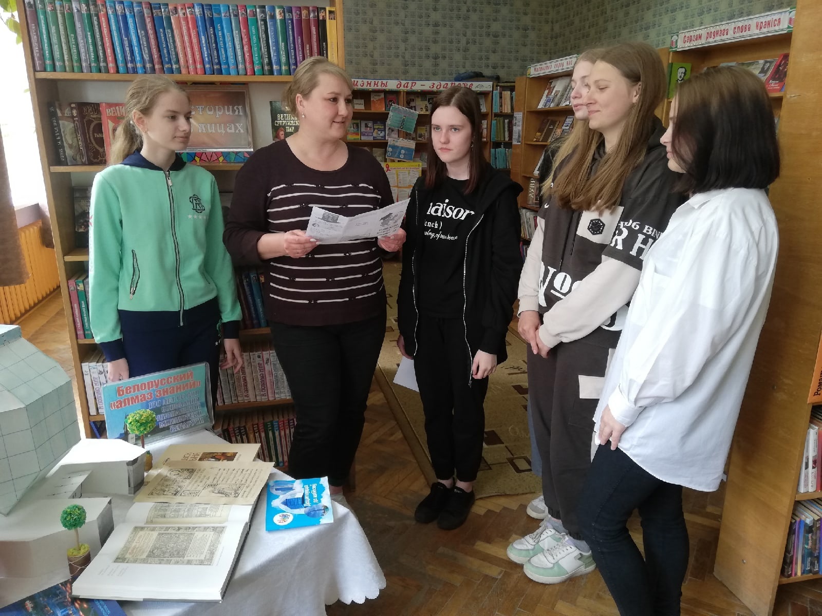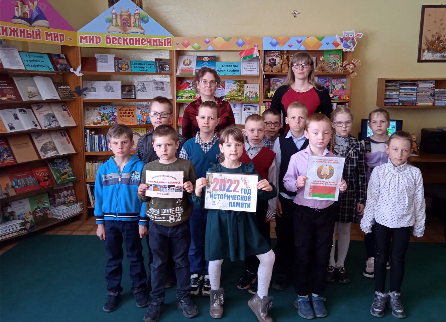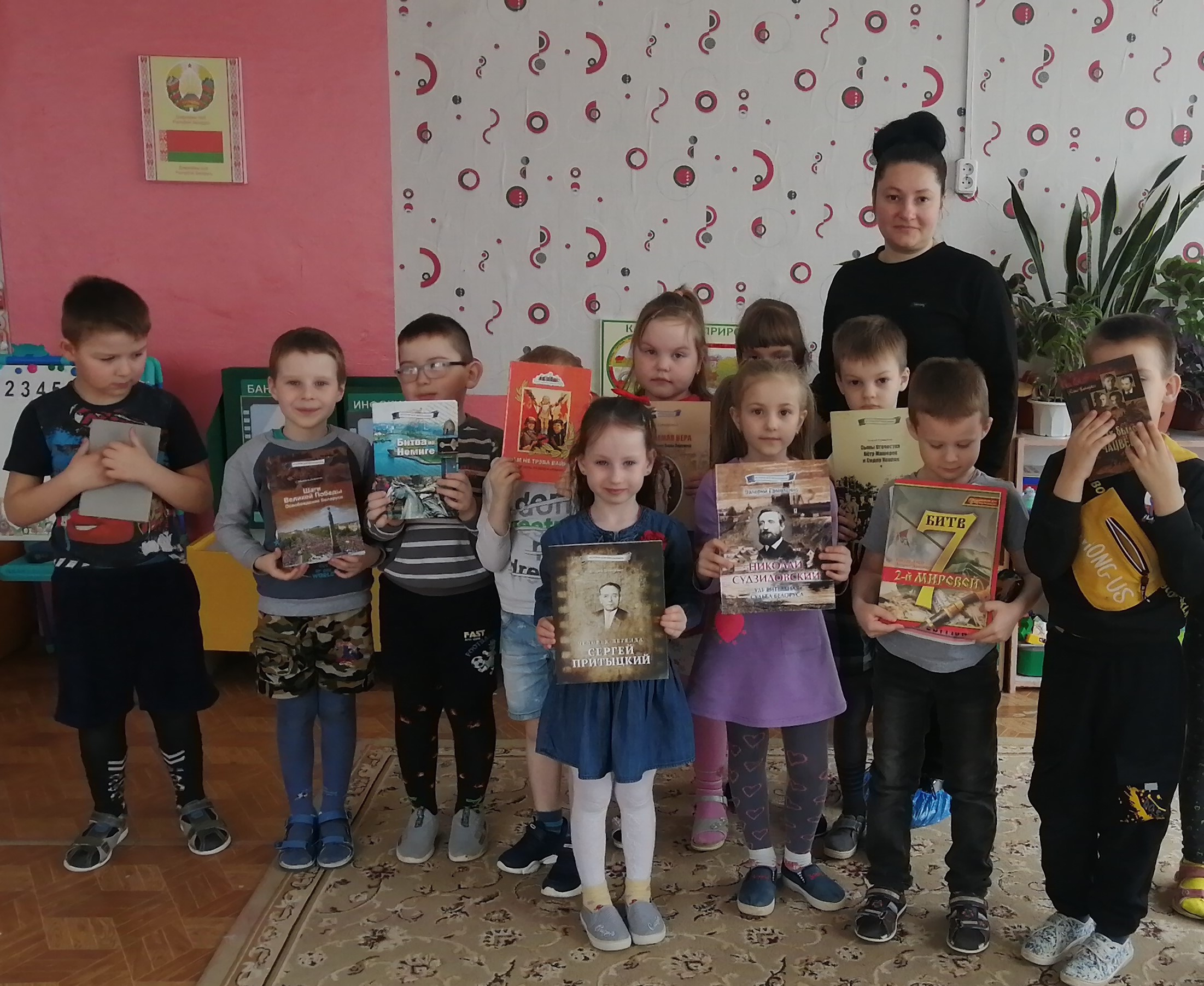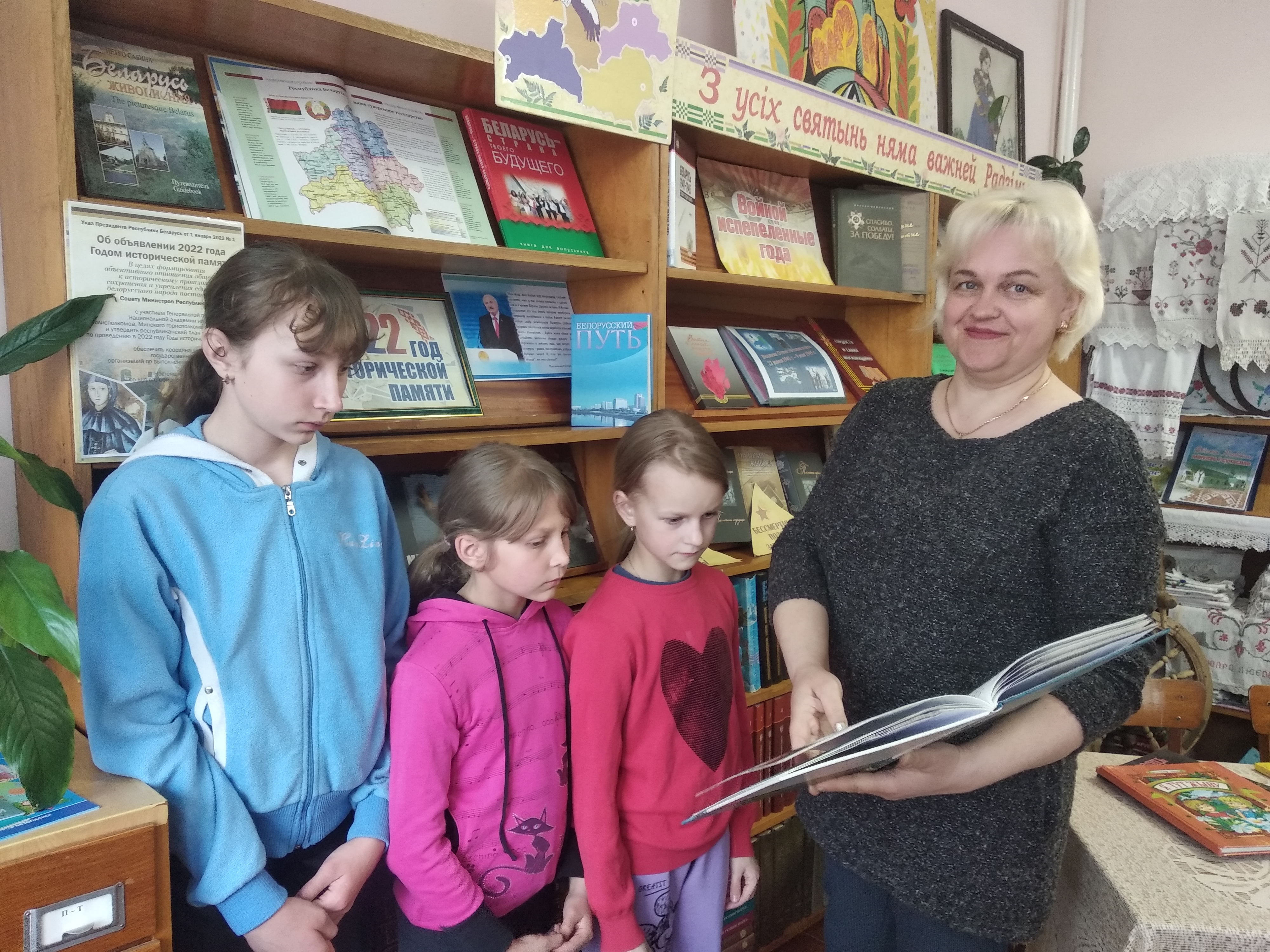 Ребятам показали слайд-презентацию и провели обзор выставки-экспозиции «Гордая память истории», на которой представлены книги, справочные и иллюстрированные издания о великих достижениях и победах белорусского народа.