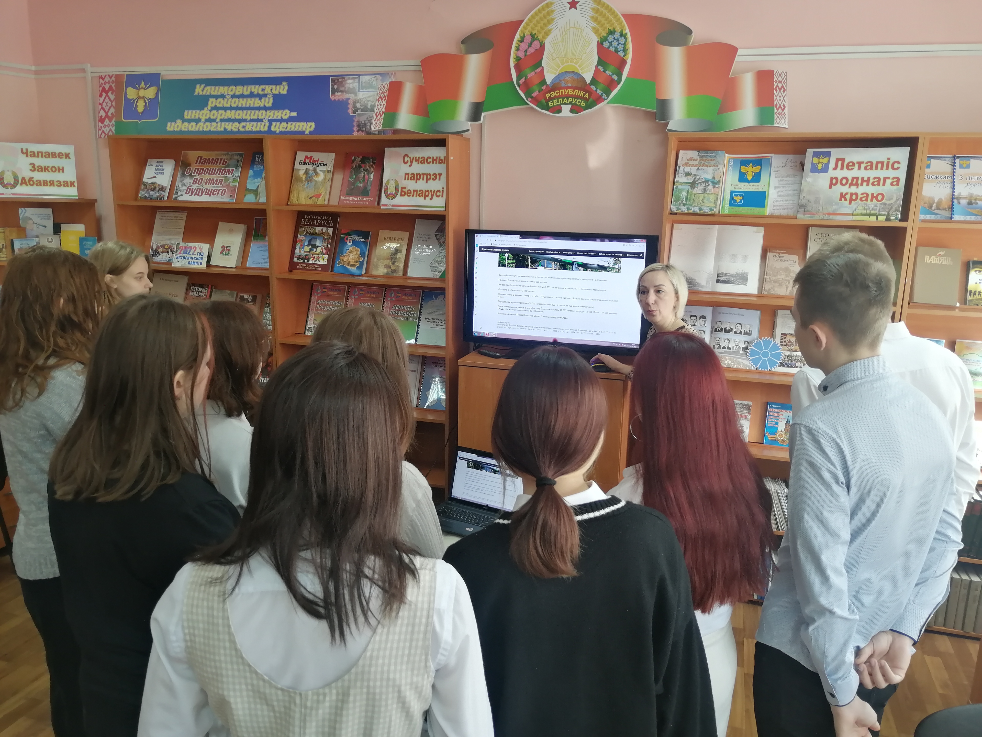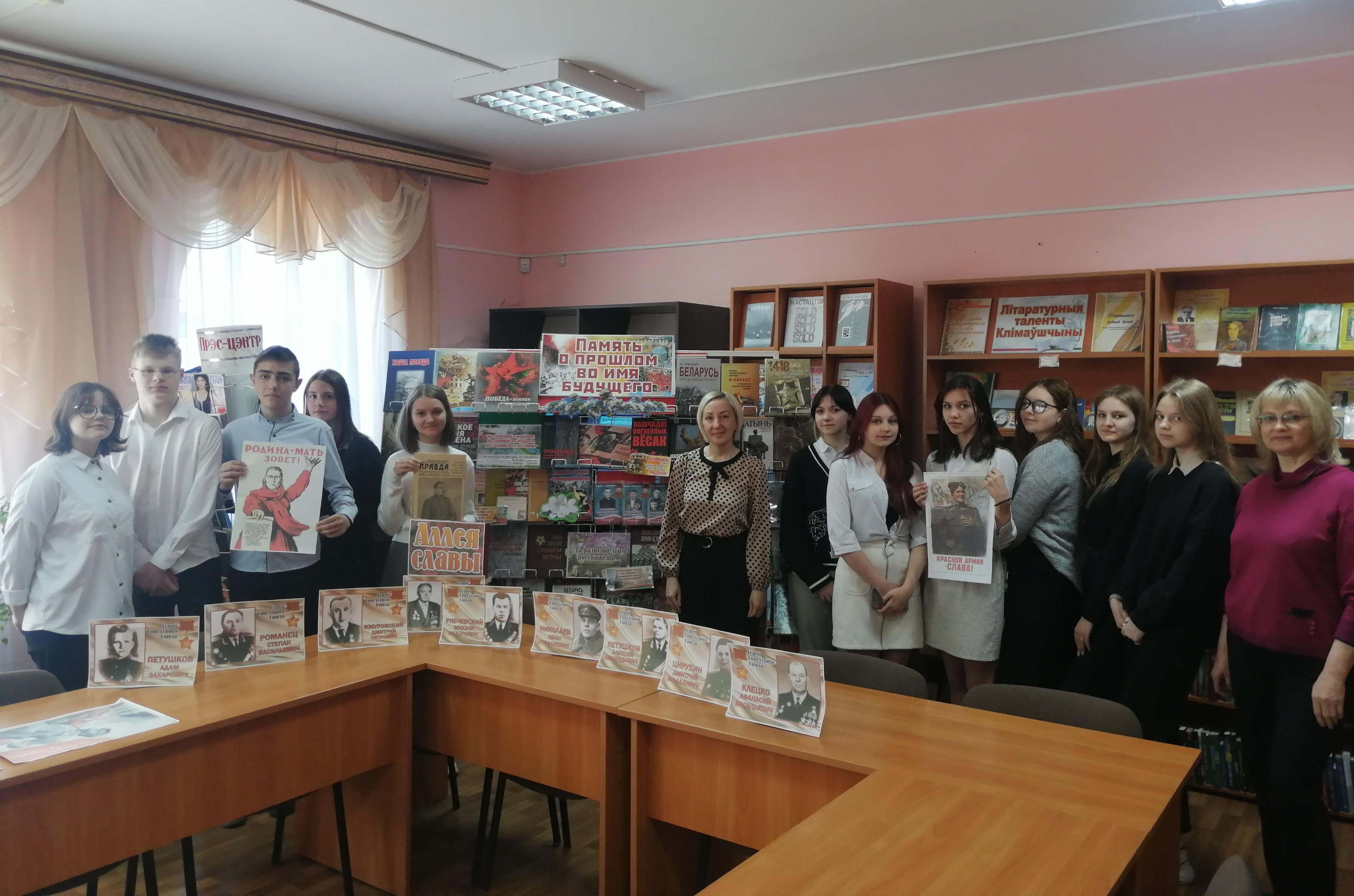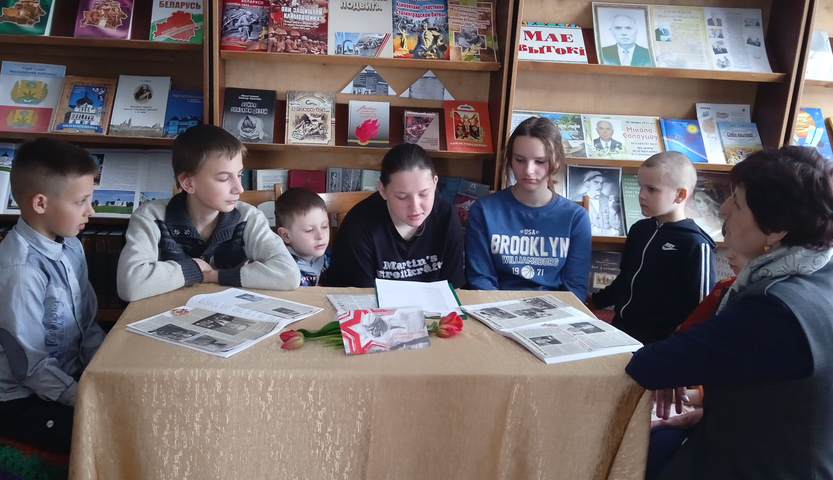 Сотрудники городской библиотеки №2 для учащихся 5-х классов районной гимназии провели урок памяти «Мы будем чтить ваш подвиг вечно». Ребята узнали о событиях военных лет, познакомились с порталом библиотек Могилевской области «Через войну, сквозь память, через судьбы», а также с информационными ресурсами Климовичской библиотечной сети «Прикоснись к подвигу сердцем» и «В летопись Победы». В знак глубокого уважения героизму людей в годы Великой Отечественной войны учащиеся на стенгазете оставили пожелания мира и добра.