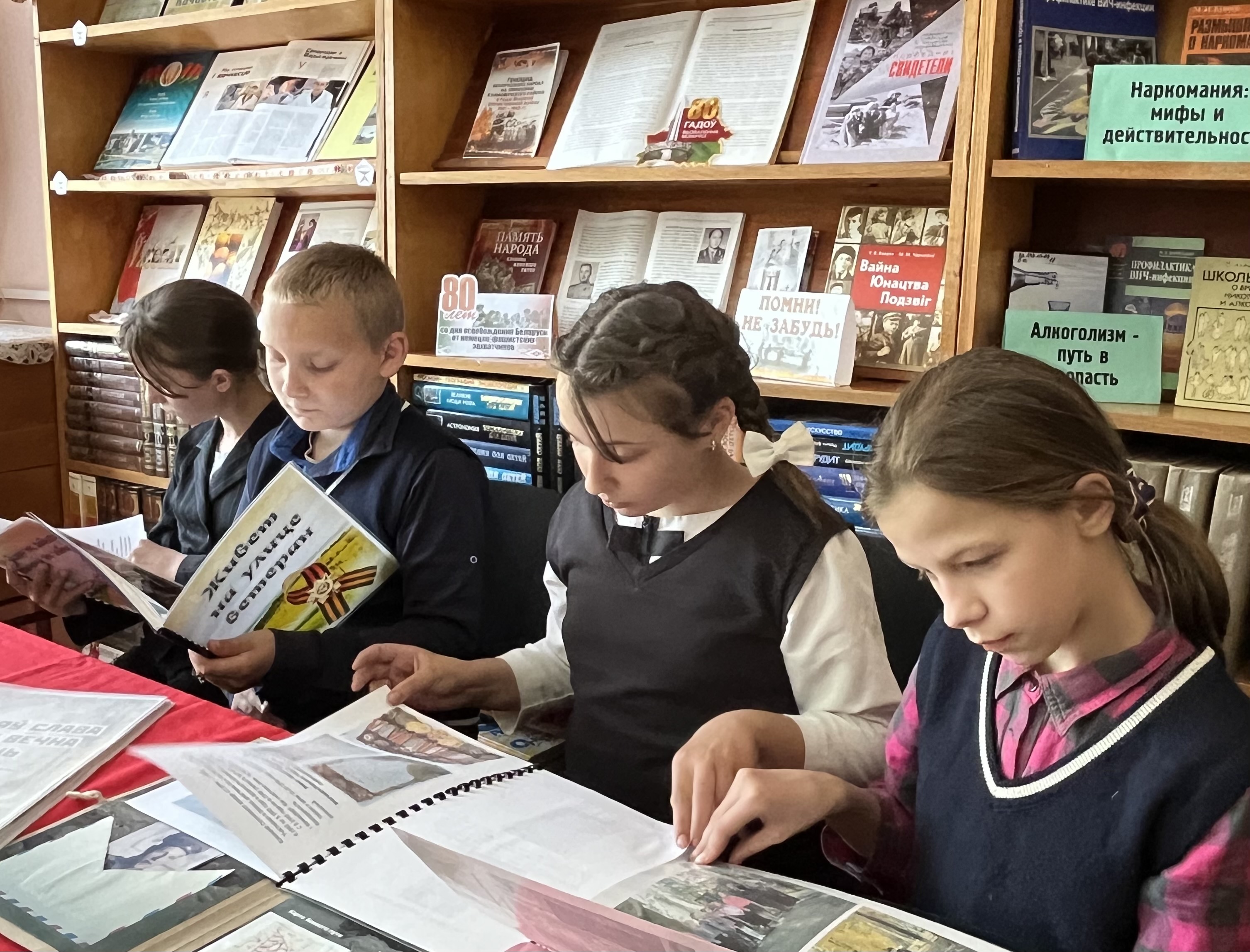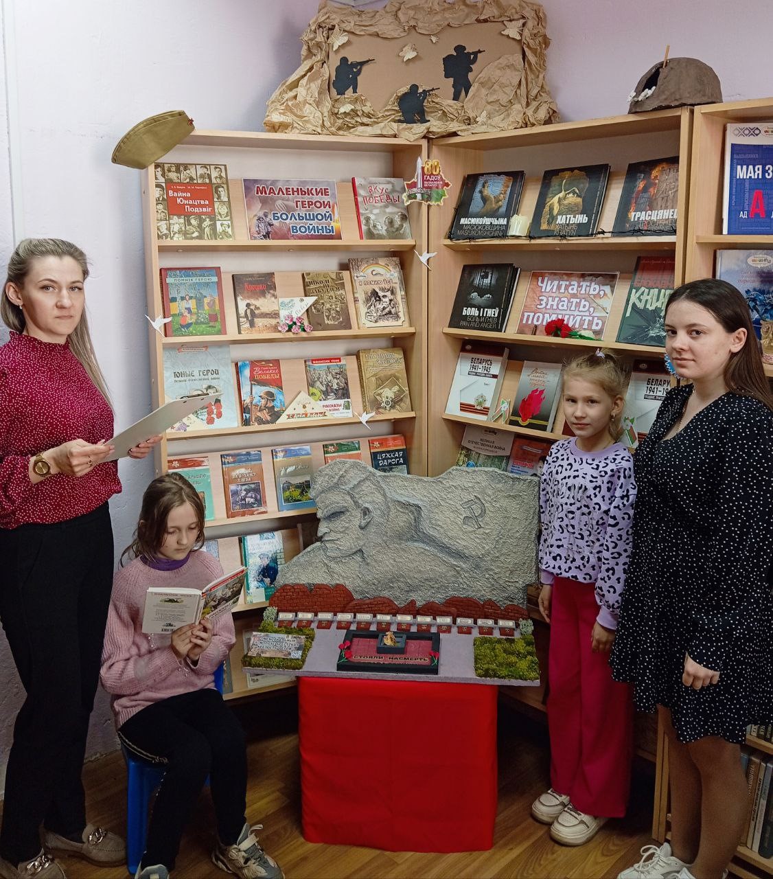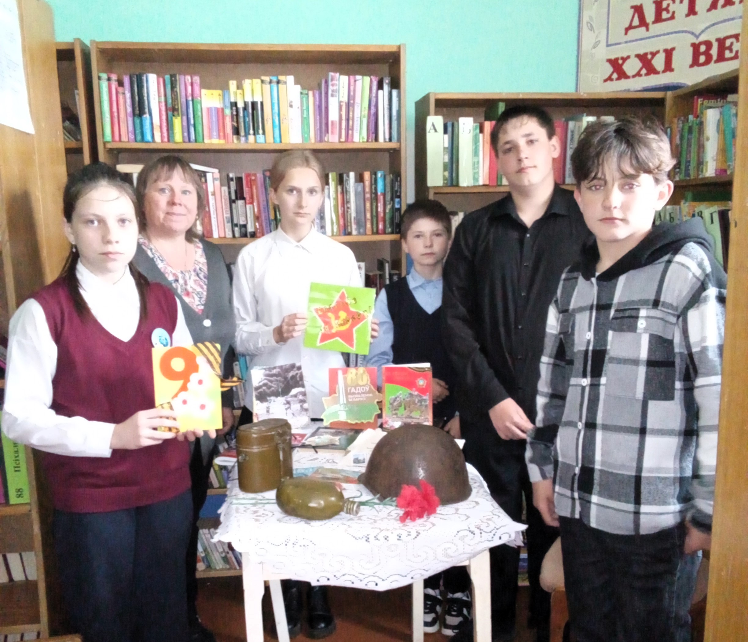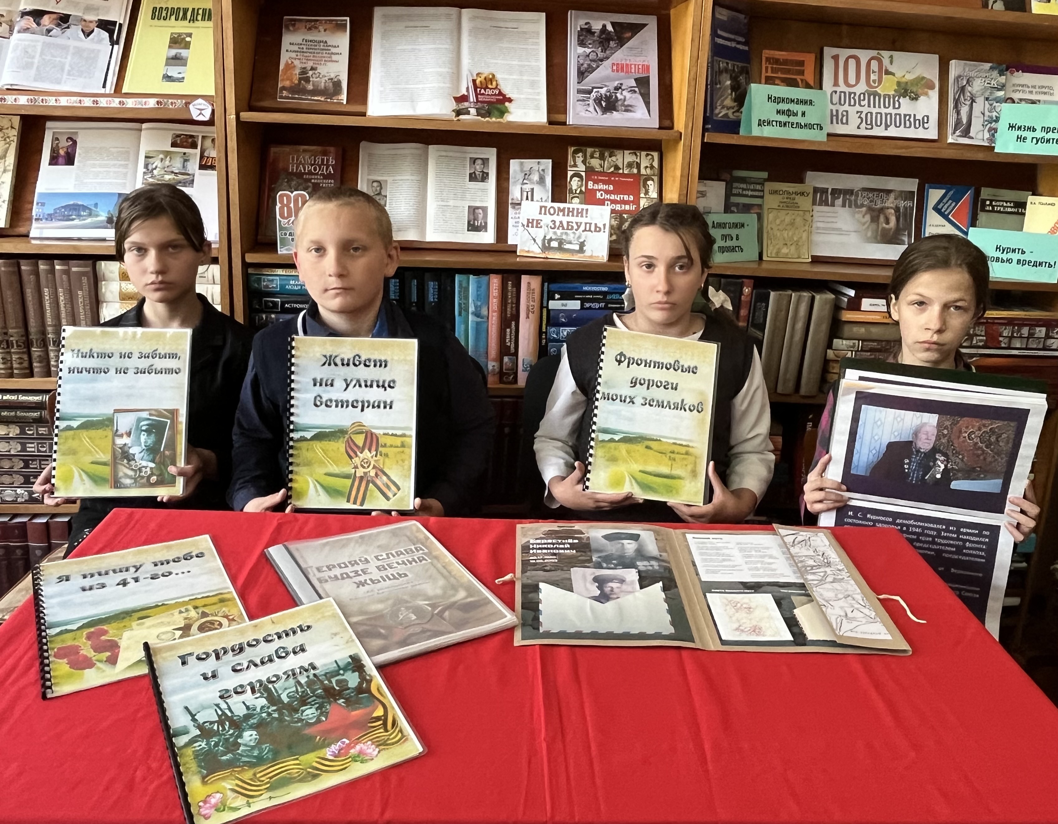Для юных читателей библиотечного пункта библиотекарь провела час памяти «Остался в сердце вечный след войны». Ребята с интересом слушали рассказ о героях и их подвигах на полях сражений, о стойкости тружеников тыла, о том какой ценой досталась Победа нашему народу. Учащиеся познакомились с художественными произведениями писателей- фронтовиков, которые сами прошли дорогами войны, были участниками битв и сражений и все пережитое в самой страшной войне рассказали в своих произведениях.