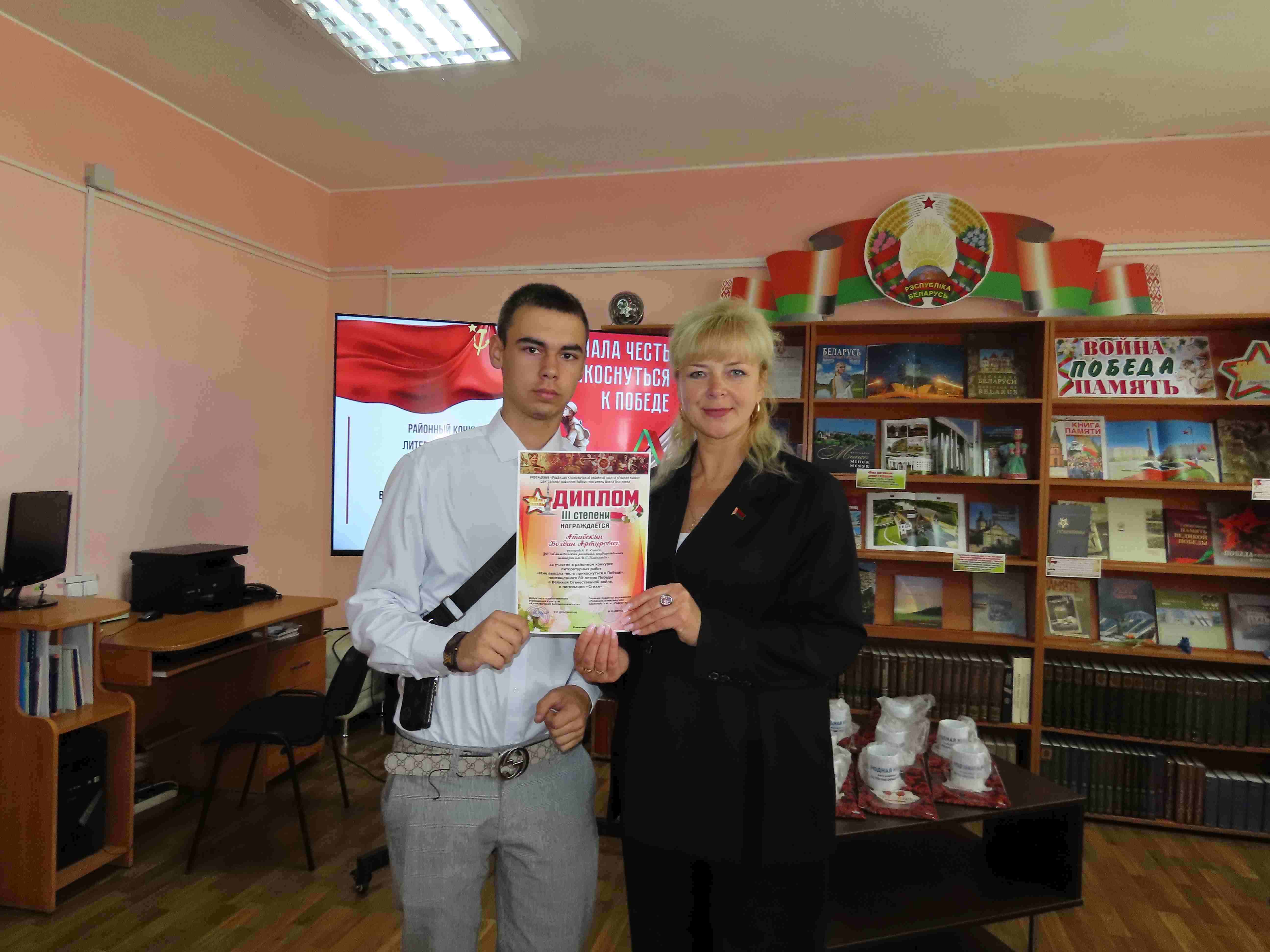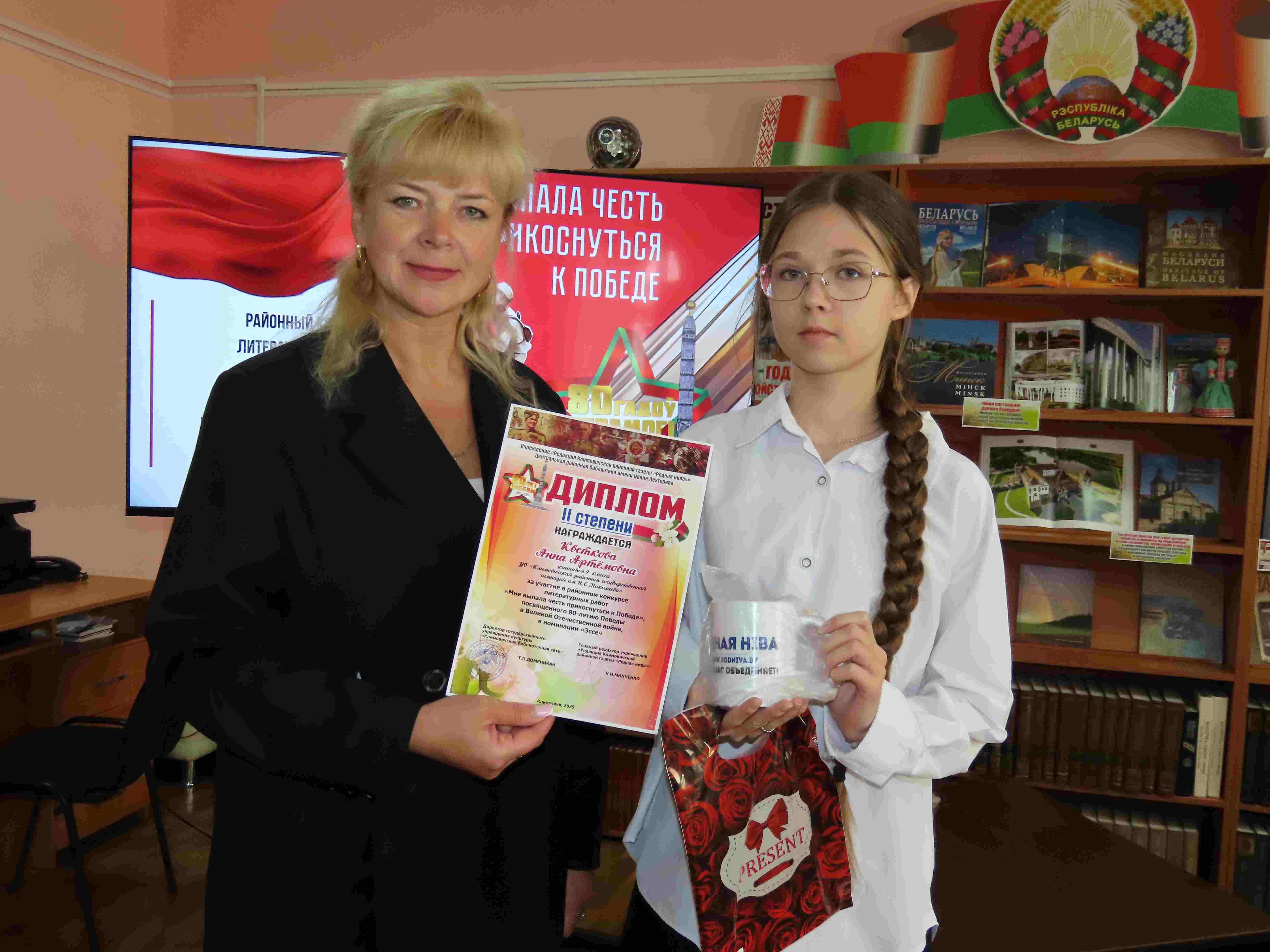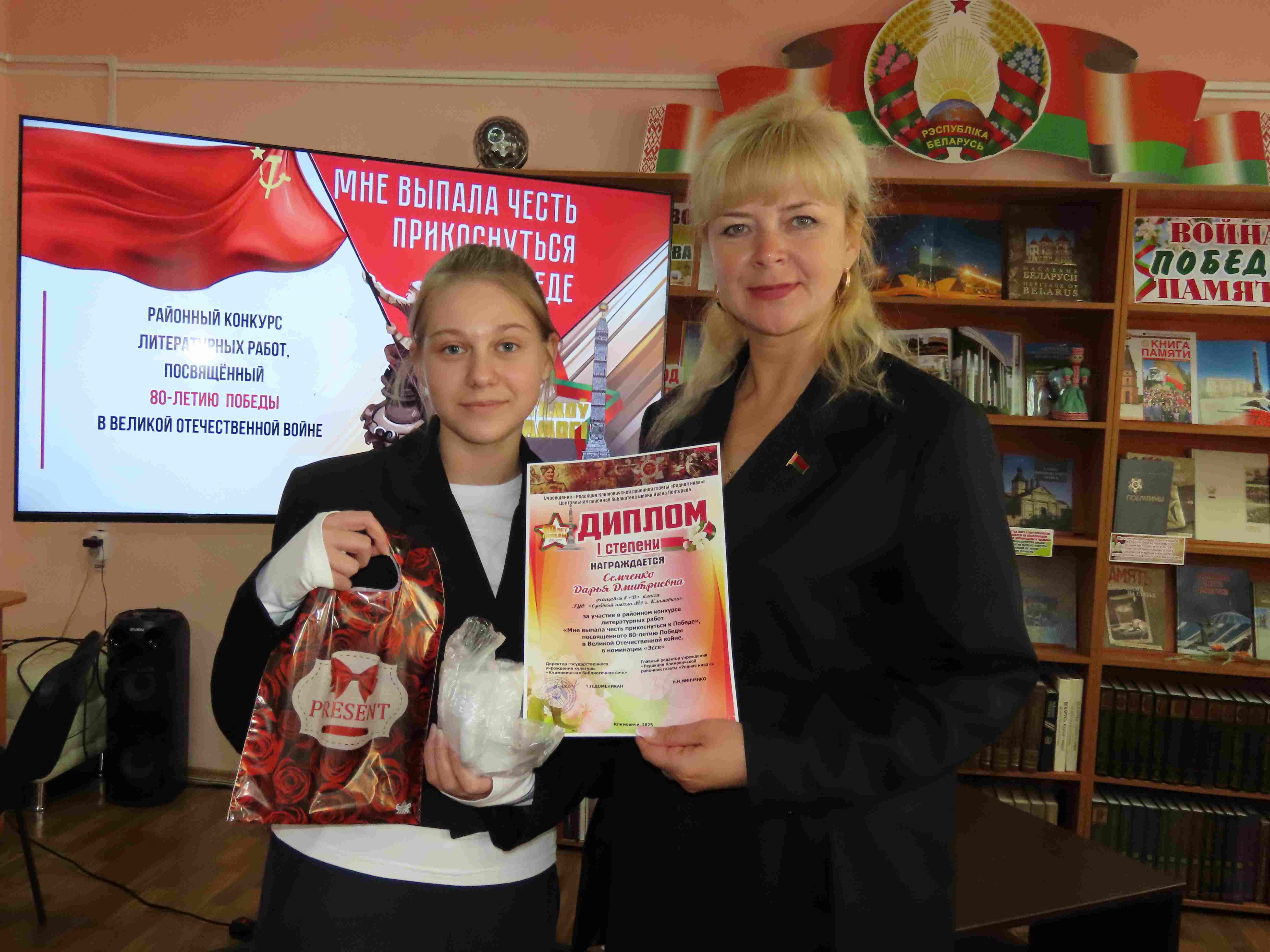 Награды за первое место получили учащийся Роднянской средней школы Данила Тупицын и учащаяся средней школы № 3 Дарья Семченко, которые представили прекрасные эссе о своих родственниках. В старшей возрастной категории первого места за эссе удостоен также Петр Шутов.