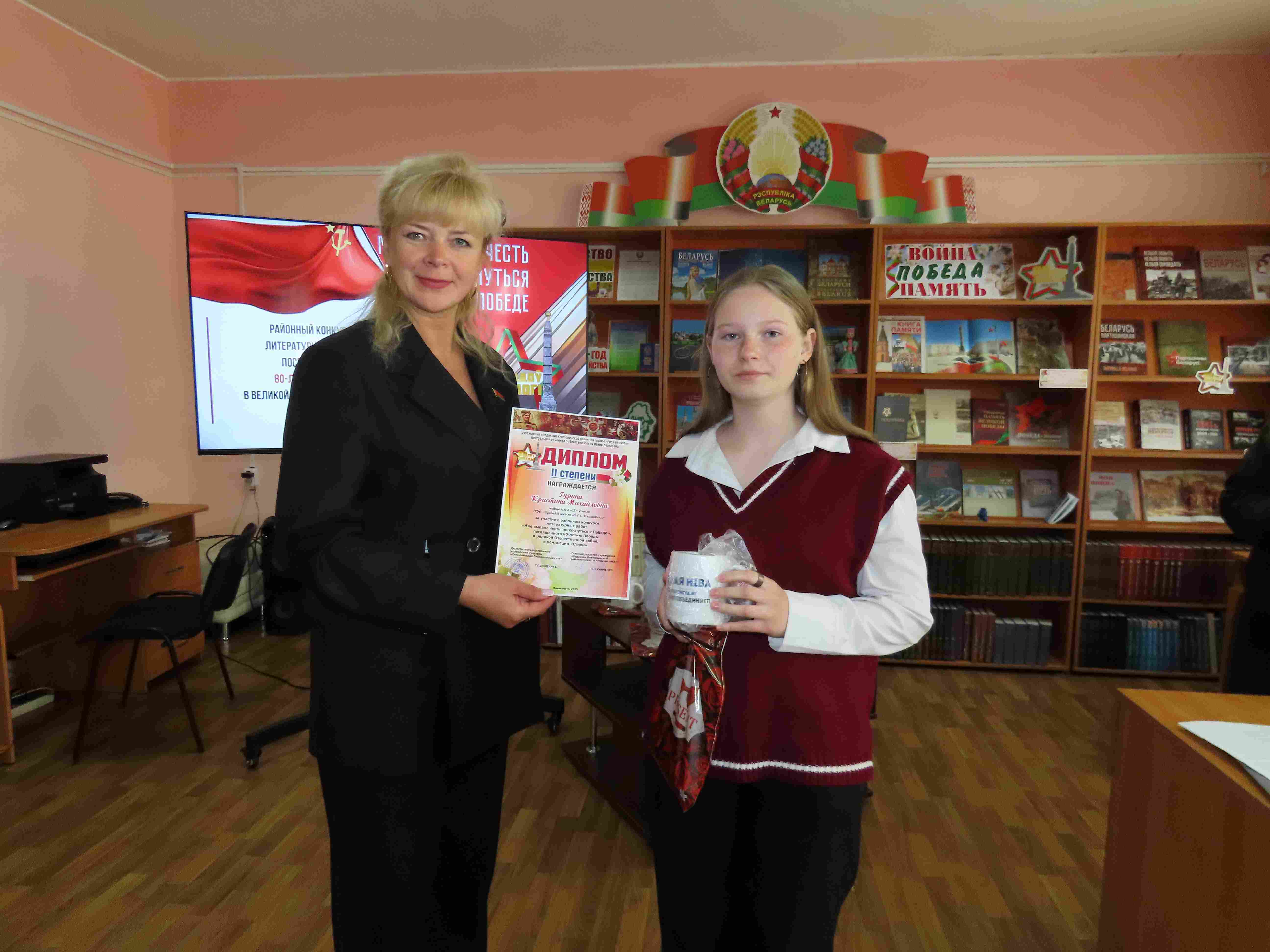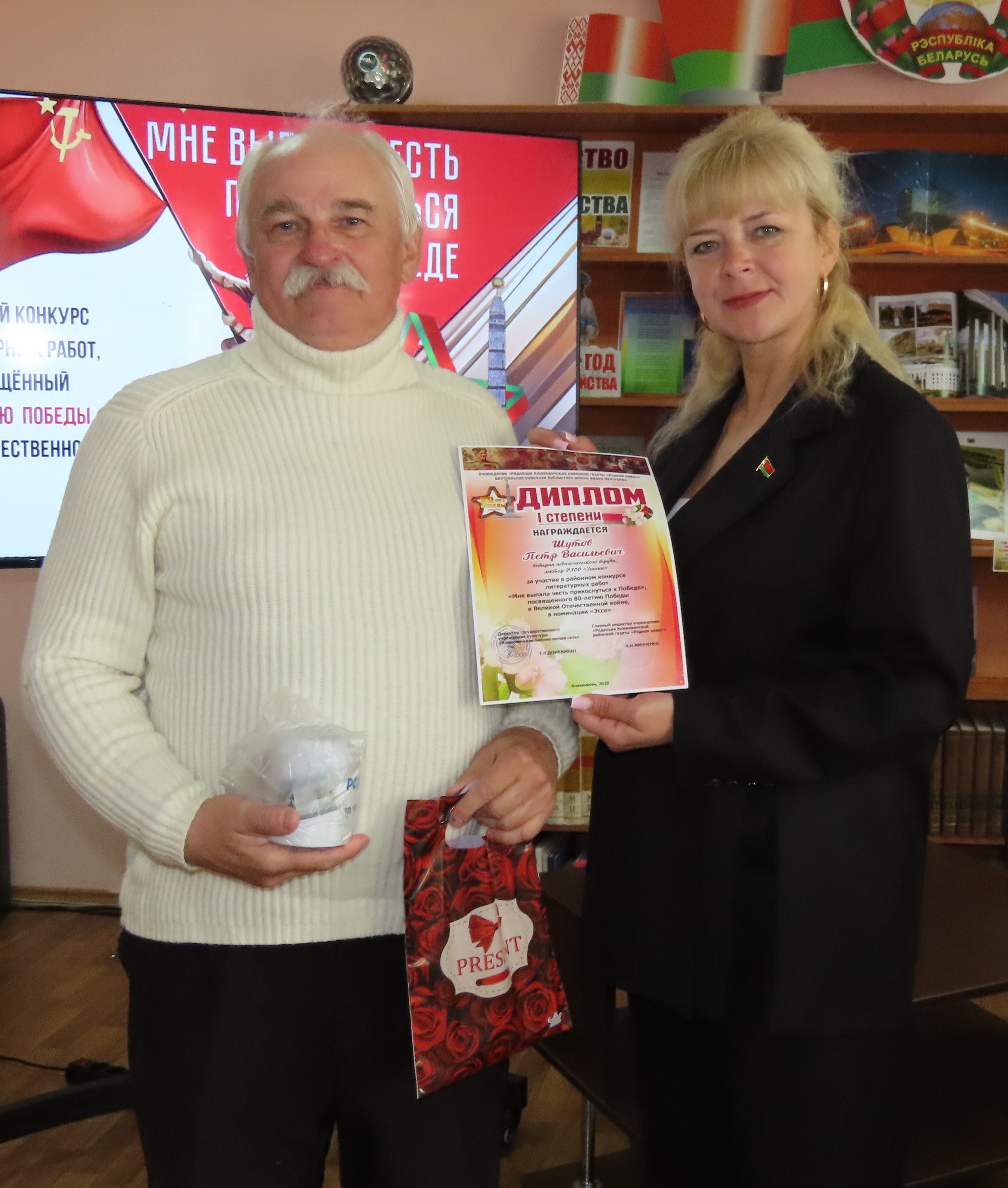 Директор ГУК «Климовичская библиотечная сеть» Татьяна Петровна Доменикан поблагодарила участников за интересные работы и вручила дипломы и подарки организаторов конкурса. Галина Викторовна Цыганкова, корреспондент районной газеты «Родная нива», поэтесса говорила о значении Дня Победы, о важности помнить историю и передавать её следующим поколениям.