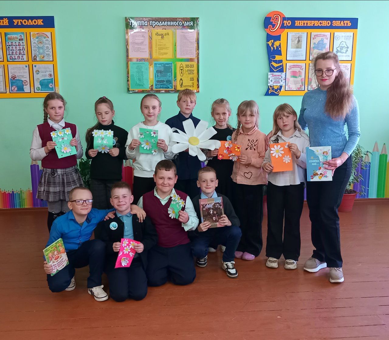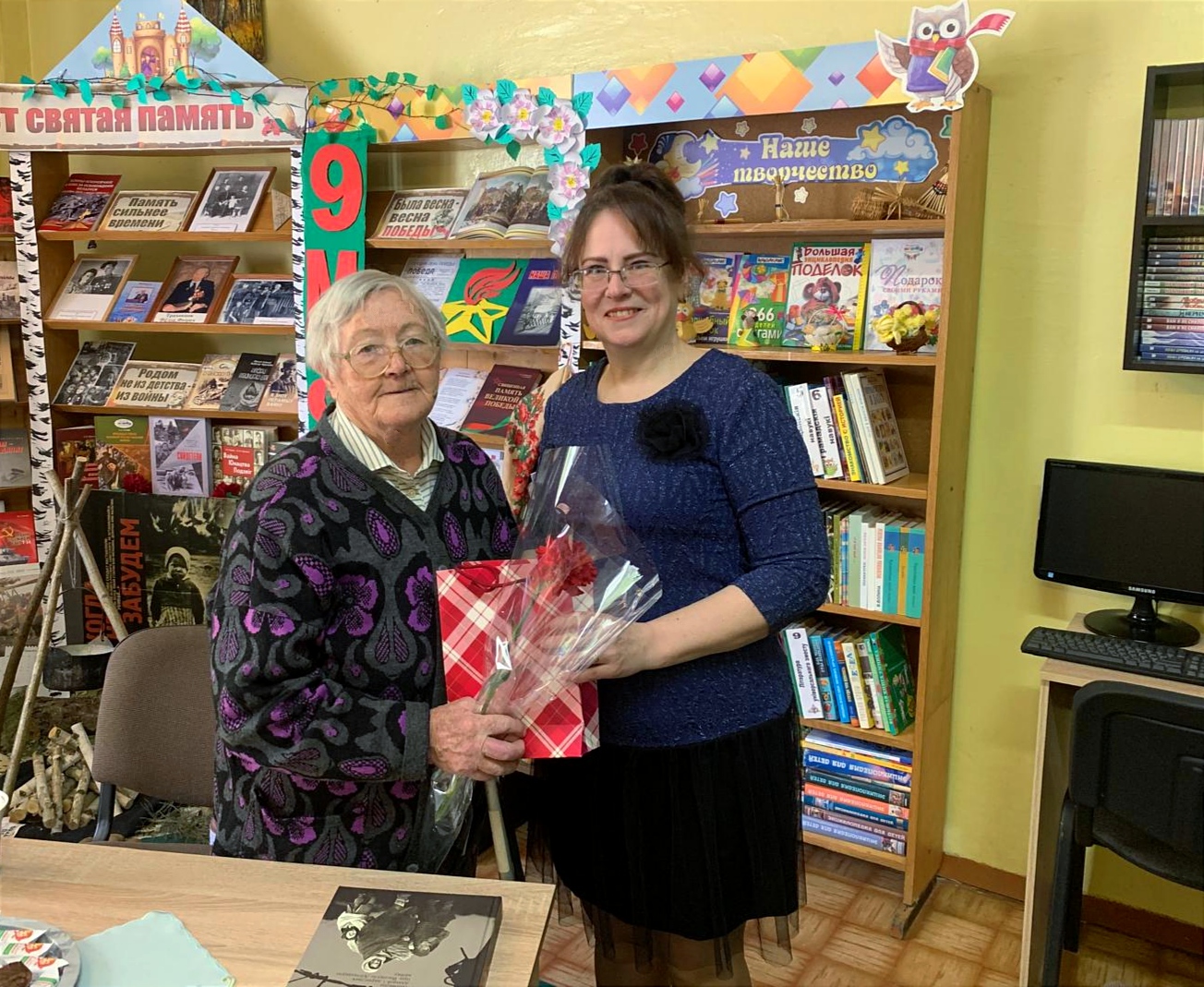 Сотрудники библиотеки вручили Алимпиаде Тихоновне цветы и сладкий подарок в знак уважения и поздравили с наступающим Днём Победы.