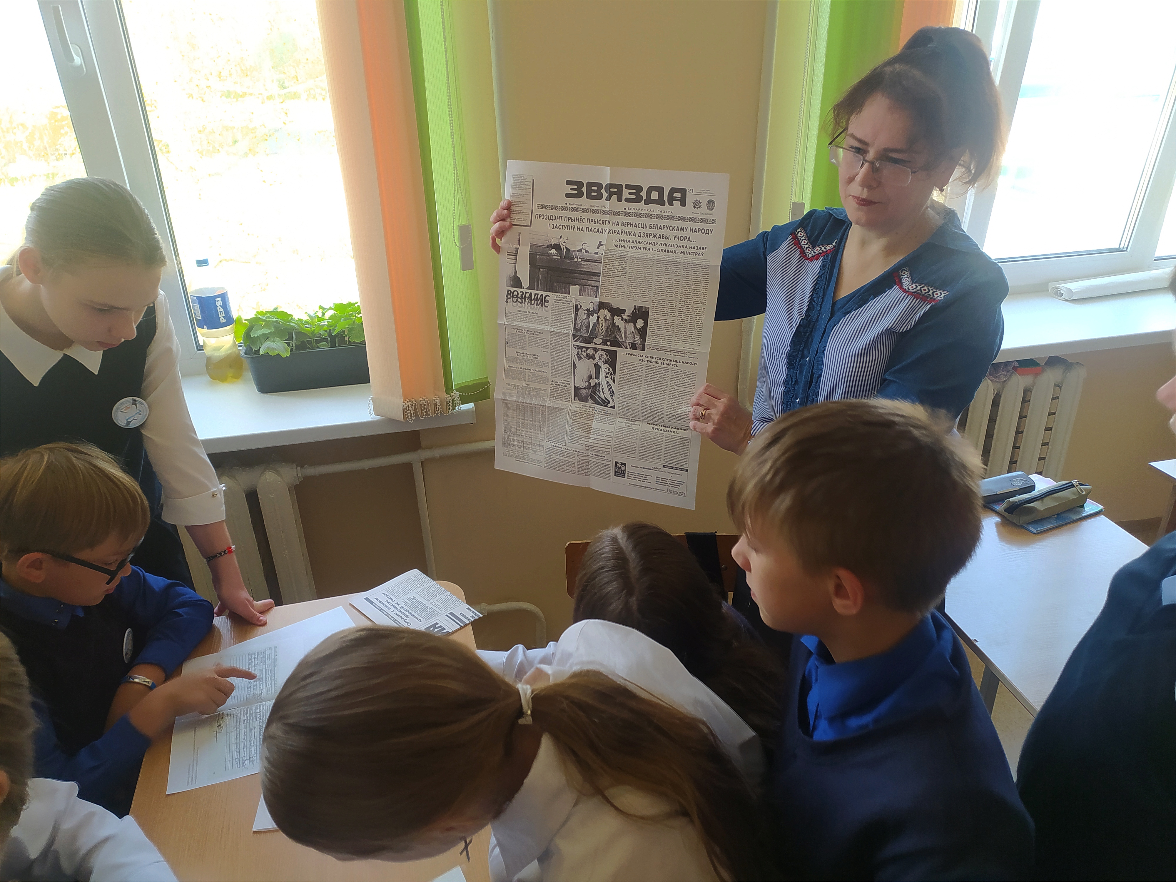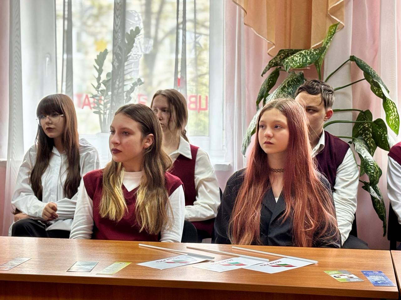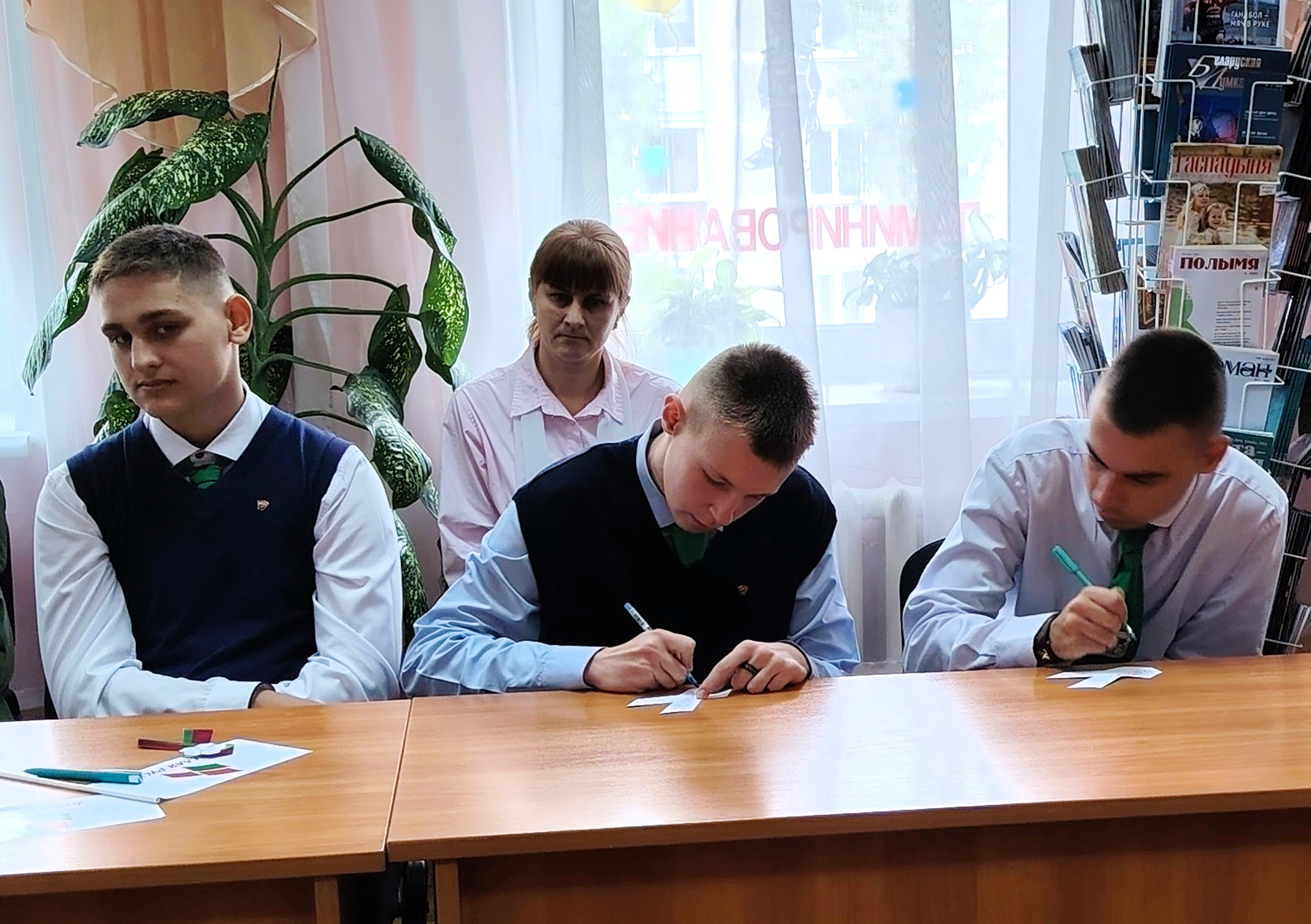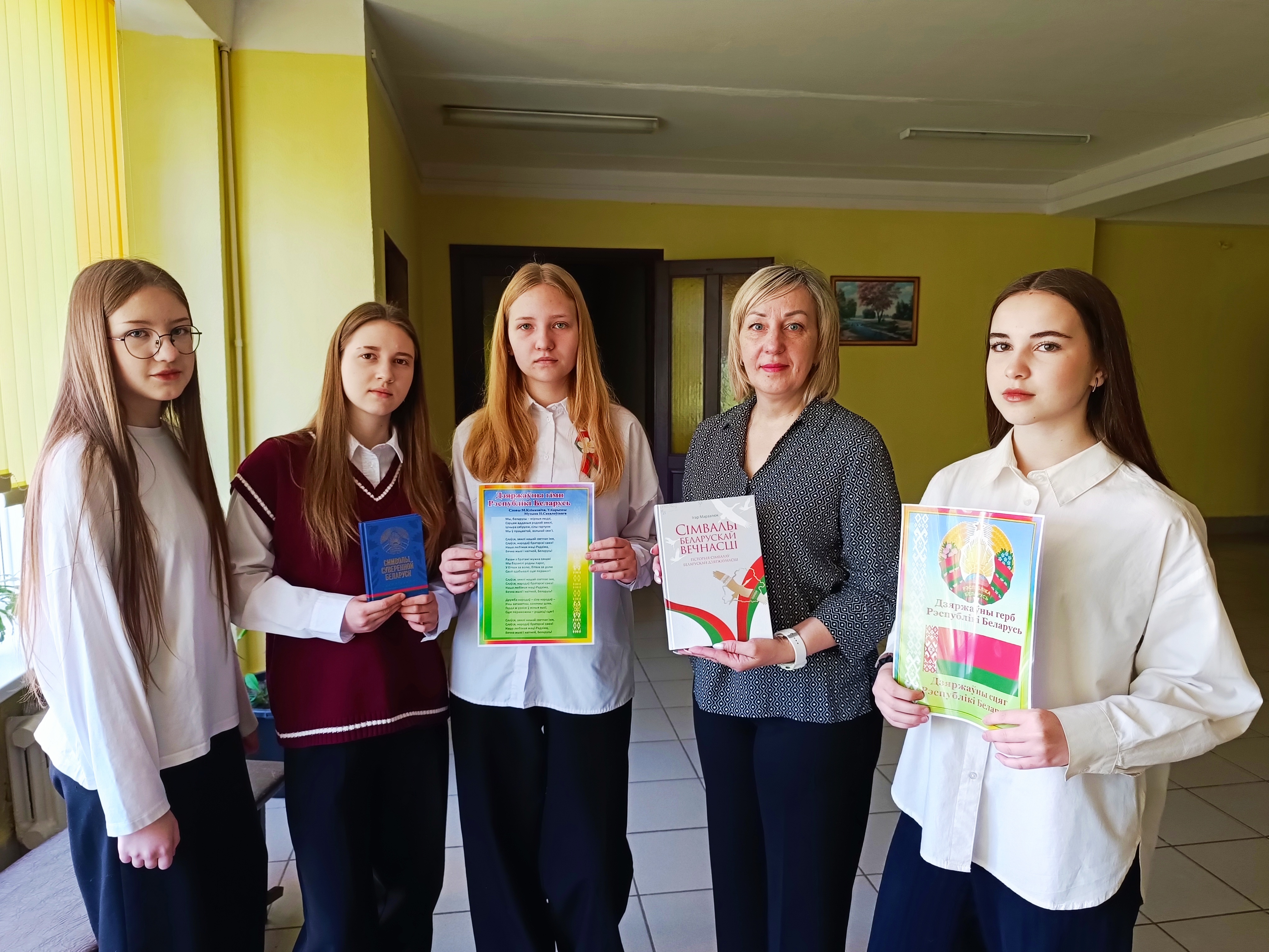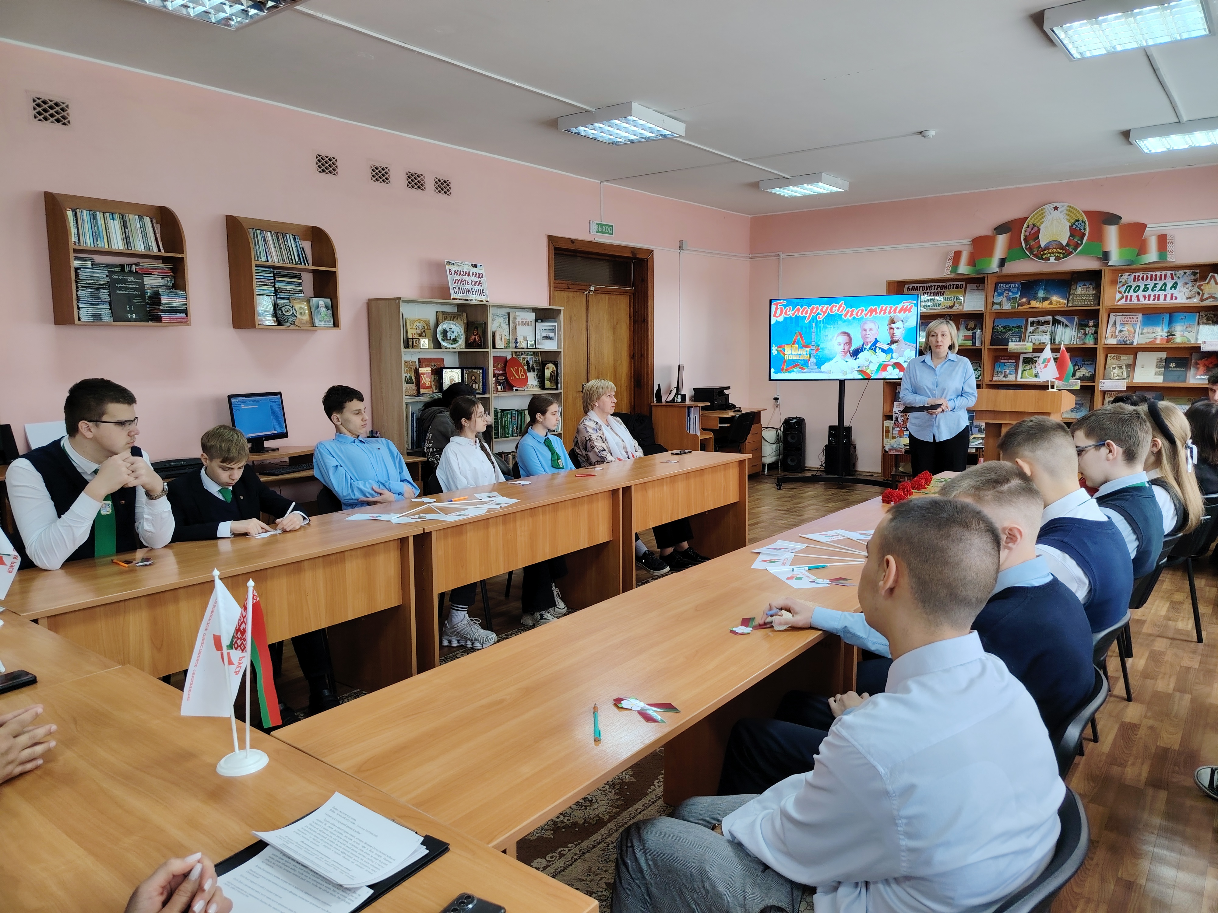 Сотрудники центральной районной библиотеки для учащихся 9 класса средней школы № 3 провели информационную минутку «Герб, флаг и гимн — символы государственного суверенитета». Заведующий отделом обслуживания и информации Ольга Максимович рассказала ребятам о государственных символах и почему они важны для каждого государства, а также, используя книги из фонда центральной районной библиотеки, познакомила ребят с историей флага, герба и гимна нашей Родины.