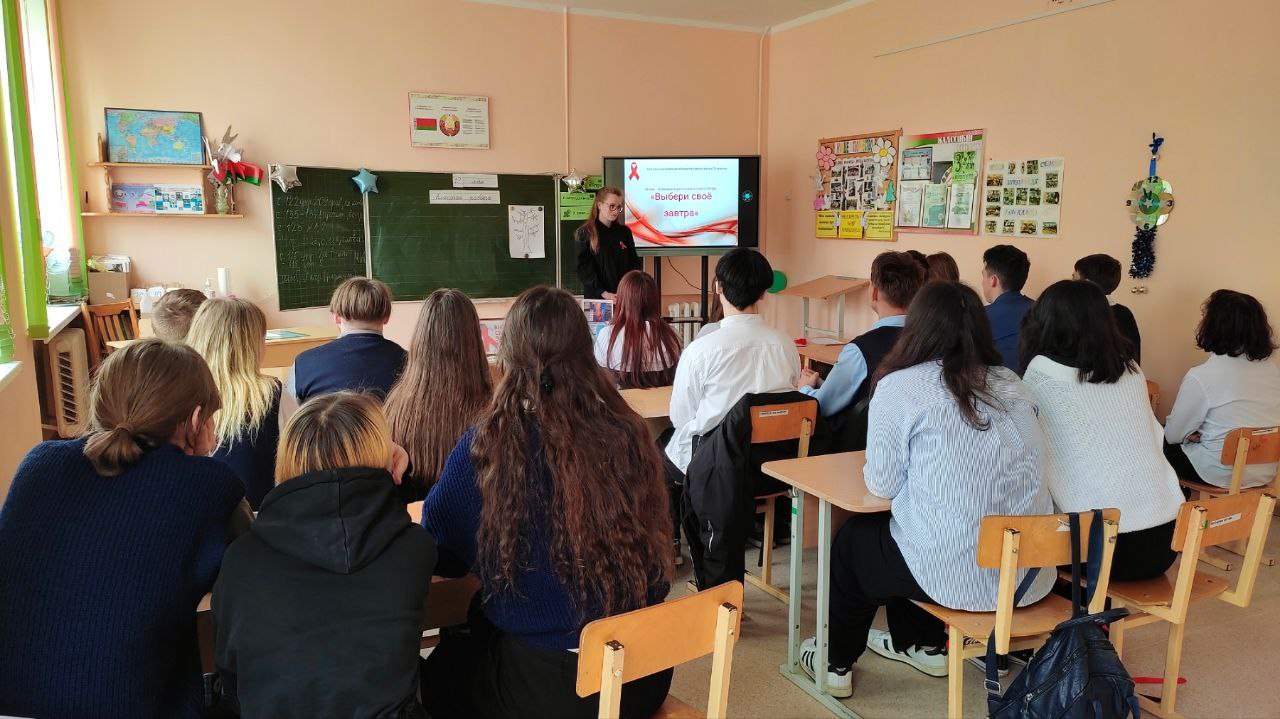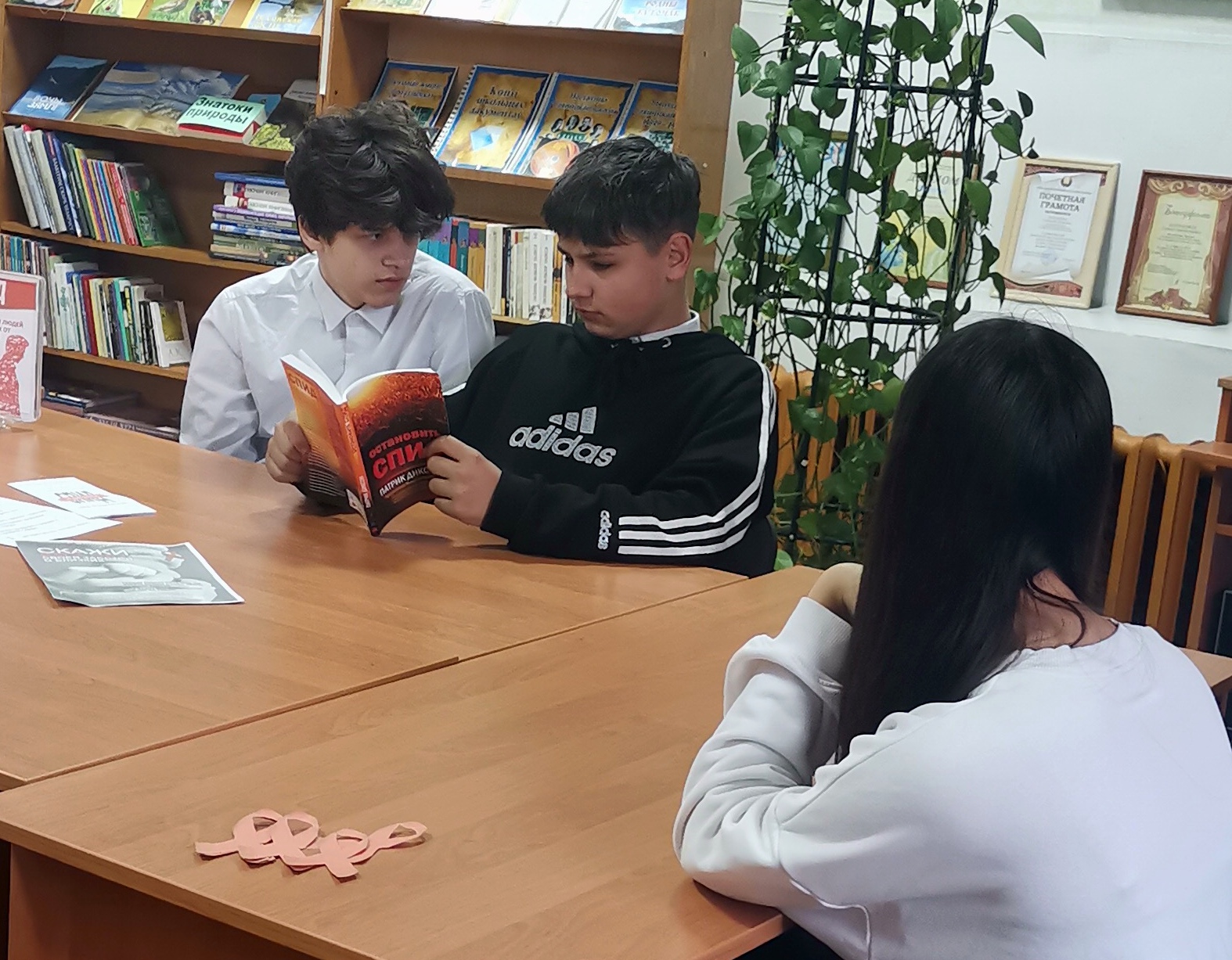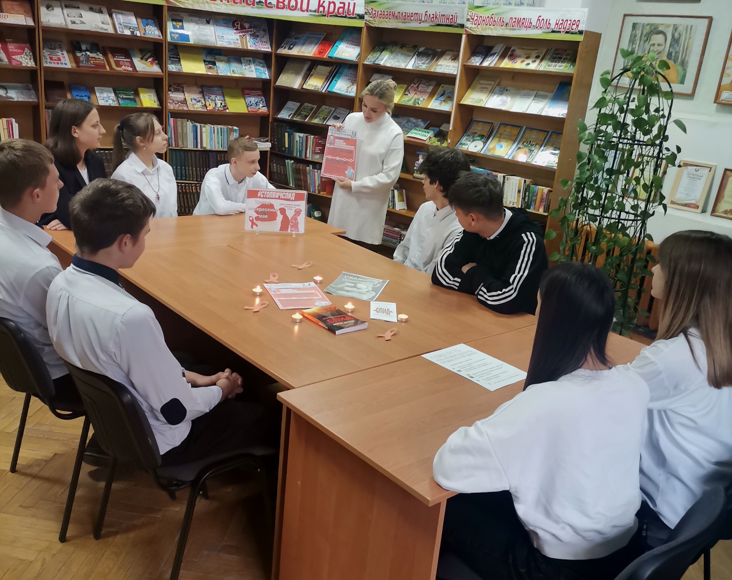 Сотрудники детско-юношеского сектора центральной библиотеки для учащихся десятых классов средней школы № 4 провели урок здоровья «Выбери своё завтра». Библиотекарь рассказала учащимся о причинах распространения СПИДа, путях передачи и стадиях ВИЧ-инфекции, об известных людях, умерших от этой болезни. Закрепить полученные знания подростки смогли, отвечая на вопросы викторин «Степень риска» и «Цепная реакция». Каждому участнику мероприятия вручили красную ленточку, которую они крепили на стенд в знак памяти, сострадания, поддержки и надежды на будущее без СПИДа. В завершении ребята посмотрели тематический видеоролик «ВИЧ: знать, чтобы жить».