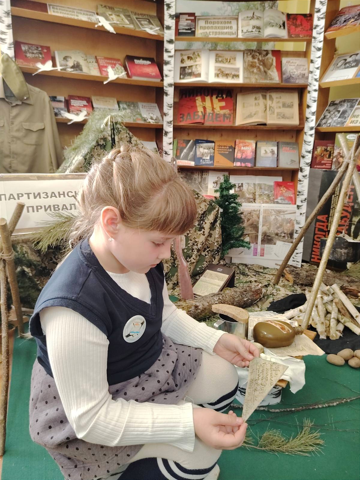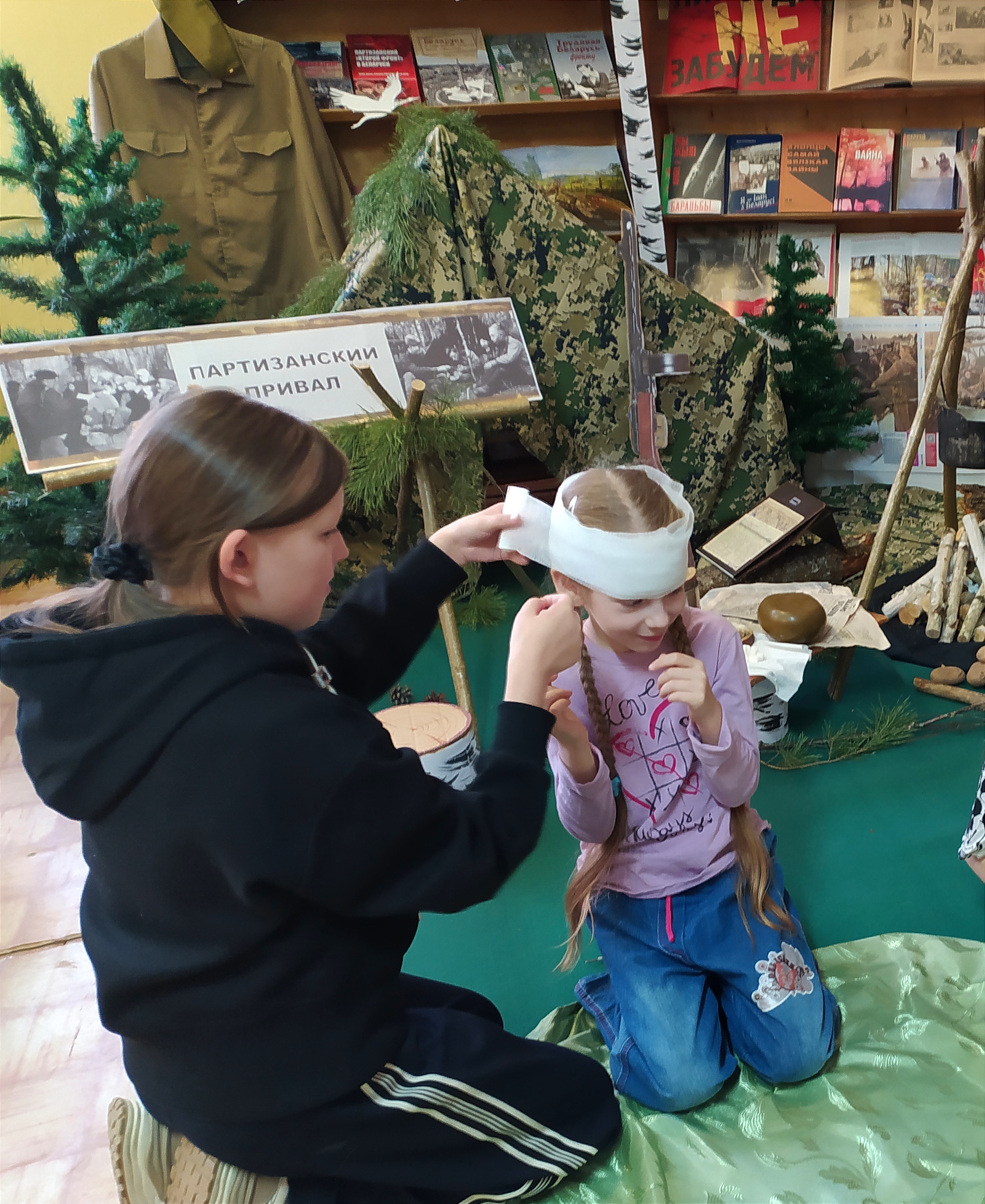 Для своих юных читателей библиотекари городской библиотеки №1 провели литературно-исторический экскурс «В лесу прифронтовом». Ребята окунулись в дух той военной поры, попробовали партизанский паёк, спели солдатские песни, вспомнили стихи, побыли в роли военых медсестер, просмотрели книги военной тематики.