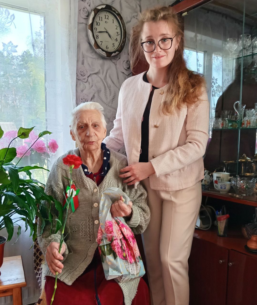 Крыжевич Мария Семёновна, несмотря на свой почтенный возраст, по-прежнему жизнерадостна и полна оптимизма. Сотрудники детско-юношеского сектора вручили Марии Семёновне цветы и сладкий подарок в знак уважения и признания, за её нелёгкий труд во время войны и в мирное время.