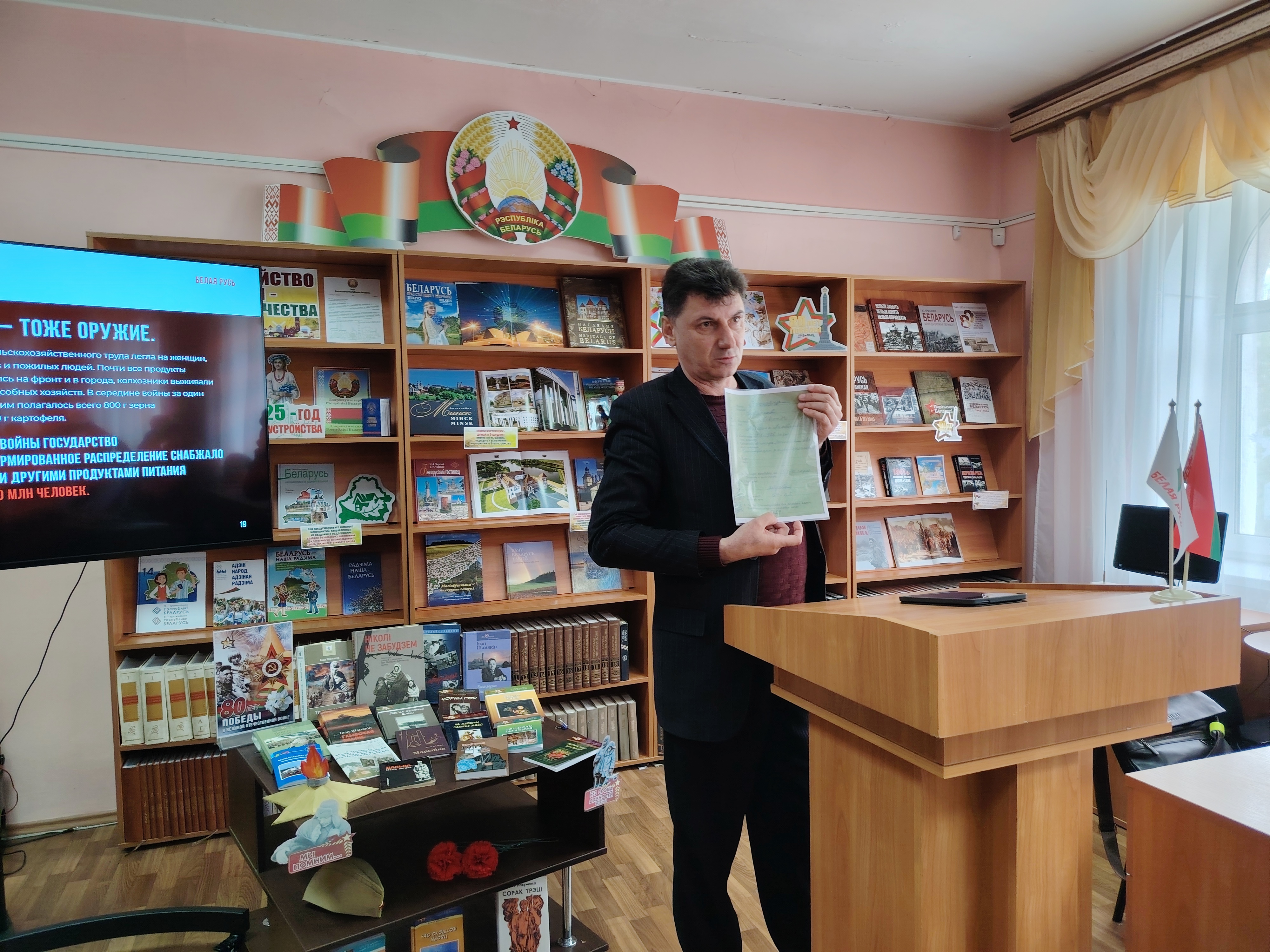 Заведующий отделом обслуживания и информации Ольга Максимович провела обзор новой социально-значимой литературы, которая рассказывает о беззаветном героизме белорусского народа, о подвигах совершенных во имя Родины, во имя Победы.