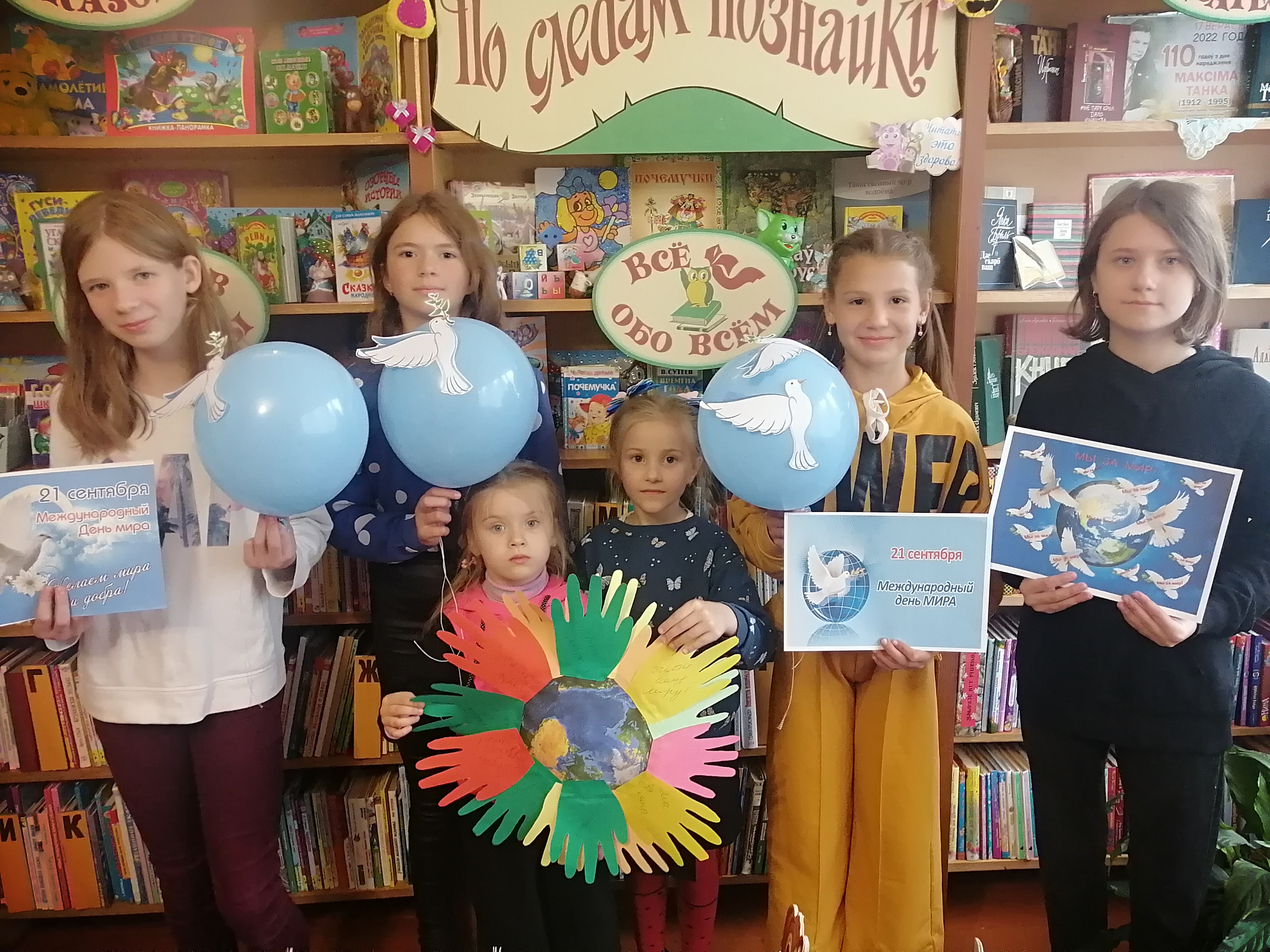 В городской библиотеке №2 прошел урок мира «День мира – праздник всей Земли». Ребята говорили о таких понятиях, как война, мир, дружба, доброта и что нужно сделать, чтобы всегда был мир на нашей планете. Участники мероприятия вырезали из бумаги голубей, чтобы прикрепить его на воздушный шар, а потом поднять их в небо. Поделки, вырезанные из ладошек, ребята прикрепили вокруг земли и дополнили фразу, что для них мир.