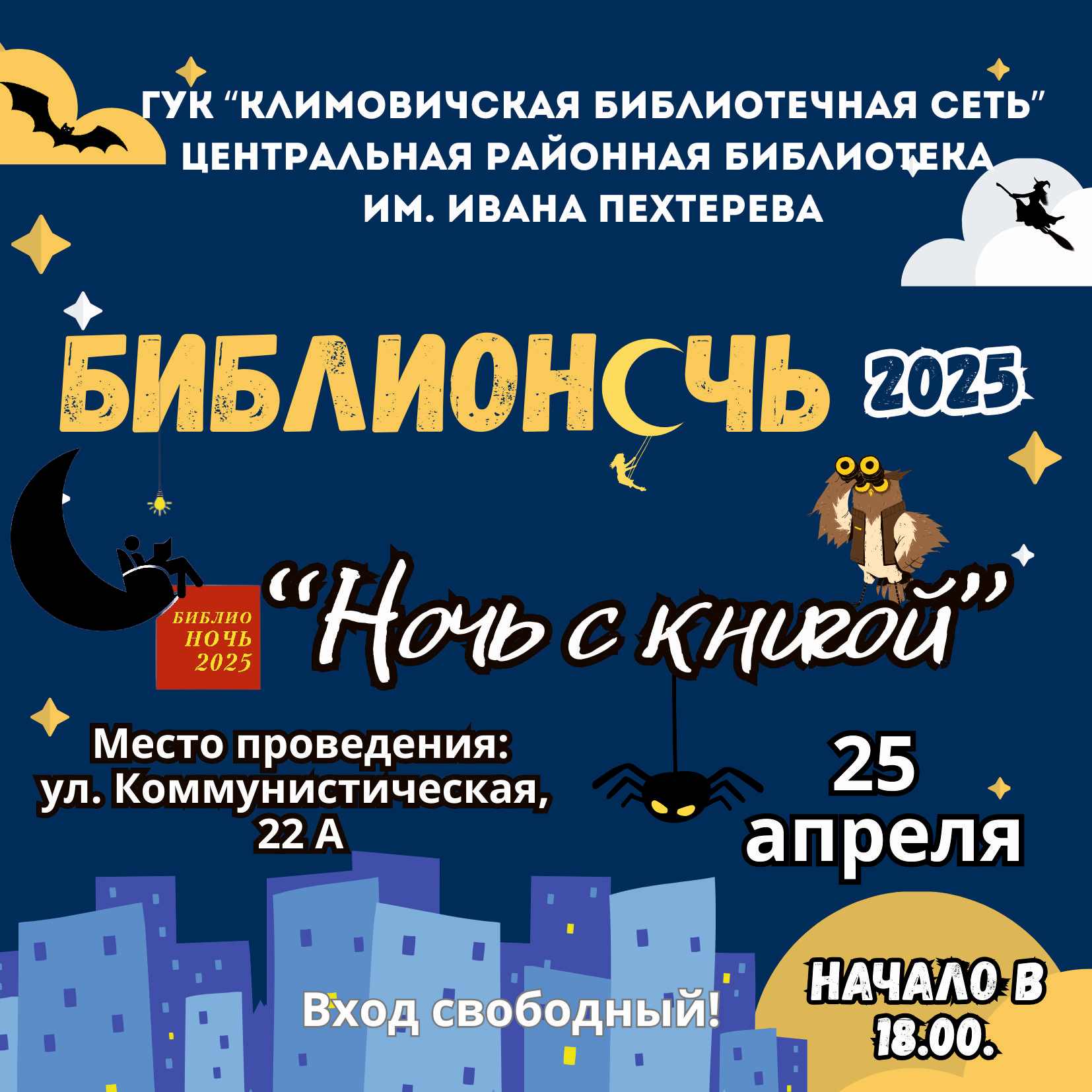 25 апреля 2025 года Климовичская центральная районная библиотека имени Ивана Пехтерева гостеприимно встречала всех жителей города на ежегодной культурно-просветительской акции в поддержку чтения «Библионочь-2025». В этом году темой знакового события для всех, кто любит читать и открывать для себя новое и неизведанное, стала «Ночь с книгой».